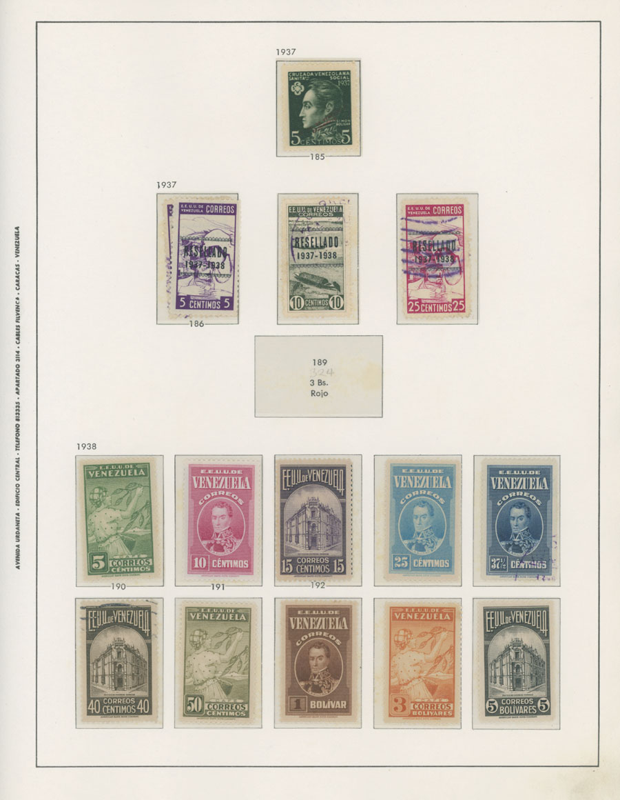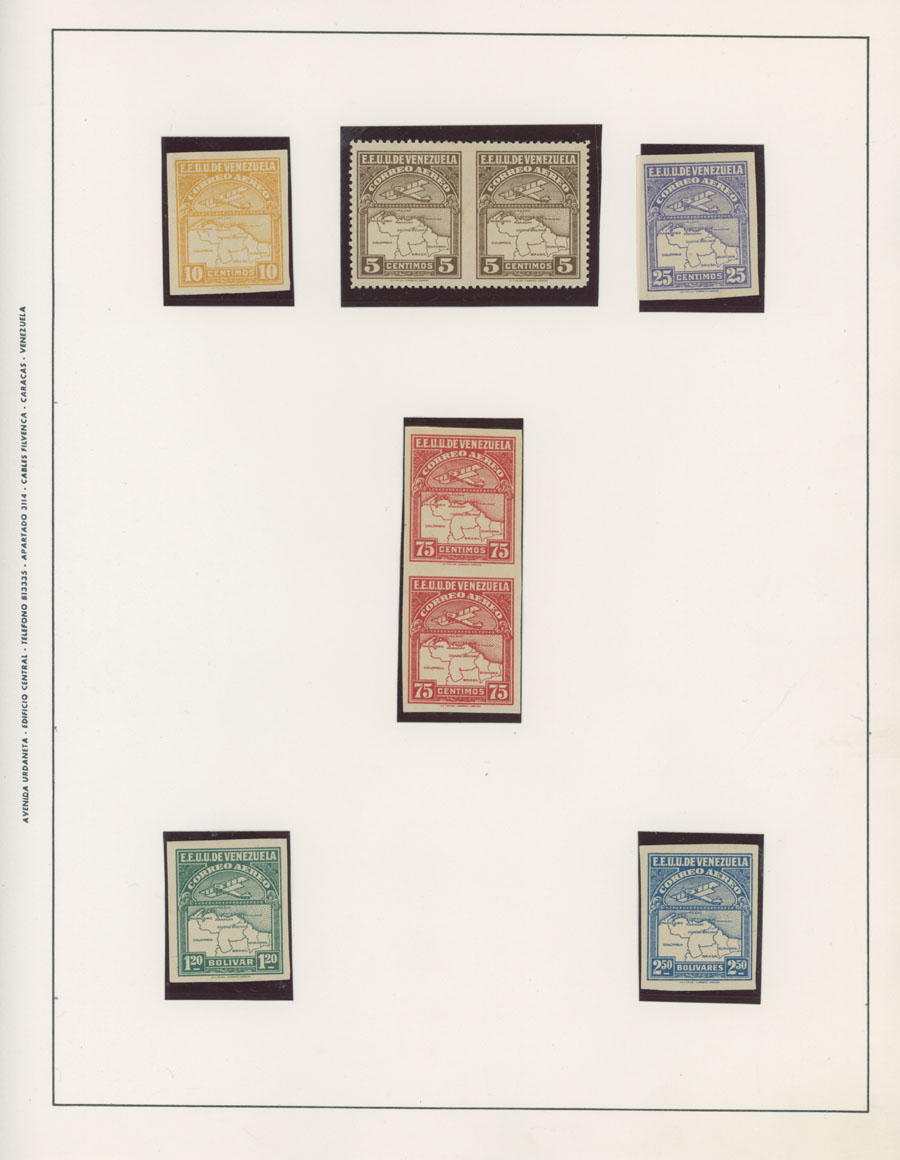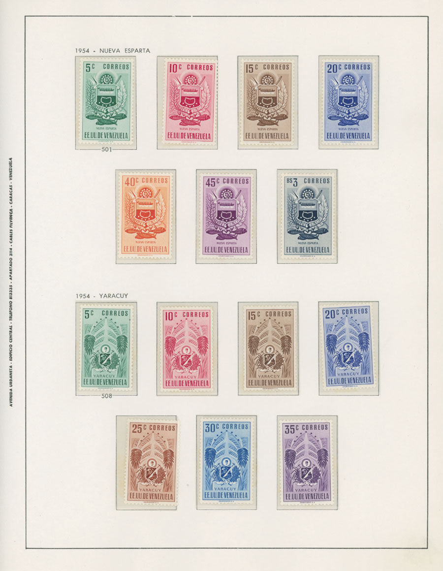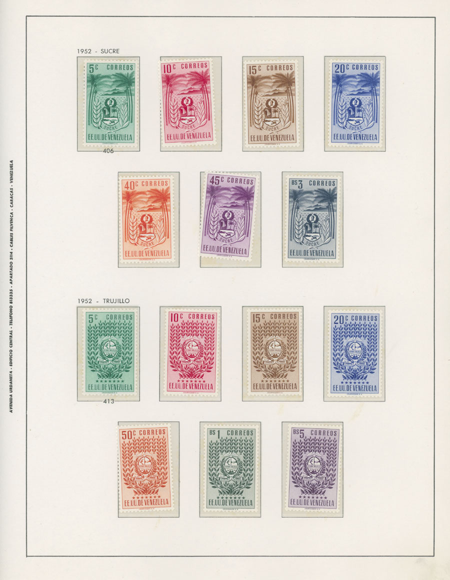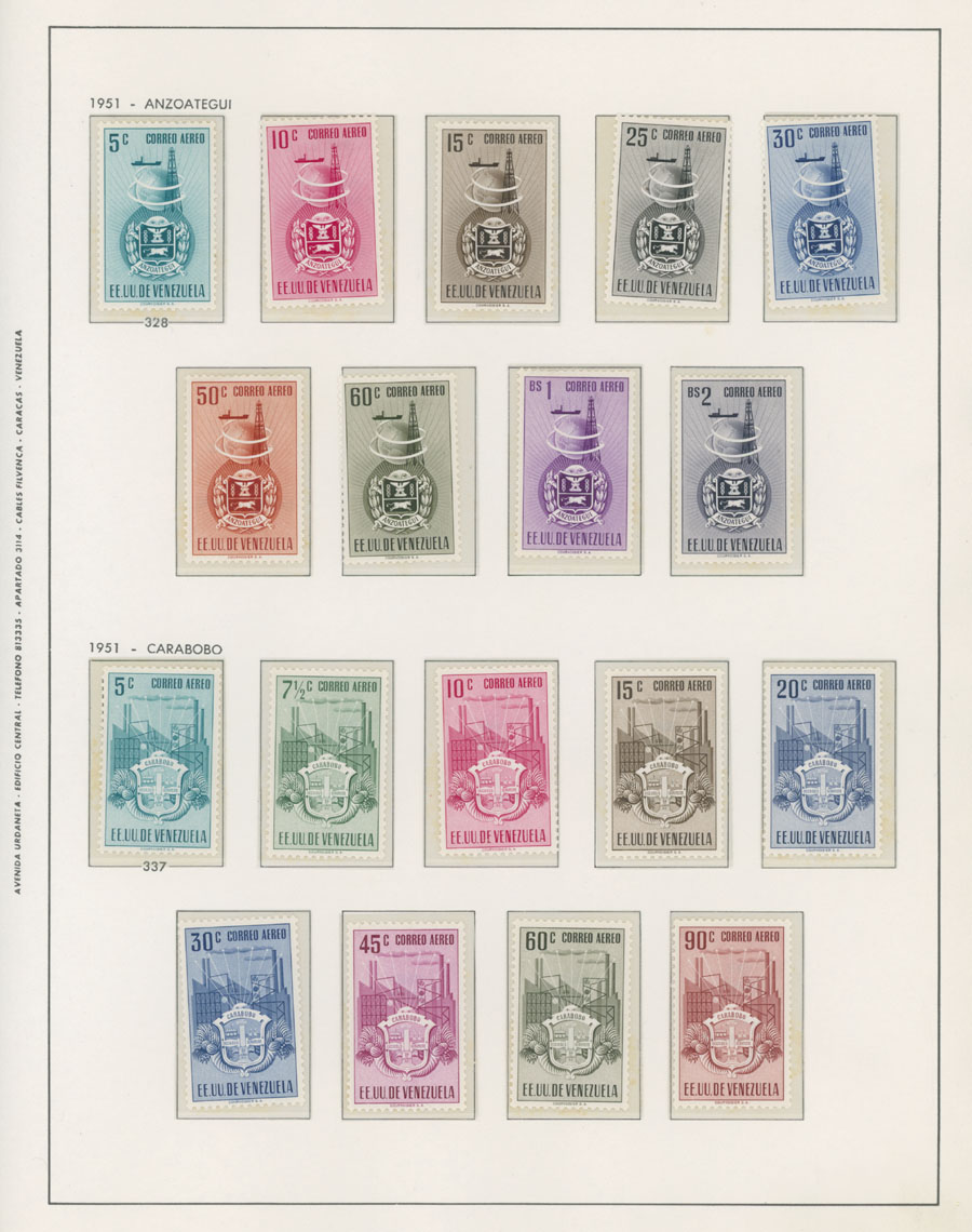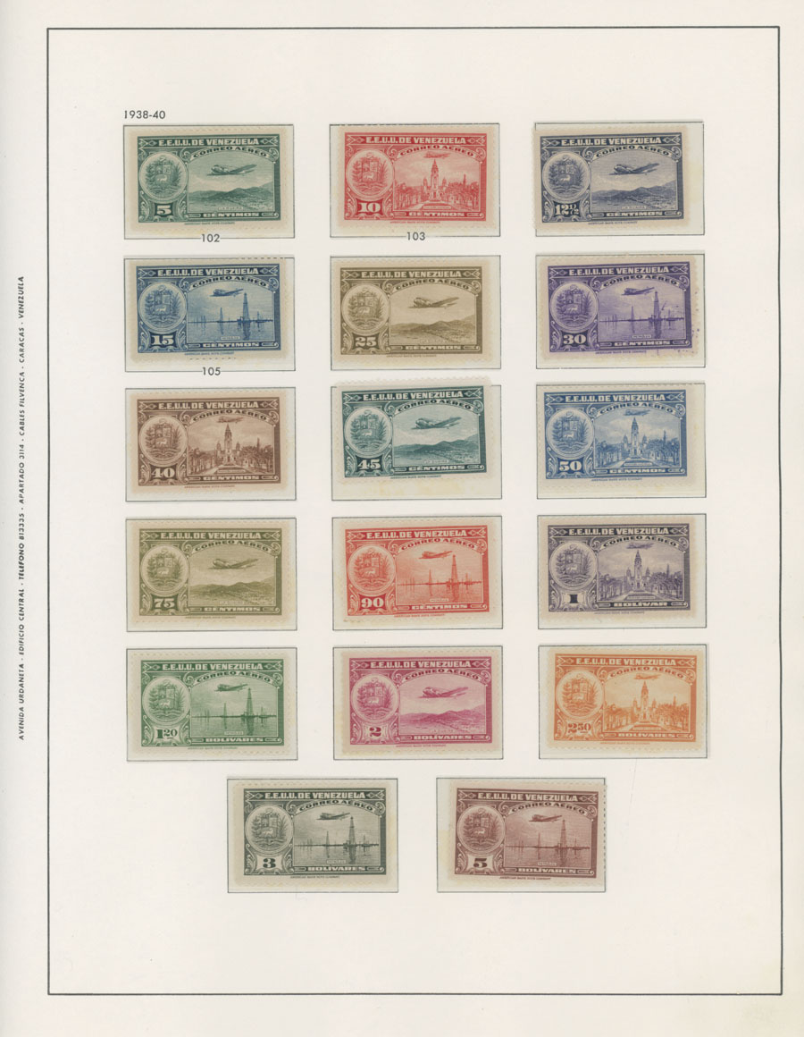 LARGE AND VALUABLE COLLECTION IN TWO LARGE ALBUMS: 1859-1984, about 2600 mostly mint stamps, 37 souvenir and miniature sheets, 15 FD covers, postage, air post and back of the book material, starting with Coat of Arms from 1859-77, then numerous Bolivar definitives, some nice perforation and printing errors, ”Provinces” long postage and air post issues, very well completed unit with some blocks of four and extra mainly classic duplicates on VARIO pages (over 300 stamps), nice collection, mainly full OG, generally LH, some NH, a few dozens used, F/VF, C.v. $14,250, including $7,400 in air post part plus about $1,500 in duplicates, Est. $2,500-$3,000