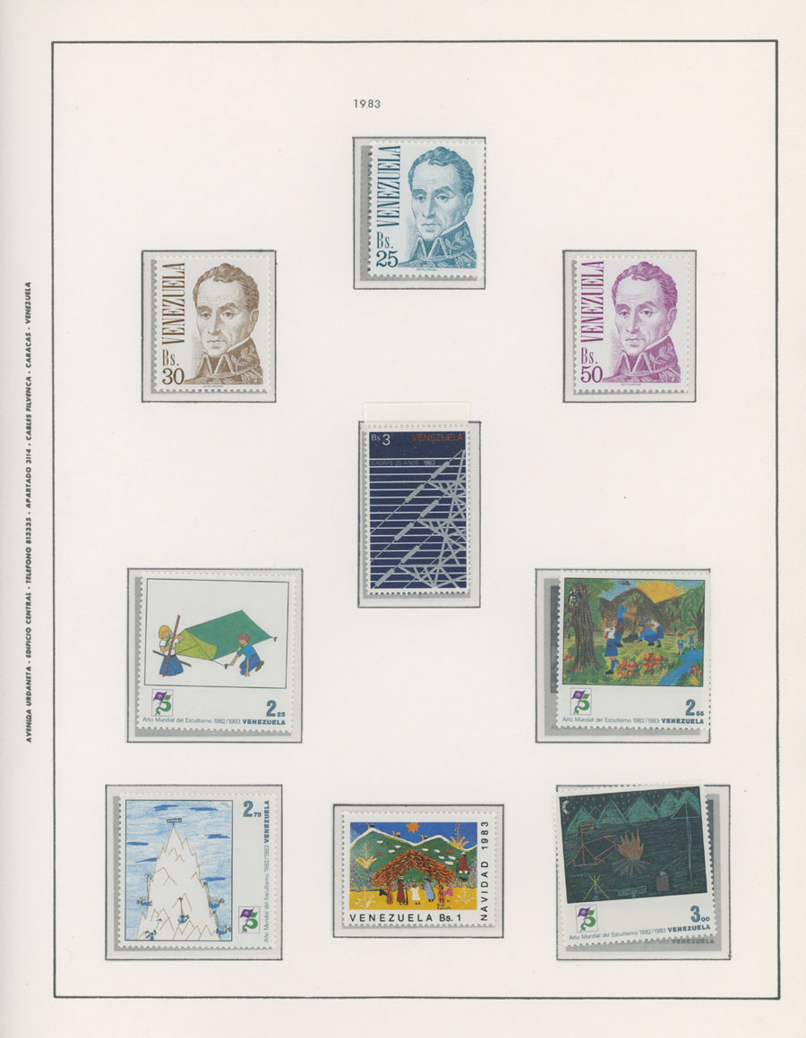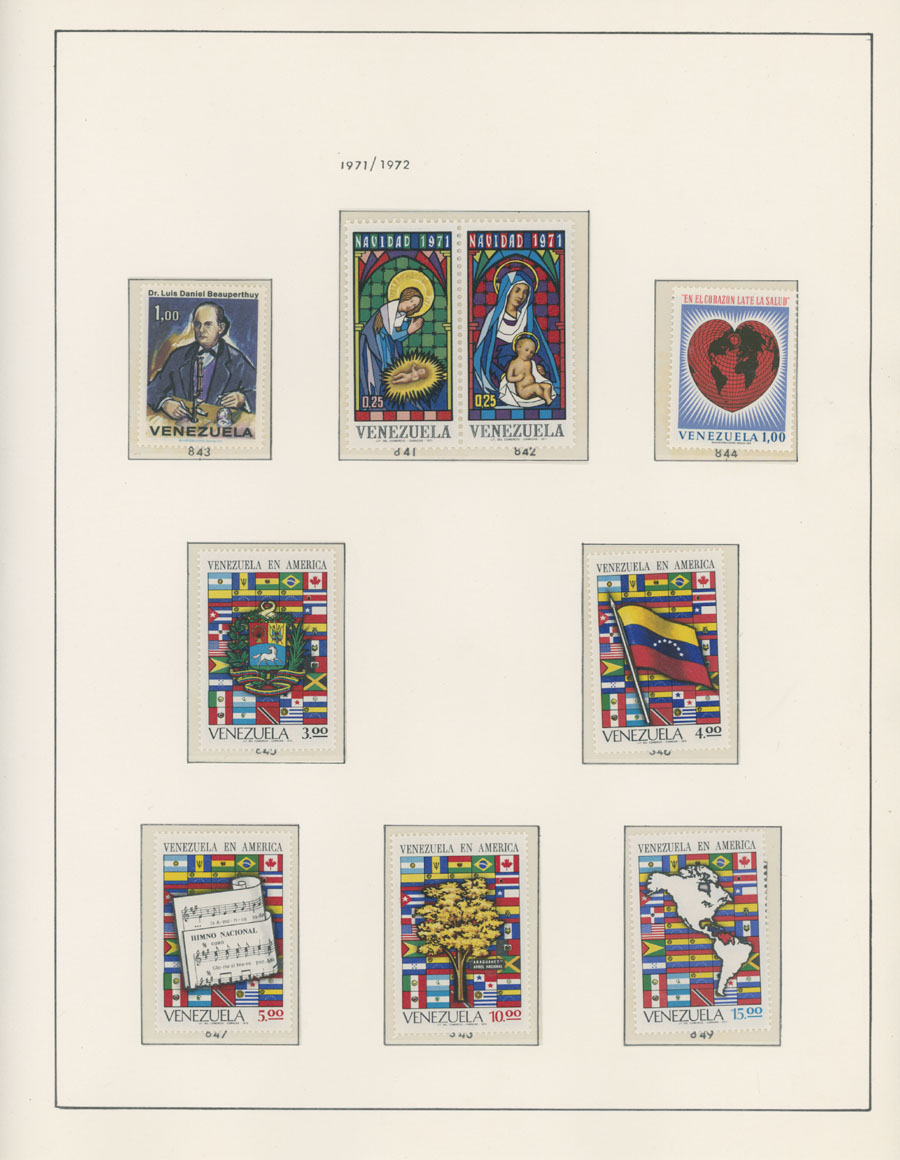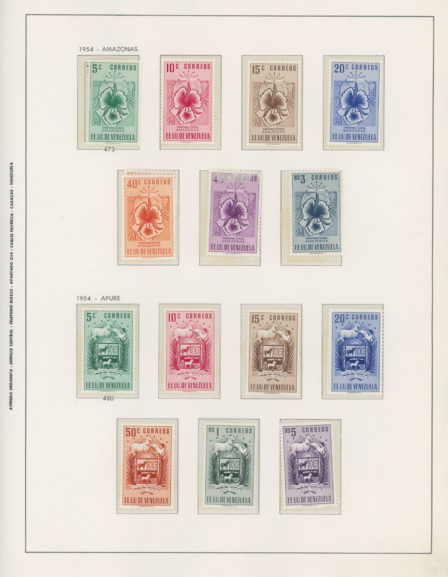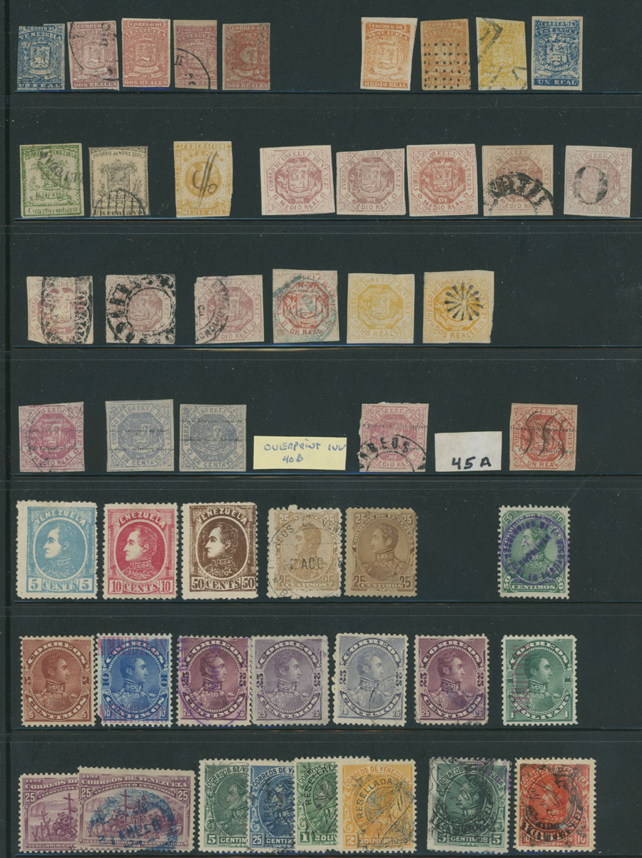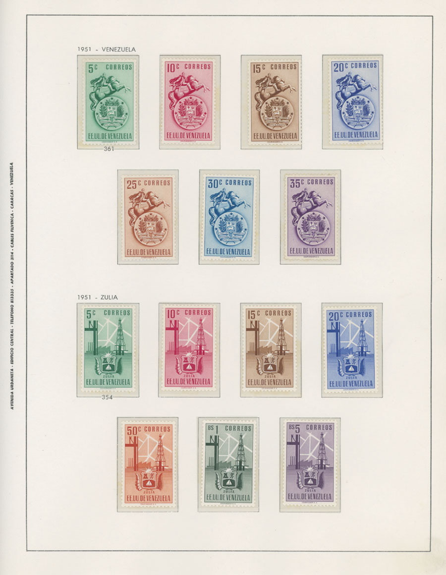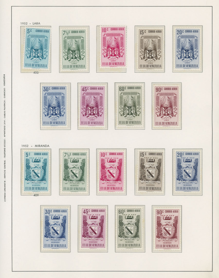 LARGE AND VALUABLE COLLECTION IN TWO LARGE ALBUMS: 1859-1984, about 2600 mostly mint stamps, 37 souvenir and miniature sheets, 15 FD covers, postage, air post and back of the book material, starting with Coat of Arms from 1859-77, then numerous Bolivar definitives, some nice perforation and printing errors, ”Provinces” long postage and air post issues, very well completed unit with some blocks of four and extra mainly classic duplicates on VARIO pages (over 300 stamps), nice collection, mainly full OG, generally LH, some NH, a few dozens used, F/VF, C.v. $14,250, including $7,400 in air post part plus about $1,500 in duplicates, Est. $2,500-$3,000