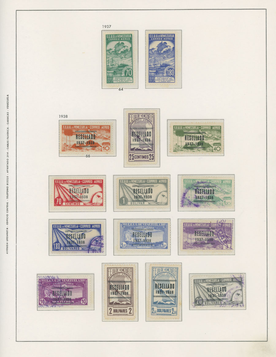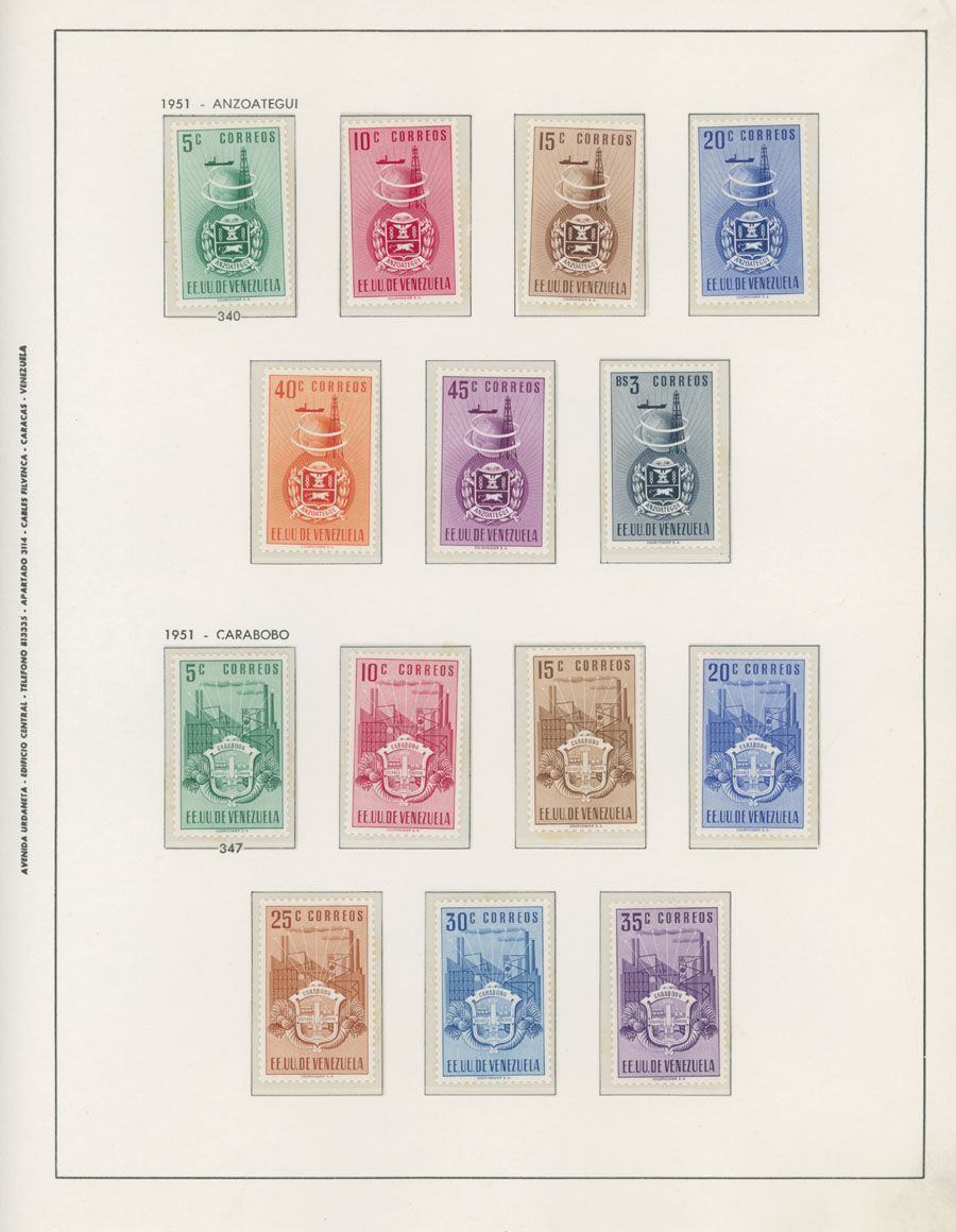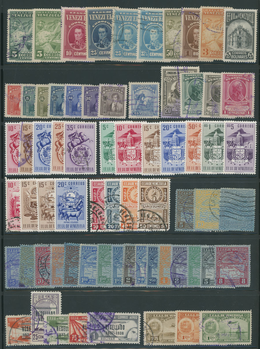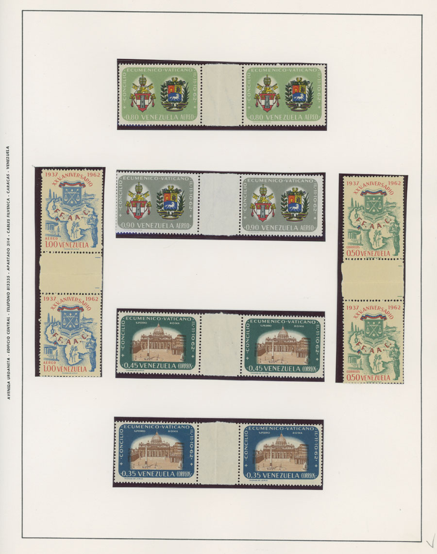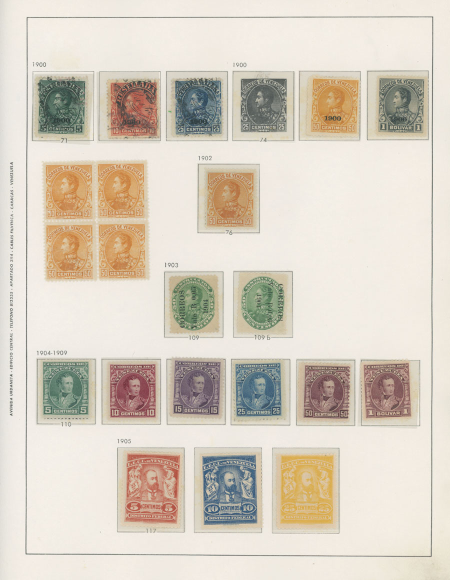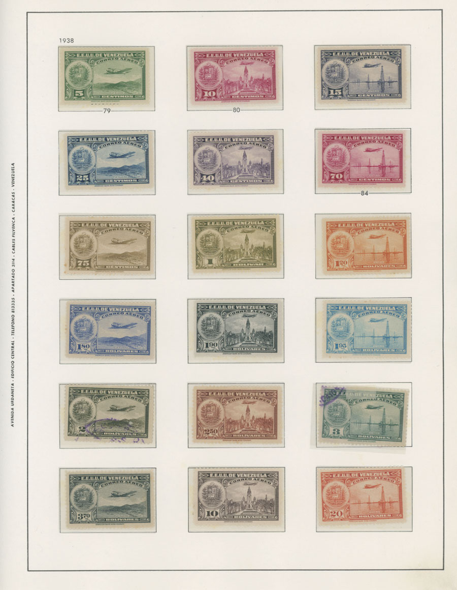 LARGE AND VALUABLE COLLECTION IN TWO LARGE ALBUMS: 1859-1984, about 2600 mostly mint stamps, 37 souvenir and miniature sheets, 15 FD covers, postage, air post and back of the book material, starting with Coat of Arms from 1859-77, then numerous Bolivar definitives, some nice perforation and printing errors, ”Provinces” long postage and air post issues, very well completed unit with some blocks of four and extra mainly classic duplicates on VARIO pages (over 300 stamps), nice collection, mainly full OG, generally LH, some NH, a few dozens used, F/VF, C.v. $14,250, including $7,400 in air post part plus about $1,500 in duplicates, Est. $2,500-$3,000