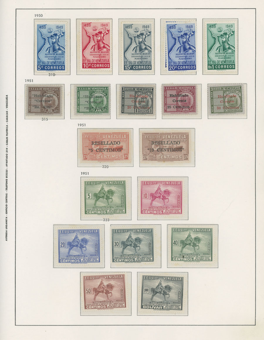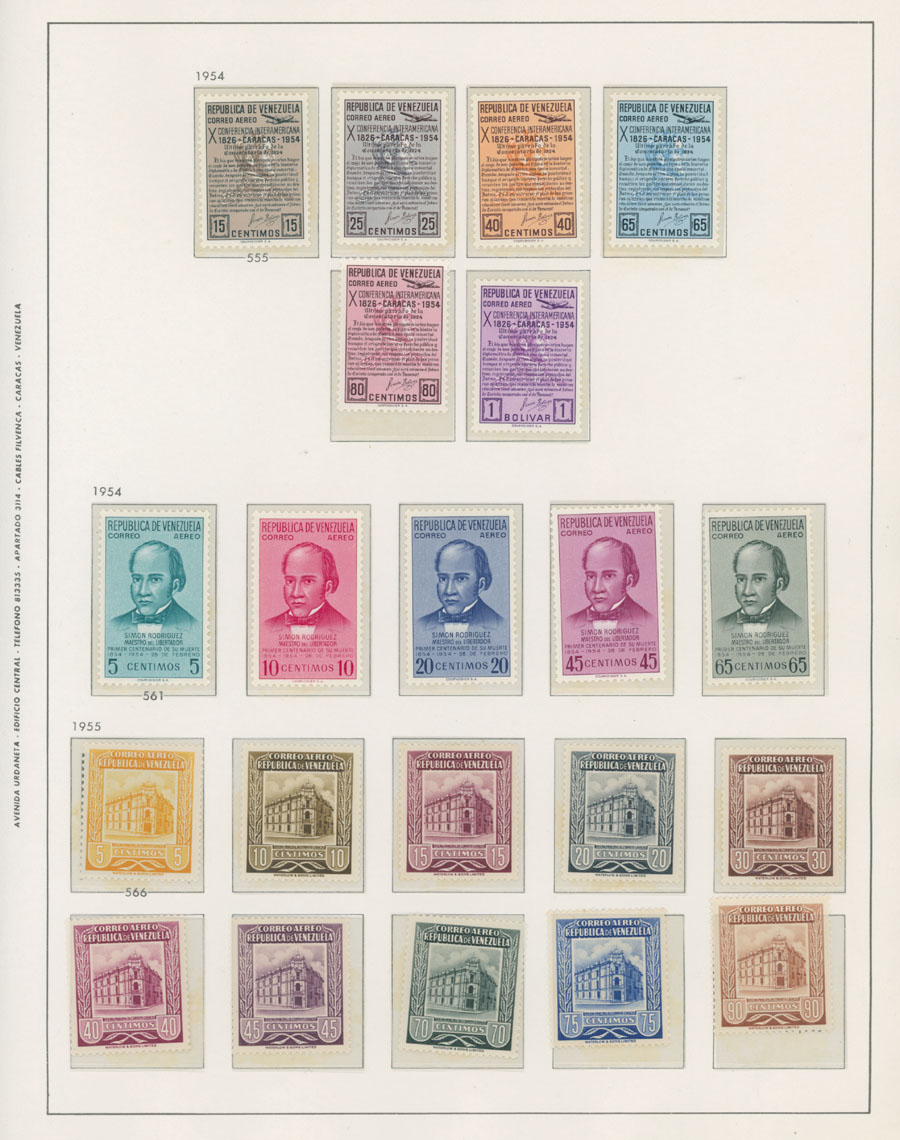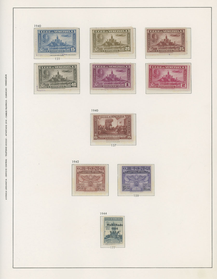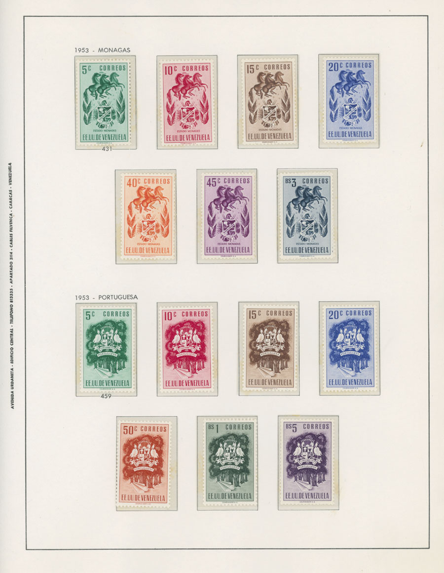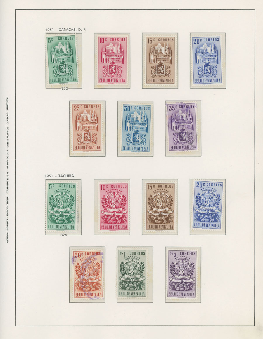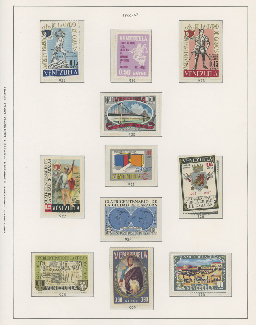 LARGE AND VALUABLE COLLECTION IN TWO LARGE ALBUMS: 1859-1984, about 2600 mostly mint stamps, 37 souvenir and miniature sheets, 15 FD covers, postage, air post and back of the book material, starting with Coat of Arms from 1859-77, then numerous Bolivar definitives, some nice perforation and printing errors, ”Provinces” long postage and air post issues, very well completed unit with some blocks of four and extra mainly classic duplicates on VARIO pages (over 300 stamps), nice collection, mainly full OG, generally LH, some NH, a few dozens used, F/VF, C.v. $14,250, including $7,400 in air post part plus about $1,500 in duplicates, Est. $2,500-$3,000