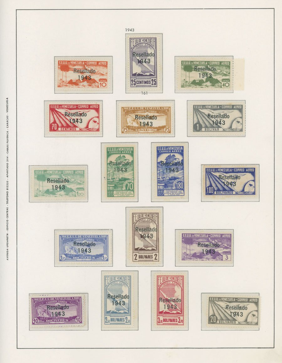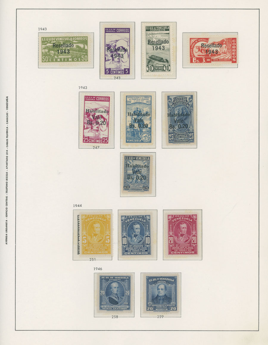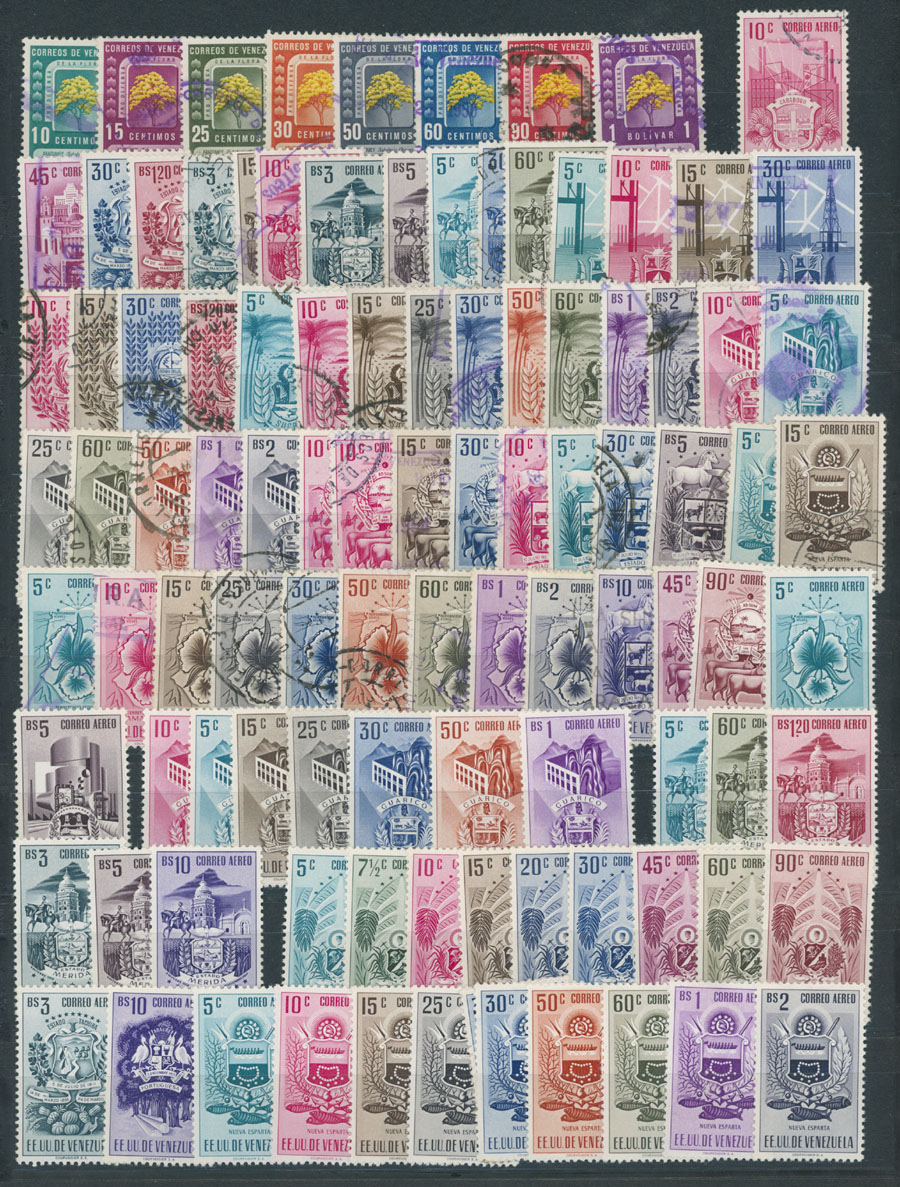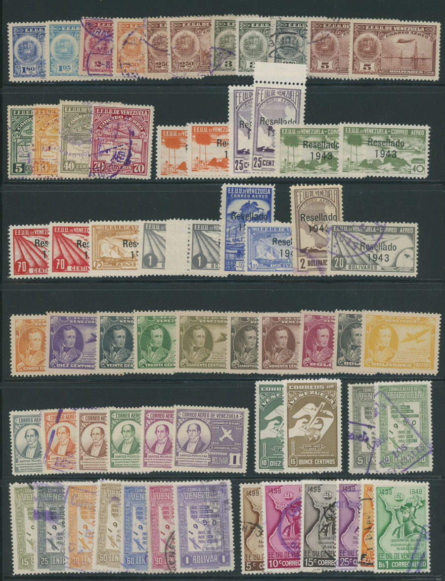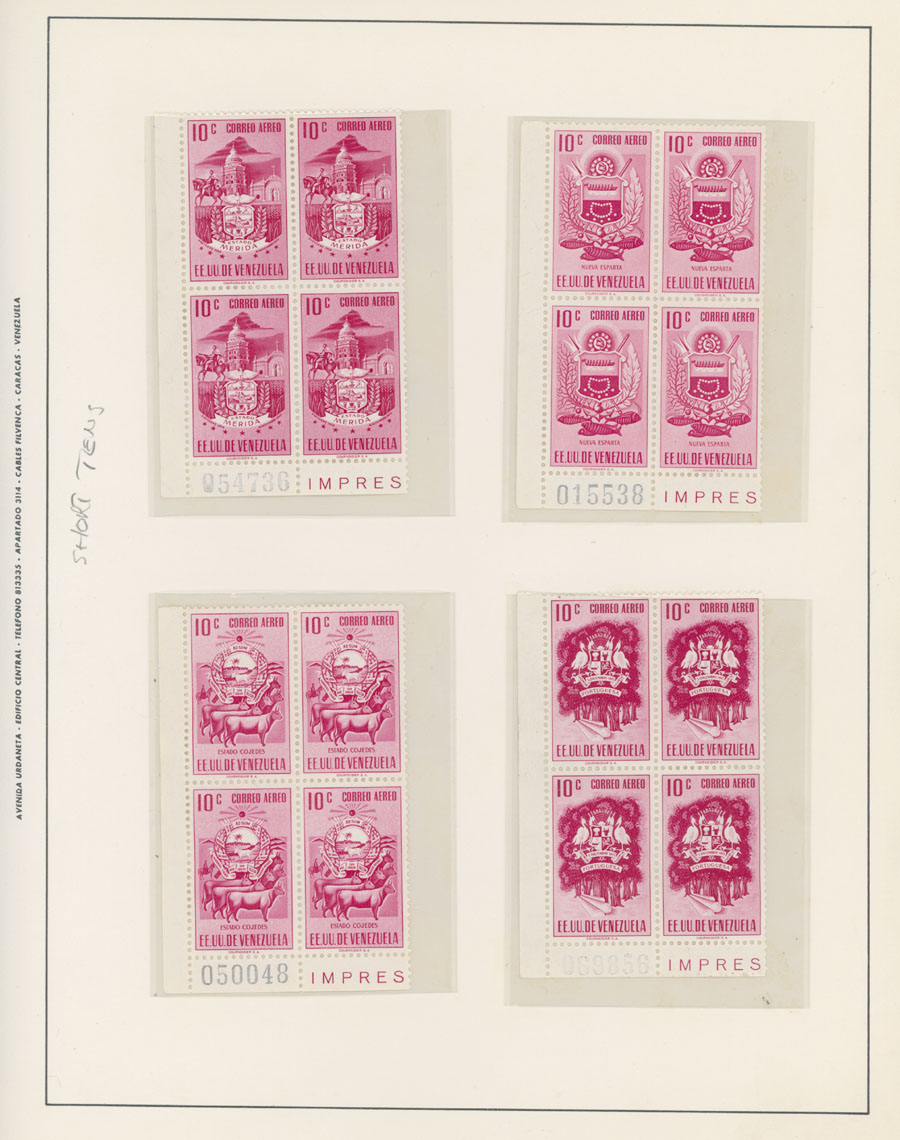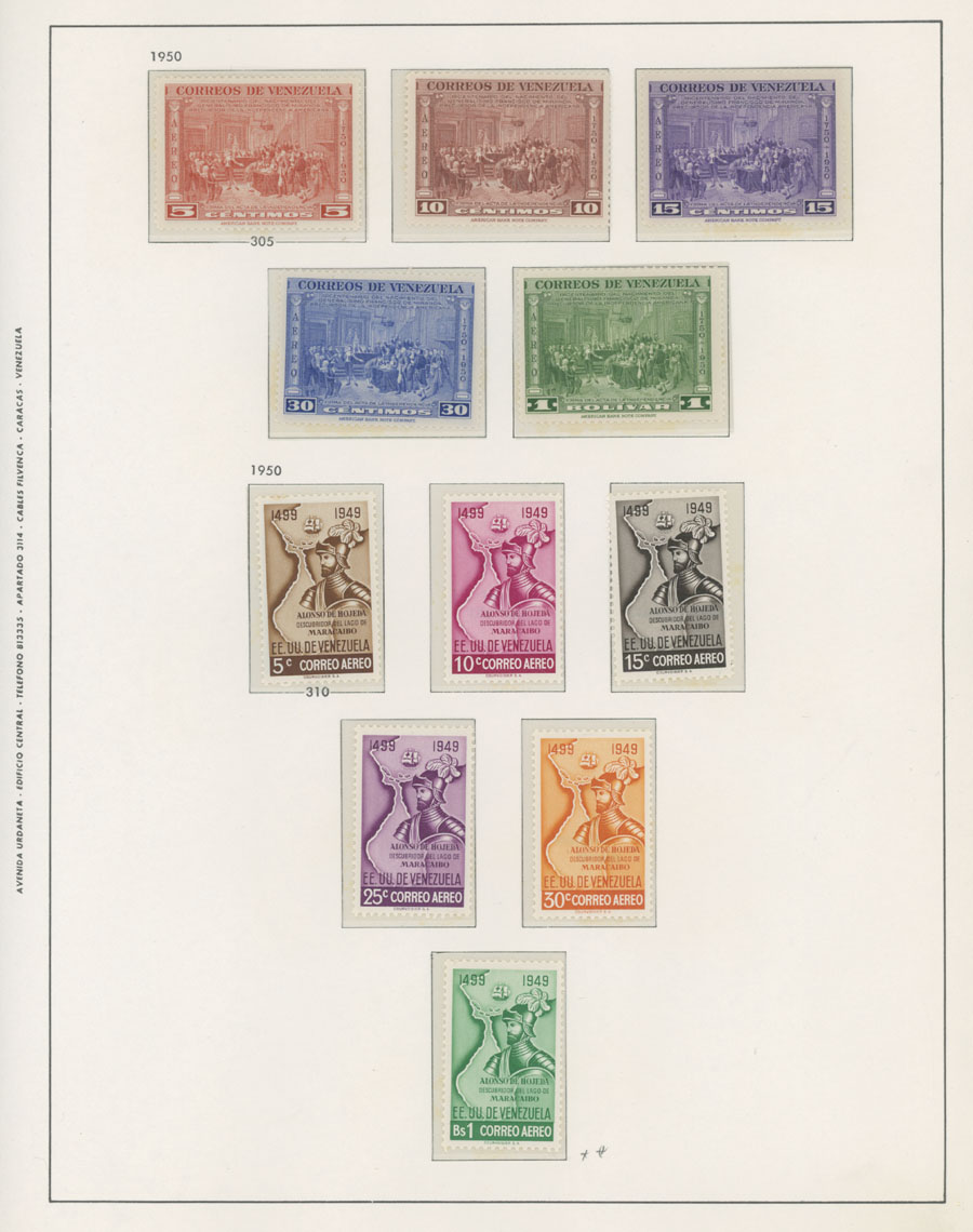 LARGE AND VALUABLE COLLECTION IN TWO LARGE ALBUMS: 1859-1984, about 2600 mostly mint stamps, 37 souvenir and miniature sheets, 15 FD covers, postage, air post and back of the book material, starting with Coat of Arms from 1859-77, then numerous Bolivar definitives, some nice perforation and printing errors, ”Provinces” long postage and air post issues, very well completed unit with some blocks of four and extra mainly classic duplicates on VARIO pages (over 300 stamps), nice collection, mainly full OG, generally LH, some NH, a few dozens used, F/VF, C.v. $14,250, including $7,400 in air post part plus about $1,500 in duplicates, Est. $2,500-$3,000