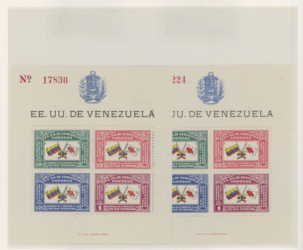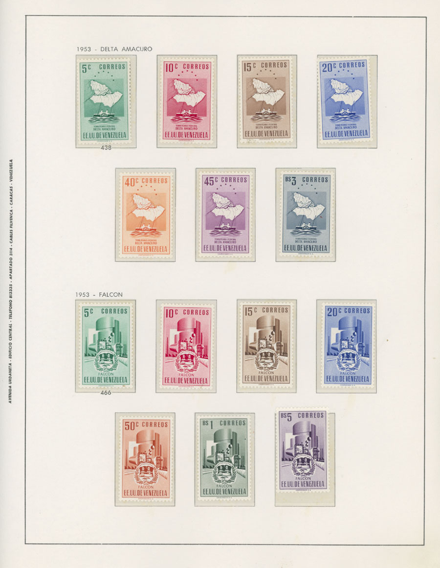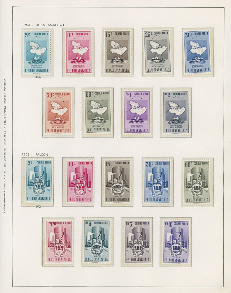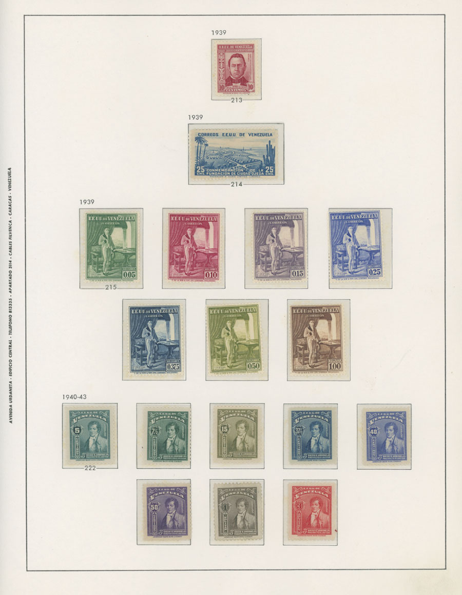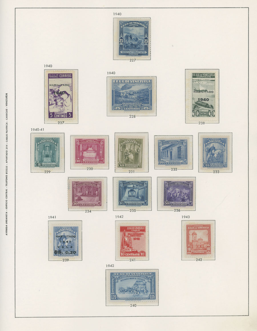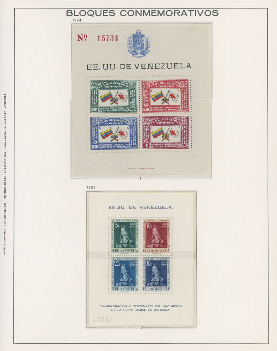 LARGE AND VALUABLE COLLECTION IN TWO LARGE ALBUMS: 1859-1984, about 2600 mostly mint stamps, 37 souvenir and miniature sheets, 15 FD covers, postage, air post and back of the book material, starting with Coat of Arms from 1859-77, then numerous Bolivar definitives, some nice perforation and printing errors, ”Provinces” long postage and air post issues, very well completed unit with some blocks of four and extra mainly classic duplicates on VARIO pages (over 300 stamps), nice collection, mainly full OG, generally LH, some NH, a few dozens used, F/VF, C.v. $14,250, including $7,400 in air post part plus about $1,500 in duplicates, Est. $2,500-$3,000