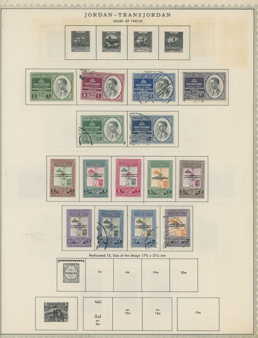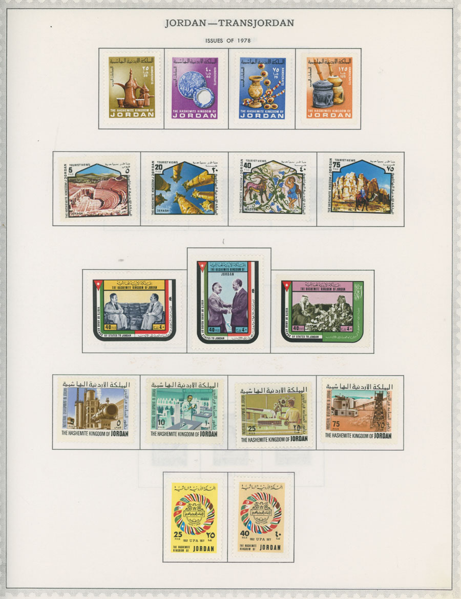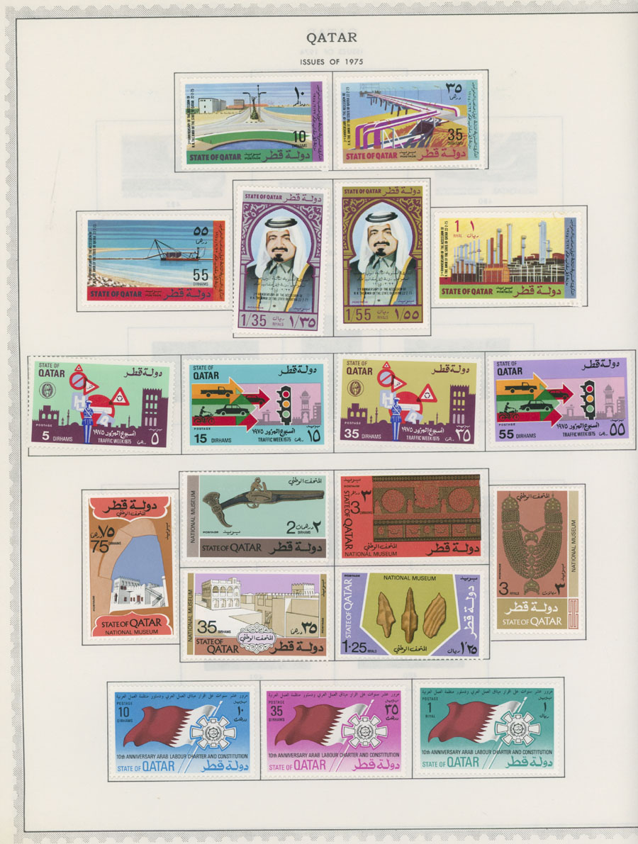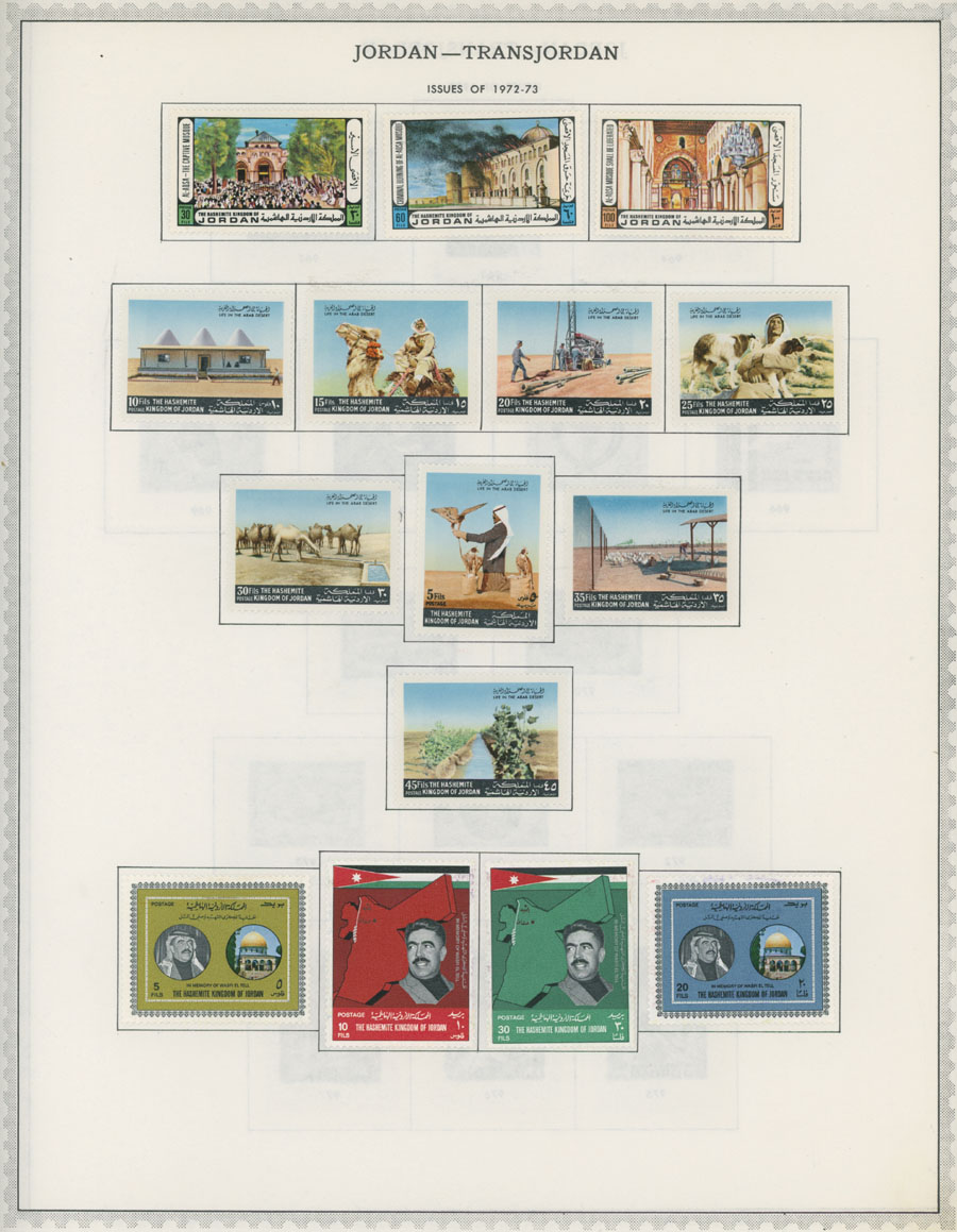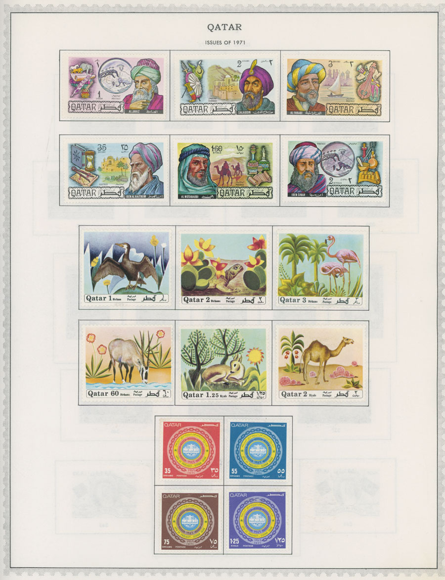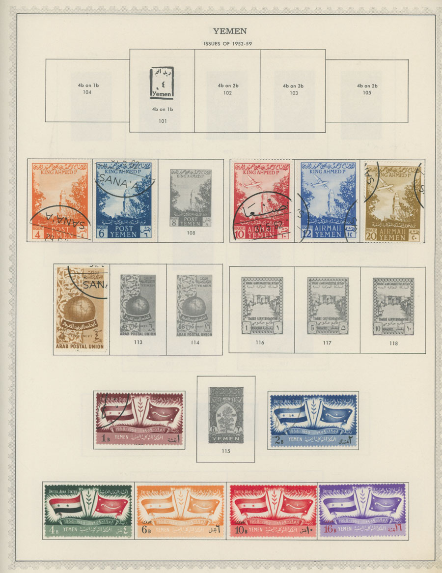 LARGE MIDDLE EAST COLLECTION ON ILLUSTRATED PAGES: 1865-2000, about 13,000 mint and used stamps and 180 souvenir sheets, representing issues of Aden and South Arabia (C.v. $550), Afghanistan (C.v. $900), Iran (C.v. $5,700), Iraq (C.v. $1,000), Palestine and Israel (C.v. $1,400), Jordan (C.v. $1,350), Pakistan (C.v. $1,000), Qatar (C.v. $3,000), Turkey (C.v. $4,000), United Arab Emirates with other Trucial States and Yemen (C.v. $1,000), many valuable items, occasional flaws possible, full/large part of OG or used (many CTO), F/VF, great lot for breaking up for individual country collections, total C.v. about $20,000, Est. $4,000-$5,000