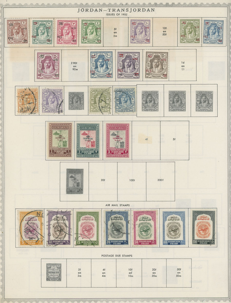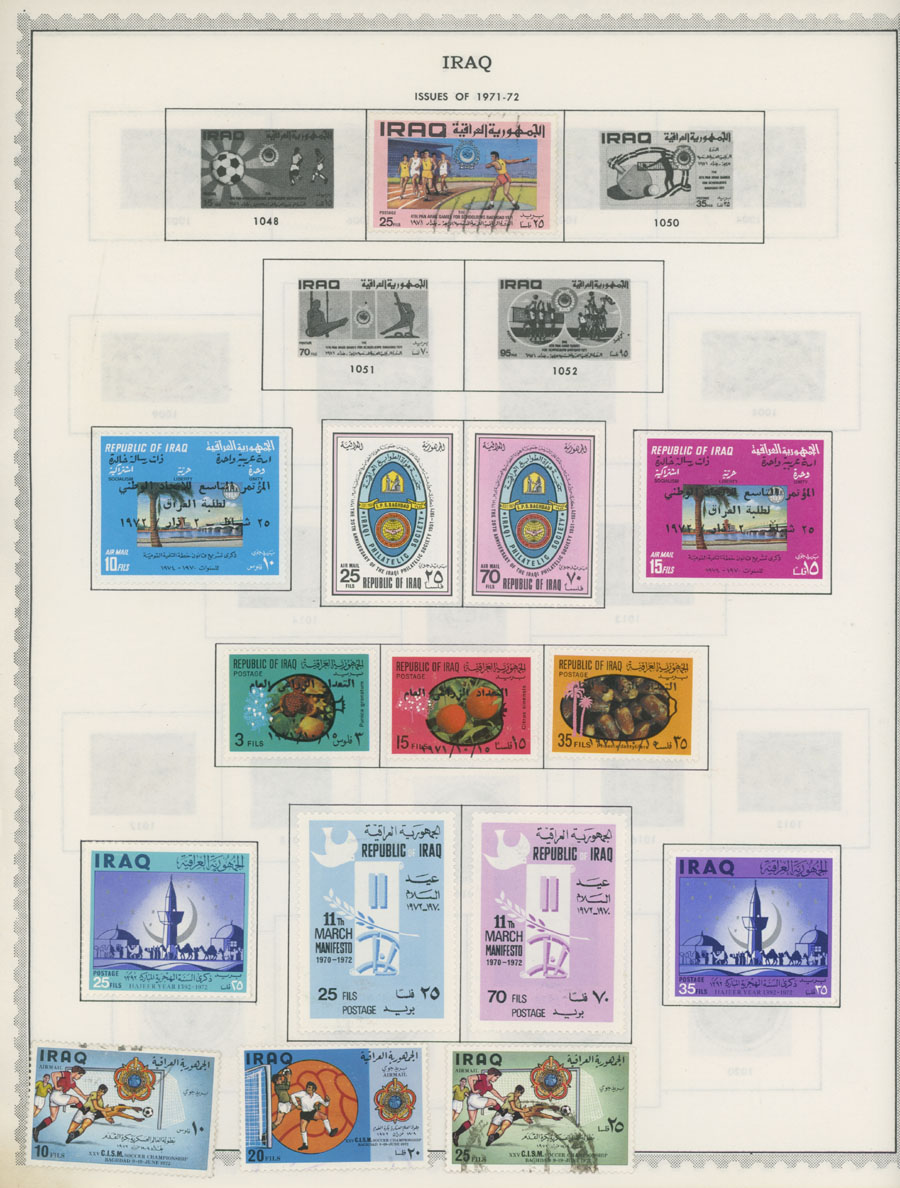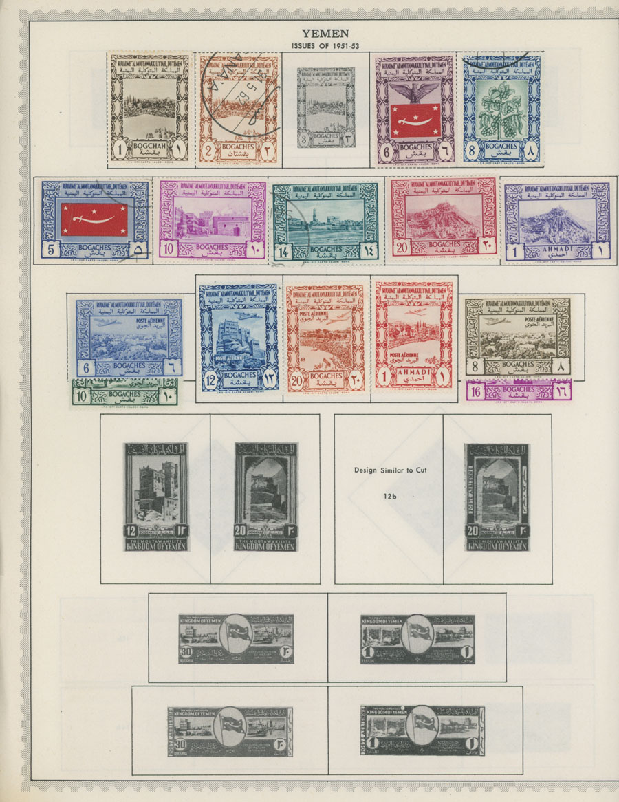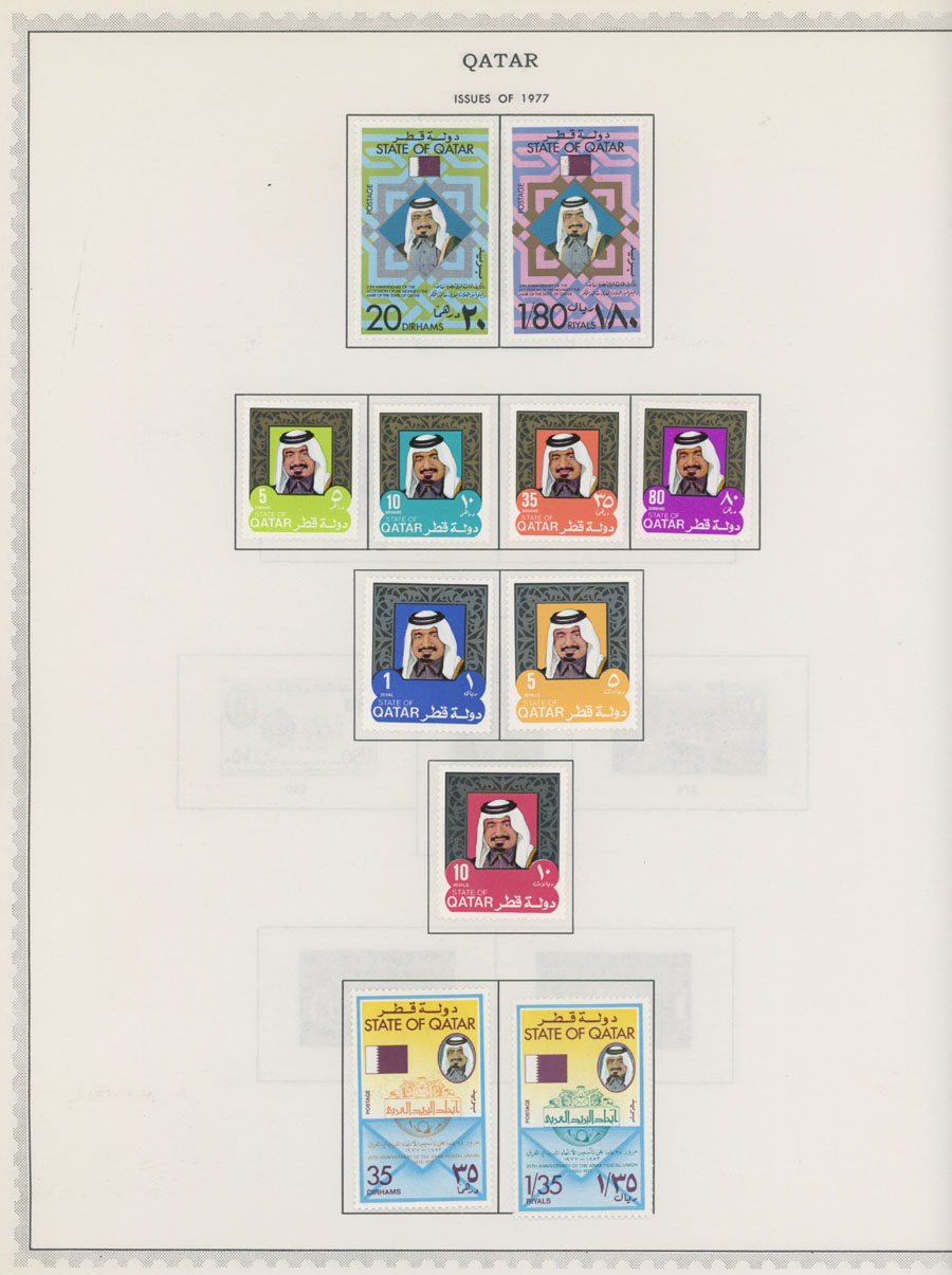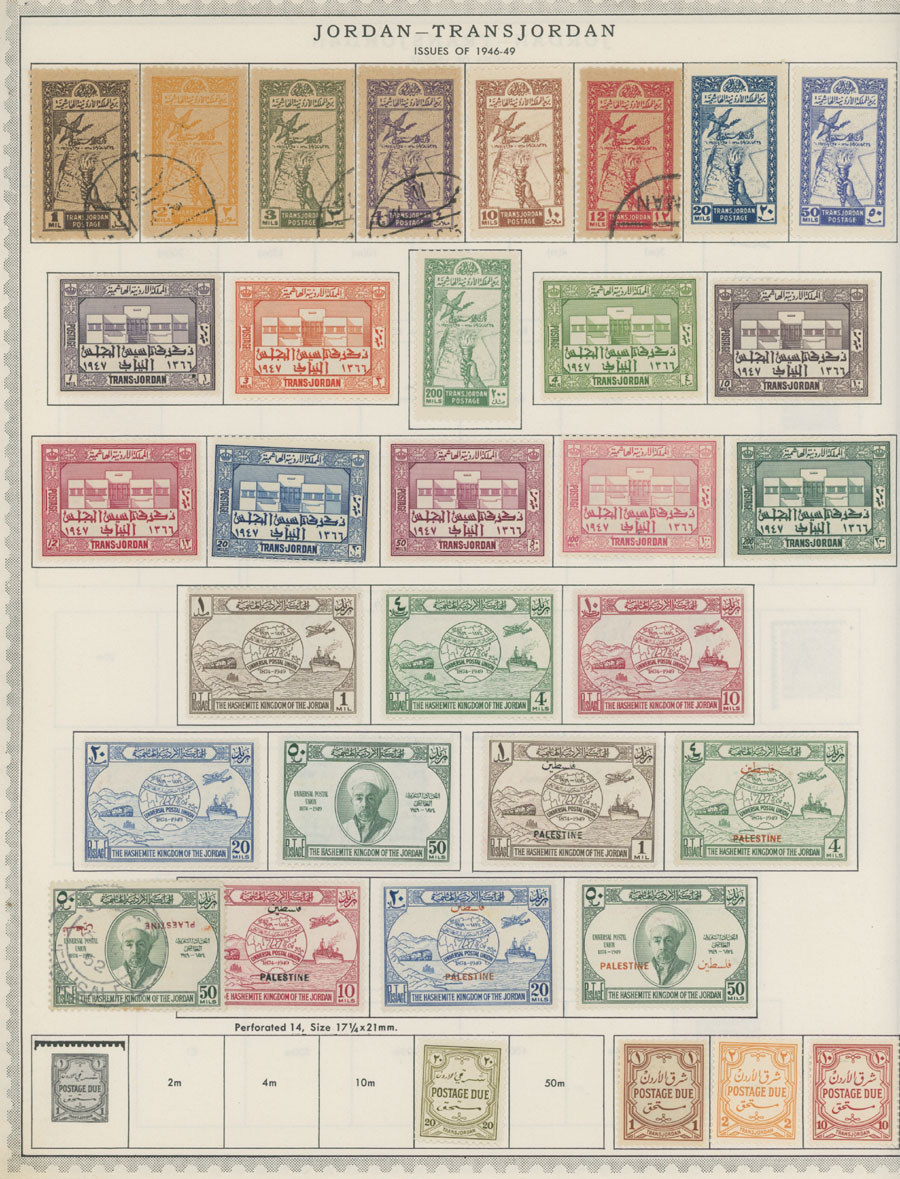 LARGE MIDDLE EAST COLLECTION ON ILLUSTRATED PAGES: 1865-2000, about 13,000 mint and used stamps and 180 souvenir sheets, representing issues of Aden and South Arabia (C.v. $550), Afghanistan (C.v. $900), Iran (C.v. $5,700), Iraq (C.v. $1,000), Palestine and Israel (C.v. $1,400), Jordan (C.v. $1,350), Pakistan (C.v. $1,000), Qatar (C.v. $3,000), Turkey (C.v. $4,000), United Arab Emirates with other Trucial States and Yemen (C.v. $1,000), many valuable items, occasional flaws possible, full/large part of OG or used (many CTO), F/VF, great lot for breaking up for individual country collections, total C.v. about $20,000, Est. $4,000-$5,000