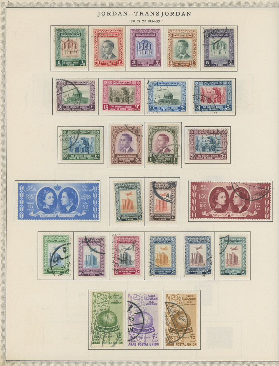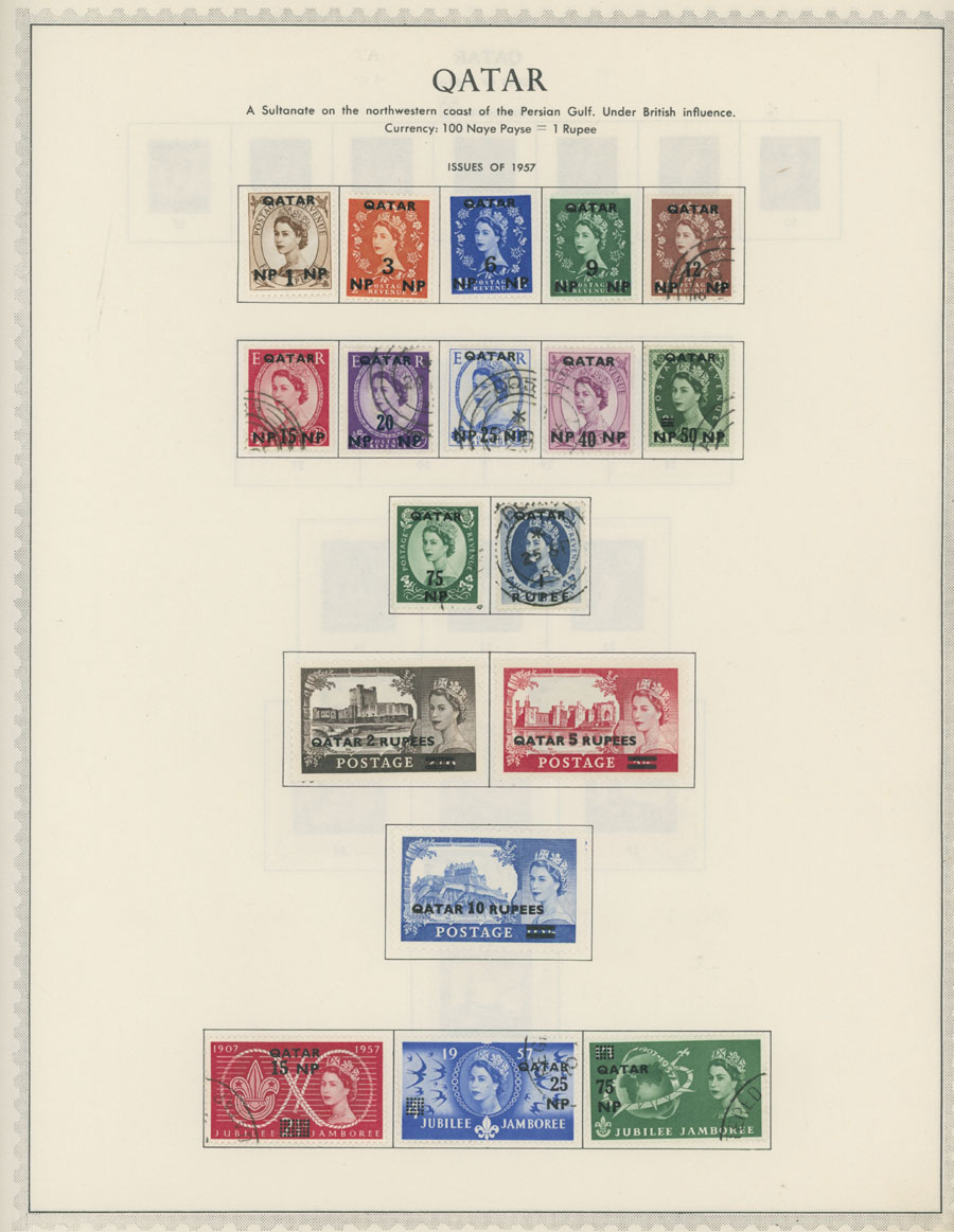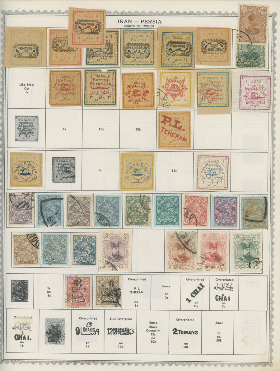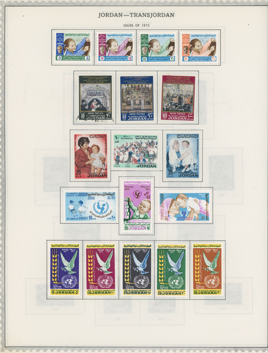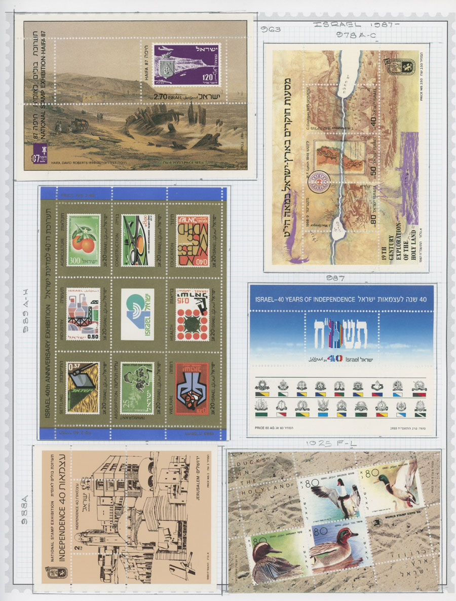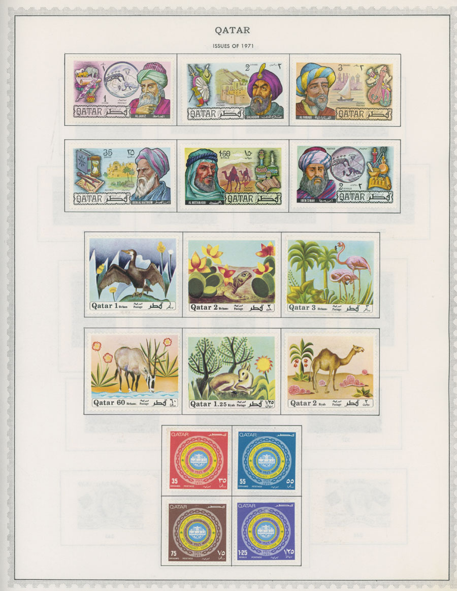 LARGE MIDDLE EAST COLLECTION ON ILLUSTRATED PAGES: 1865-2000, about 13,000 mint and used stamps and 180 souvenir sheets, representing issues of Aden and South Arabia (C.v. $550), Afghanistan (C.v. $900), Iran (C.v. $5,700), Iraq (C.v. $1,000), Palestine and Israel (C.v. $1,400), Jordan (C.v. $1,350), Pakistan (C.v. $1,000), Qatar (C.v. $3,000), Turkey (C.v. $4,000), United Arab Emirates with other Trucial States and Yemen (C.v. $1,000), many valuable items, occasional flaws possible, full/large part of OG or used (many CTO), F/VF, great lot for breaking up for individual country collections, total C.v. about $20,000, Est. $4,000-$5,000