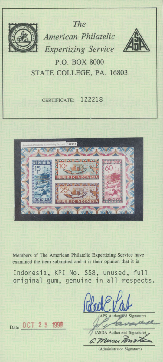 1949, Liberation of Jakarta, Map and Cargo Ship ”Merdeka”, imperforate souvenir sheet of 10s, 15s, 25s, 60s with gold Liberation overprints, full OG, NH, VF and very rare, APEX certificate, C.v. $2,500, Est. $1,500-$1,800 , Scott #117a