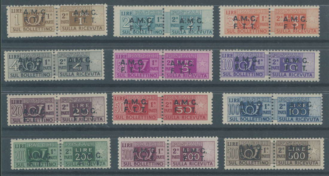 1947-48, Italian Parcel Post stamps, two-line black overprint ”A.M.G. F.T.T.”, 1L-500L, complete set of 12, perforation 13¼x14, full/large part of OG, LH or previously hinged, F/VF, C.v. $1,202,Sassone #PP1-12, C.v.€750, Est. $200-$250, Scott #Q1-12