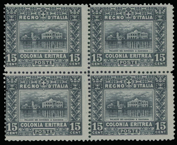 1910, Government Building, 15c slate, perforation L13½, block of four, usual centering and post office fresh, full OG, NH, fine and rare multiple, C.v. $5,000 as singles, Sassone #36, C.v. €14,375, Est. $1,500-$2,000 , Scott #47