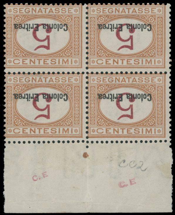 1920, 5c orange and magenta, inverted numeral and black overprint ”Colonia Eritrea”, bottom sheet margin block of four, full OG, NH, F/VF and rare double error multiple, expertized by Dr. Bolaffi, G. Oliva and others, C.v. $2,200 as hinged singles, Sassone #14a, C.v. €6,000 as singles, Est. $1,000-$1,200, Scott #J1bc