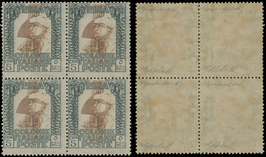 1921, Roman Legionary, error of color, 5c black and red brown instead of black and green, block of four with perforation 13½-14, excellent quality and well above average centering for this issue, full OG, NH (!), F/VF and extremely rare multiple, each stamp signed by Dr. Bolaffi, C.v. $10,400++, Sassone #23A, C.v.€36,000 as singles, Est. $5,000-$6,000, Scott #22a