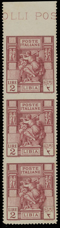 1924, Sibilla Libica, 2L carmine, perforation 14, top sheet margin vertical strip of three, imperforate at top and between stamps, full OG, NH, VF and rare, Sassone #43k, C.v.€6,000 as never hinged, Est. $800-$900 , Scott #43 var