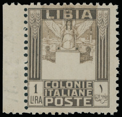1926-30, Victory, 1L dark brown and brown, perforation 11, left sheet margin single with center is strongly (for 6mm) shifted to the top, full OG, NH, VF, C.v. $875 for a stamp without variety, Sassone #65b, C.v. €2,400, Est. $400-$450 , Scott #58a var
