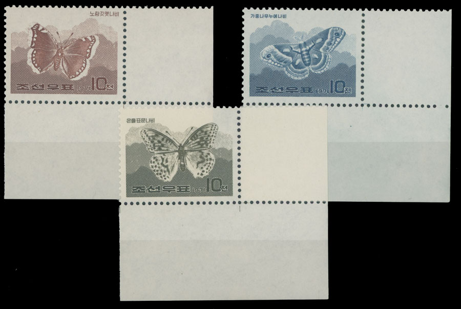 1971, Butterflies, 10ch in different colors, unissued complete set of three, all are bottom right corner margin singles, full OG, NH, VF, C.v. $2,500, Est. $500-$600 , Scott #1022 fn