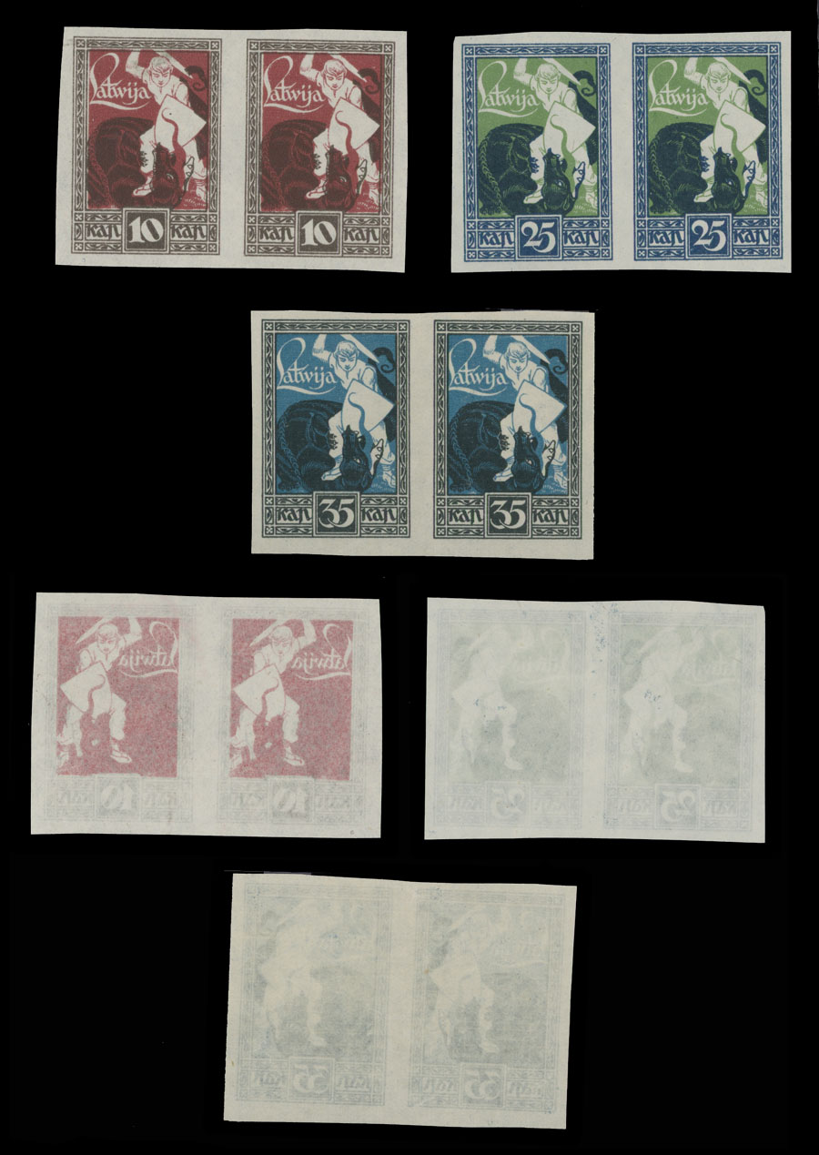 1919, Warrior Slaying Dragon, 10k, 25k and 35k, imperforate plate proofs in horizontal pairs, first one with offset of red color on reverse, no gum as produced, NH, VF and very rare items from the Postal Archives, Est. $600-$700 , Scott #64-66