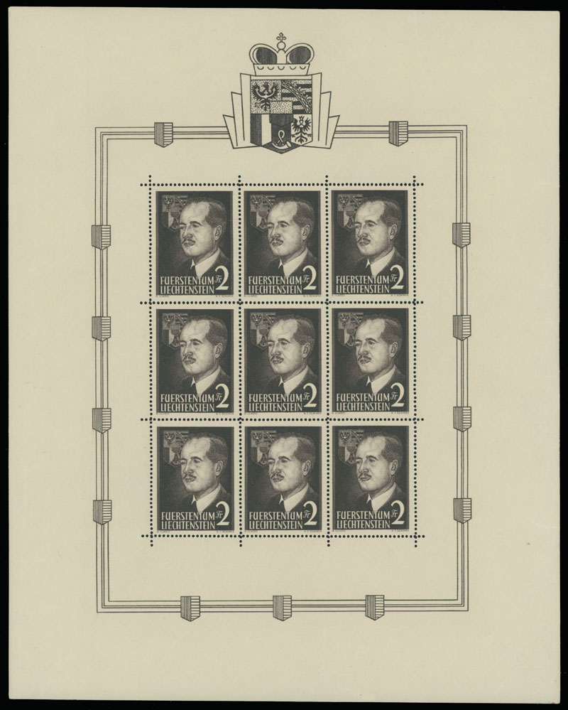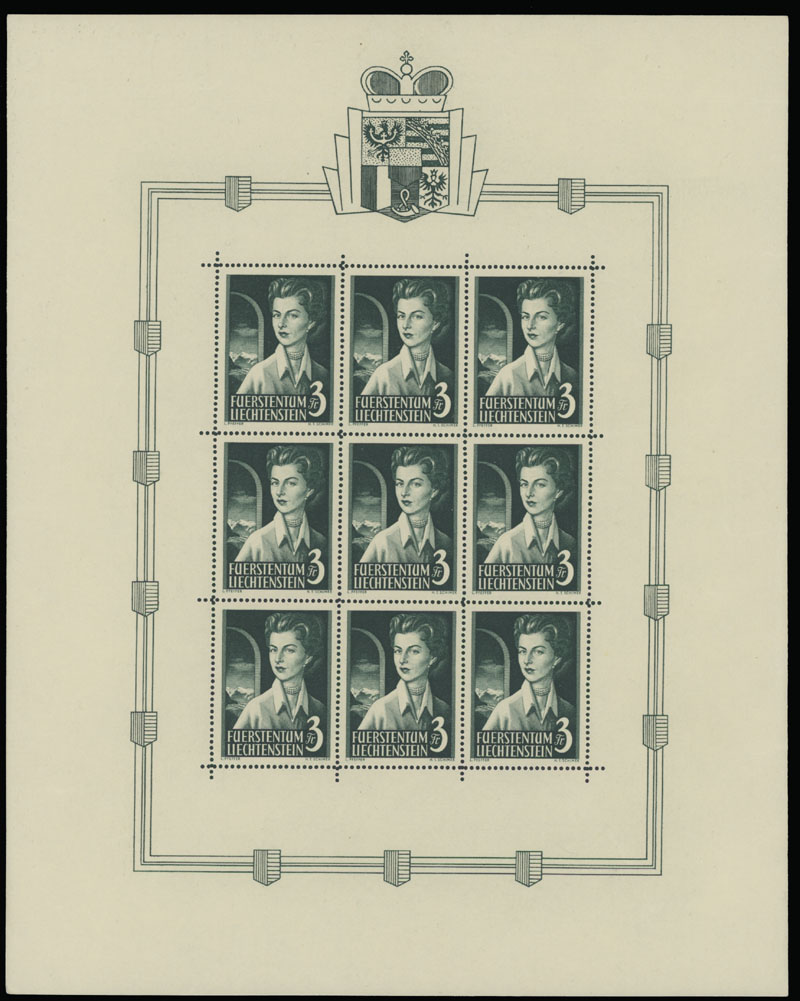 1955, Prince Franz Joseph II and Princess Georgina, 2fr dark brown and 3fr dark green, complete set of two on cream paper in sheets of nine, full OG, NH, VF, C.v. $1,260++, SBK #276-77, C.v. CHF3,750, Est. $500-$600 , Scott #287-88