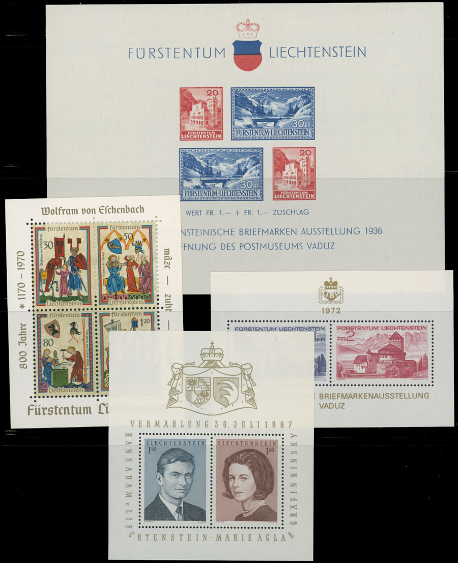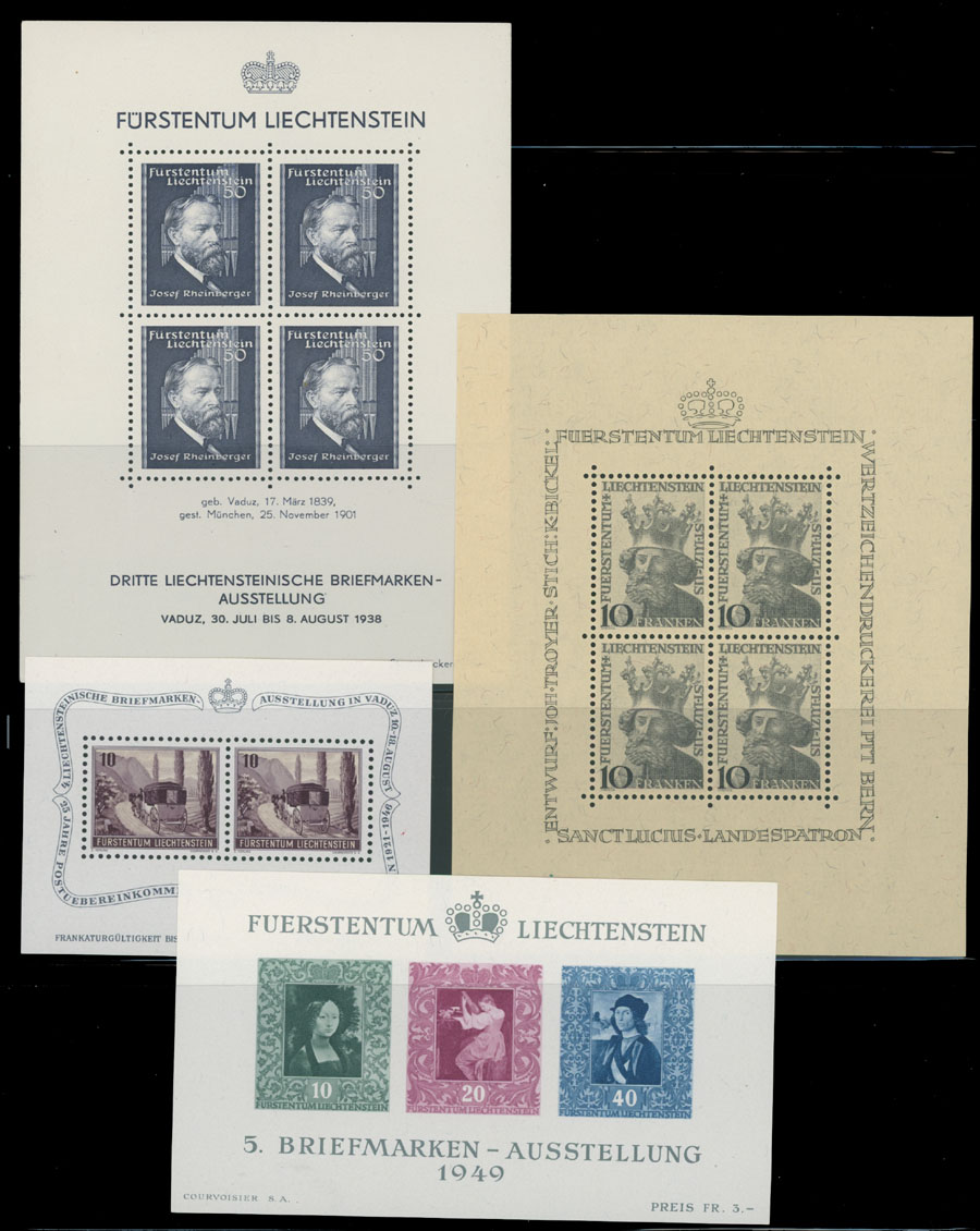 1938-72, Josef Rheinberger, St. Lucius, Paintings, Postal Museum and etc., group of eight souvenir/miniature sheets, fresh quality, full OG, NH, VF, C.v. $470, Est. $150-$180 , Scott #151/505, B14, B18