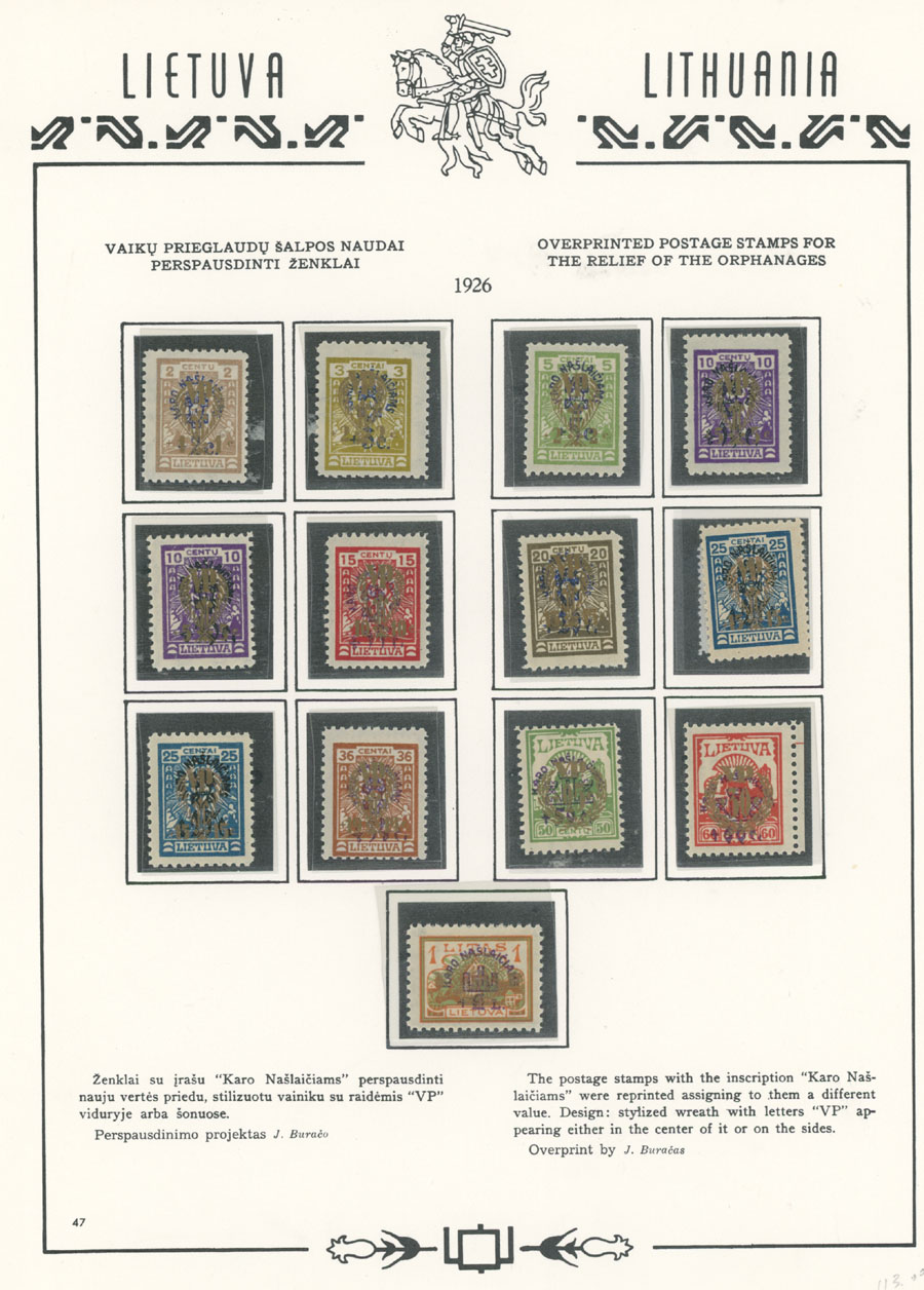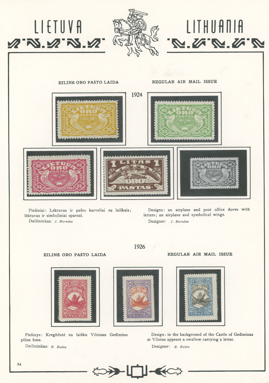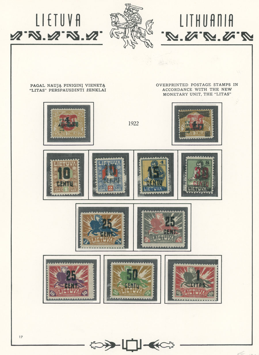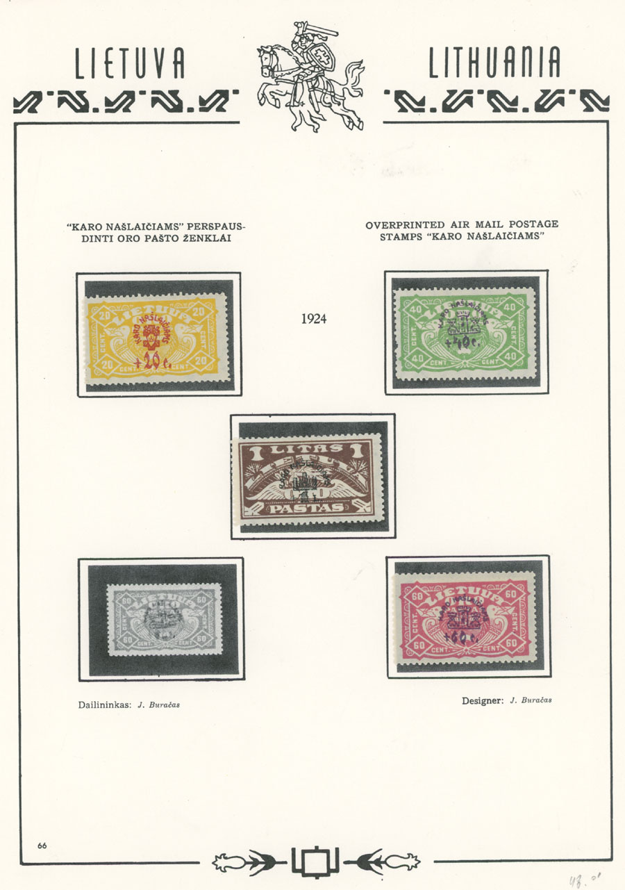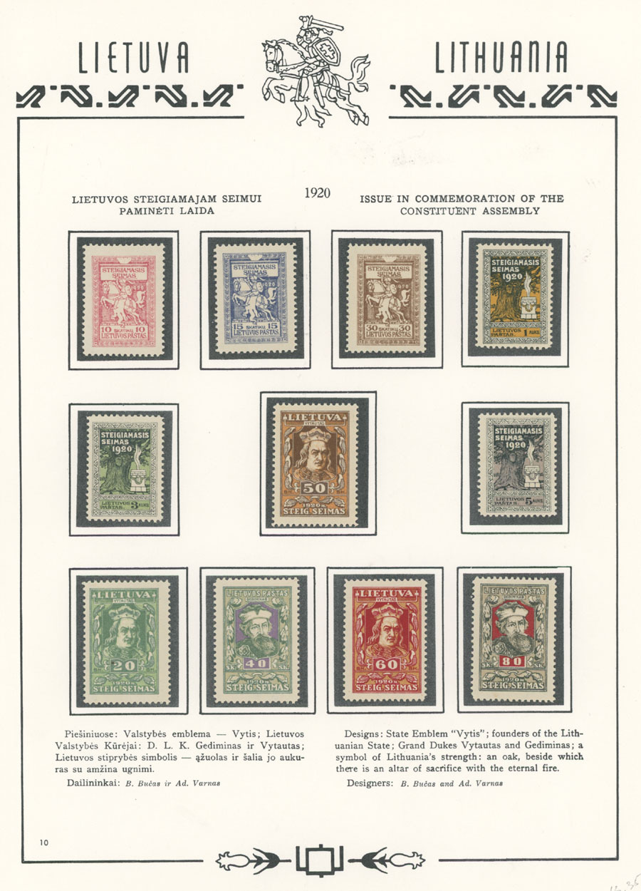 1916-41, over 550 mostly mint stamps (9 – used) and three souvenir sheets, representing postage, semi-postal, air post plus two occupation sets of the World War I and II, starting with first and second Vilnius issues, three Kaunas sets, including No.10a in block of four, then range of Berlin colored Arms issues, further surcharges including No.120-22 (two with APEX certificates and all three NH), continues with National Assembly changed colors issue, nice long definitives, including three semi-postal sets, apparently complete air post with Vaitkus overprint (Sanabria guarantee) plus many more, fresh material, full/large part of OG, mainly LH, F/VF, C.v. is over $5,250, Est. $2,000-$2,500, Scott #1/332, B1-54, C1-97