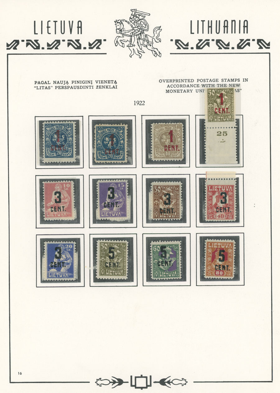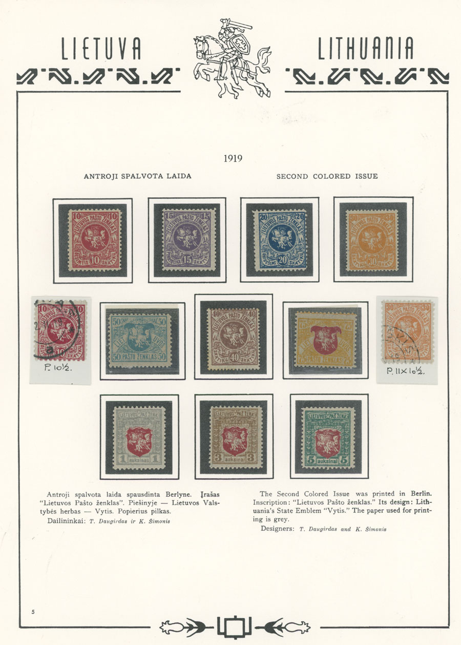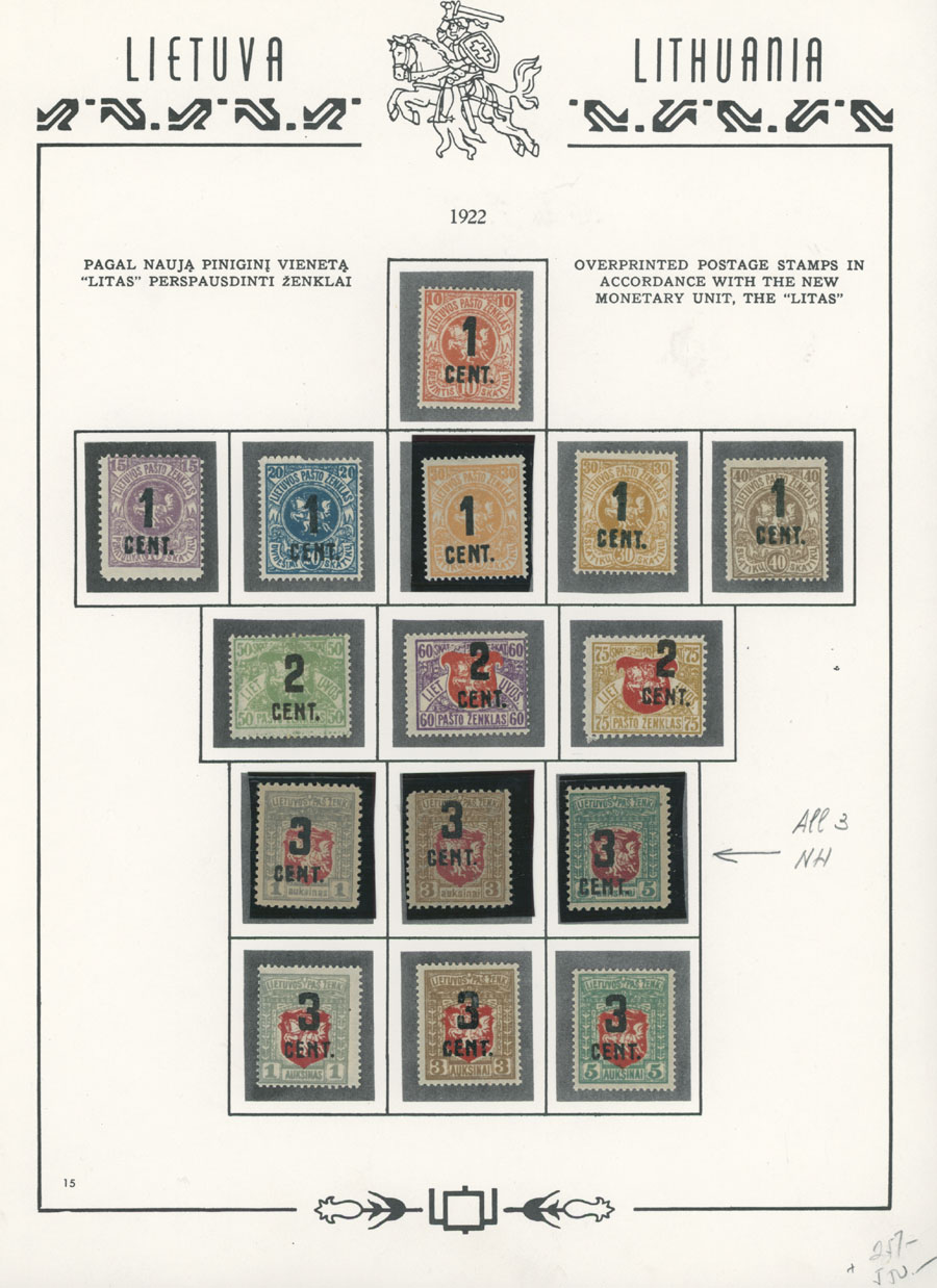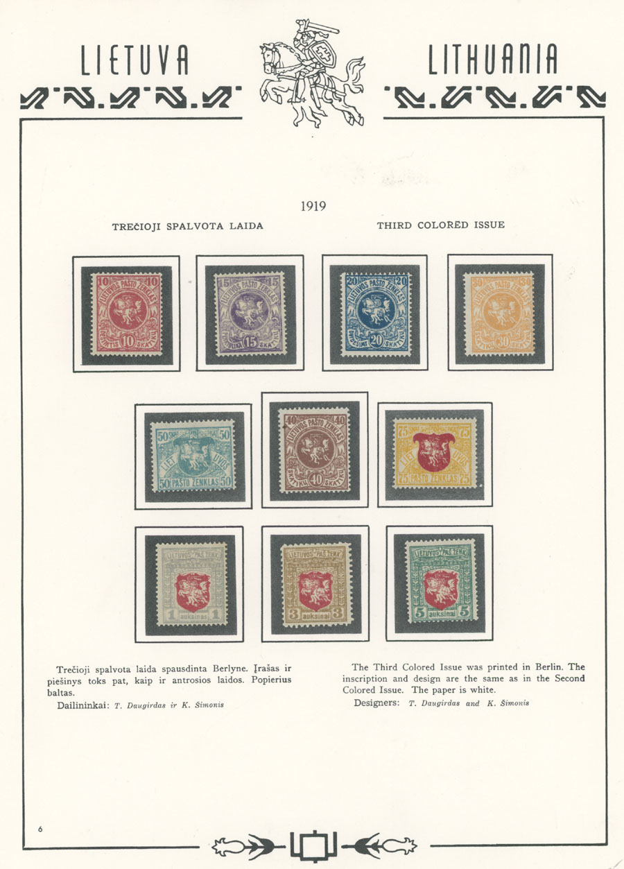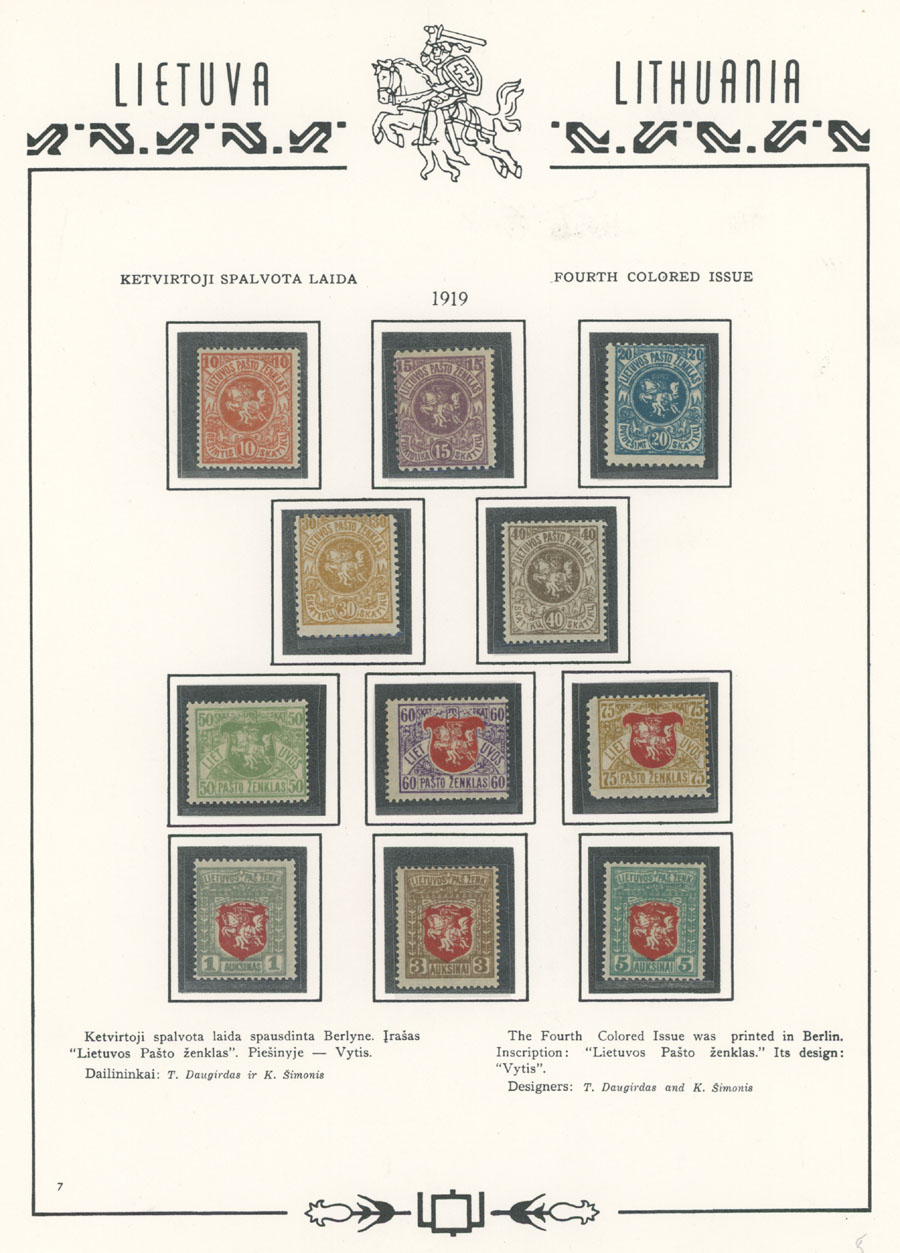 1916-41, over 550 mostly mint stamps (9 – used) and three souvenir sheets, representing postage, semi-postal, air post plus two occupation sets of the World War I and II, starting with first and second Vilnius issues, three Kaunas sets, including No.10a in block of four, then range of Berlin colored Arms issues, further surcharges including No.120-22 (two with APEX certificates and all three NH), continues with National Assembly changed colors issue, nice long definitives, including three semi-postal sets, apparently complete air post with Vaitkus overprint (Sanabria guarantee) plus many more, fresh material, full/large part of OG, mainly LH, F/VF, C.v. is over $5,250, Est. $2,000-$2,500, Scott #1/332, B1-54, C1-97