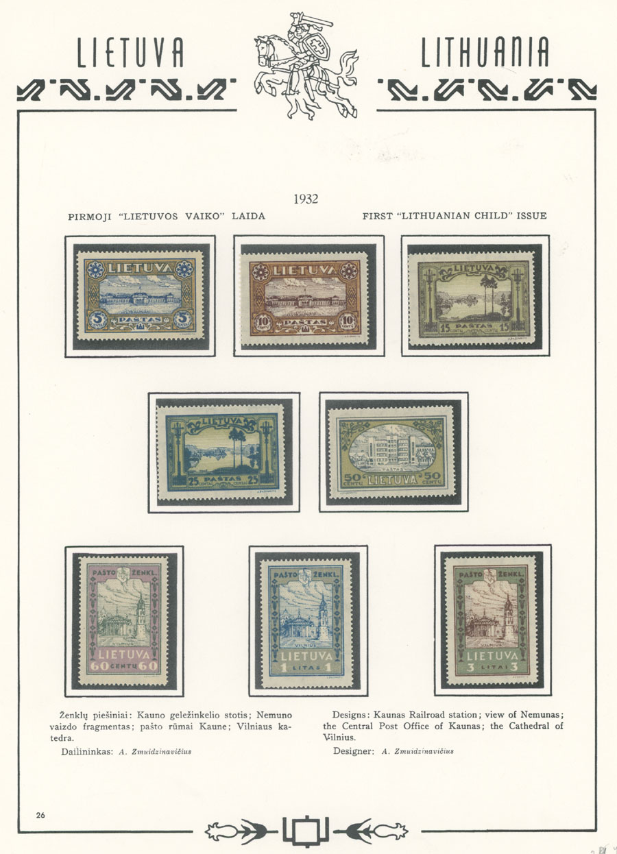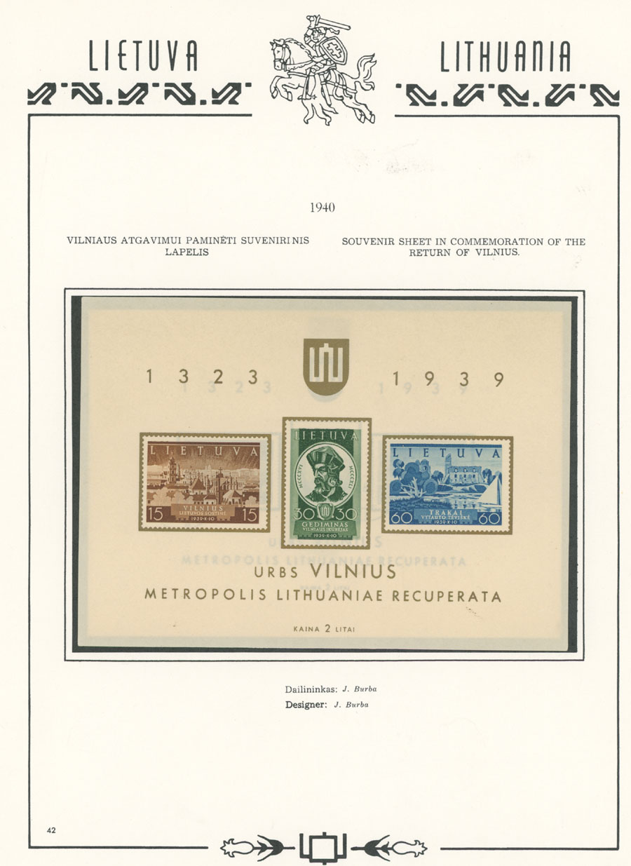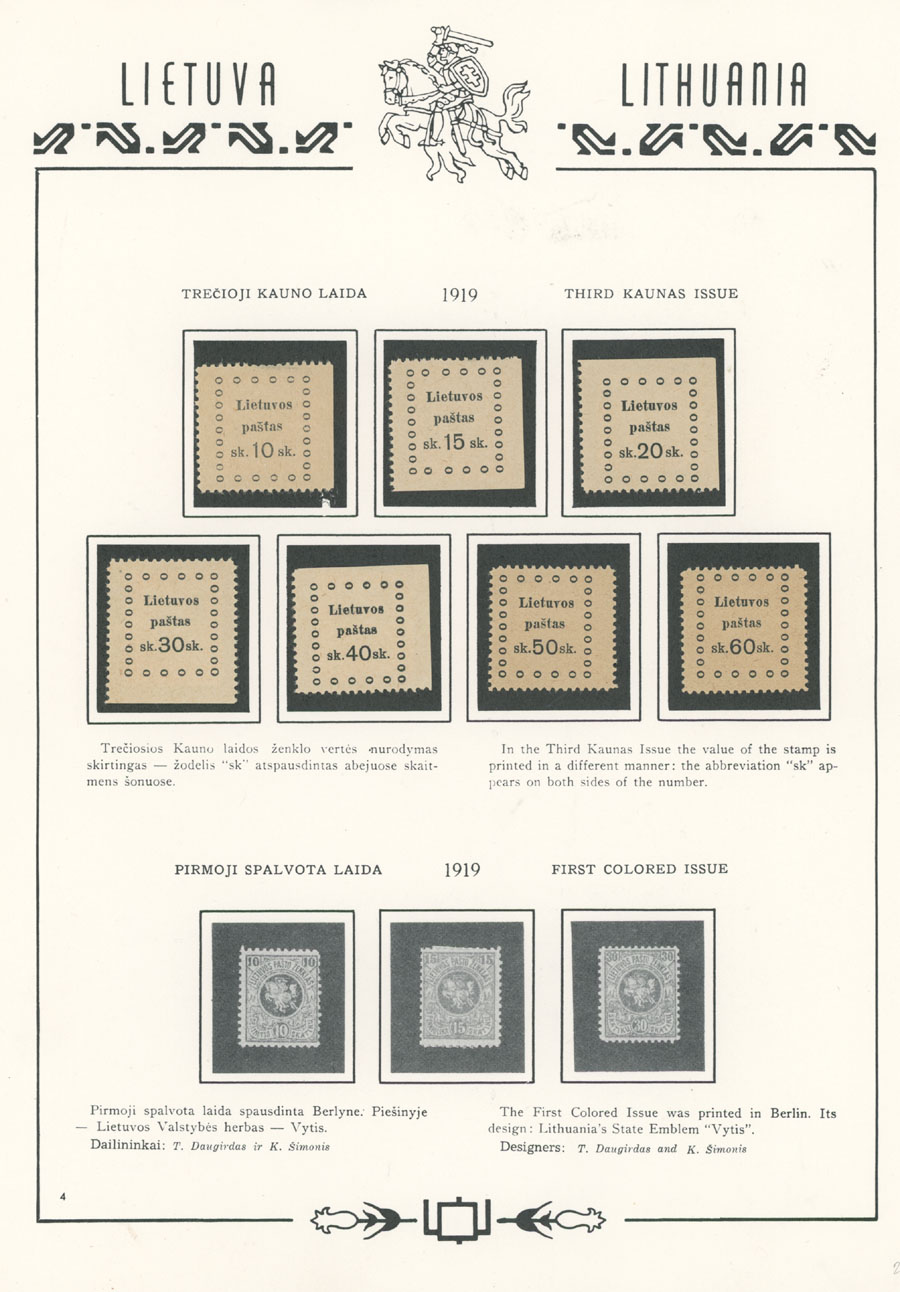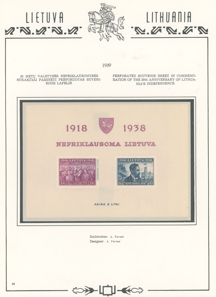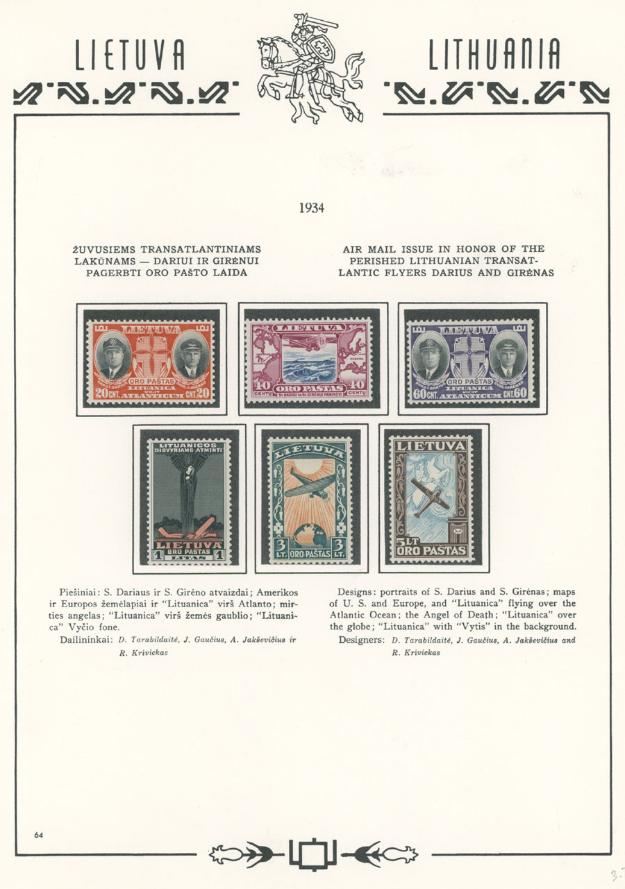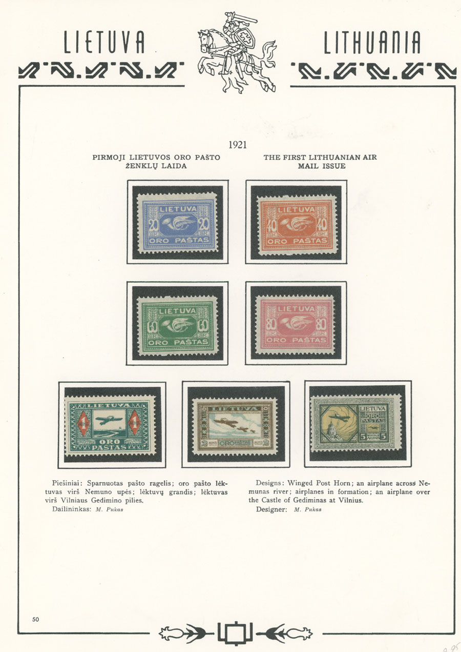 1916-41, over 550 mostly mint stamps (9 – used) and three souvenir sheets, representing postage, semi-postal, air post plus two occupation sets of the World War I and II, starting with first and second Vilnius issues, three Kaunas sets, including No.10a in block of four, then range of Berlin colored Arms issues, further surcharges including No.120-22 (two with APEX certificates and all three NH), continues with National Assembly changed colors issue, nice long definitives, including three semi-postal sets, apparently complete air post with Vaitkus overprint (Sanabria guarantee) plus many more, fresh material, full/large part of OG, mainly LH, F/VF, C.v. is over $5,250, Est. $2,000-$2,500, Scott #1/332, B1-54, C1-97