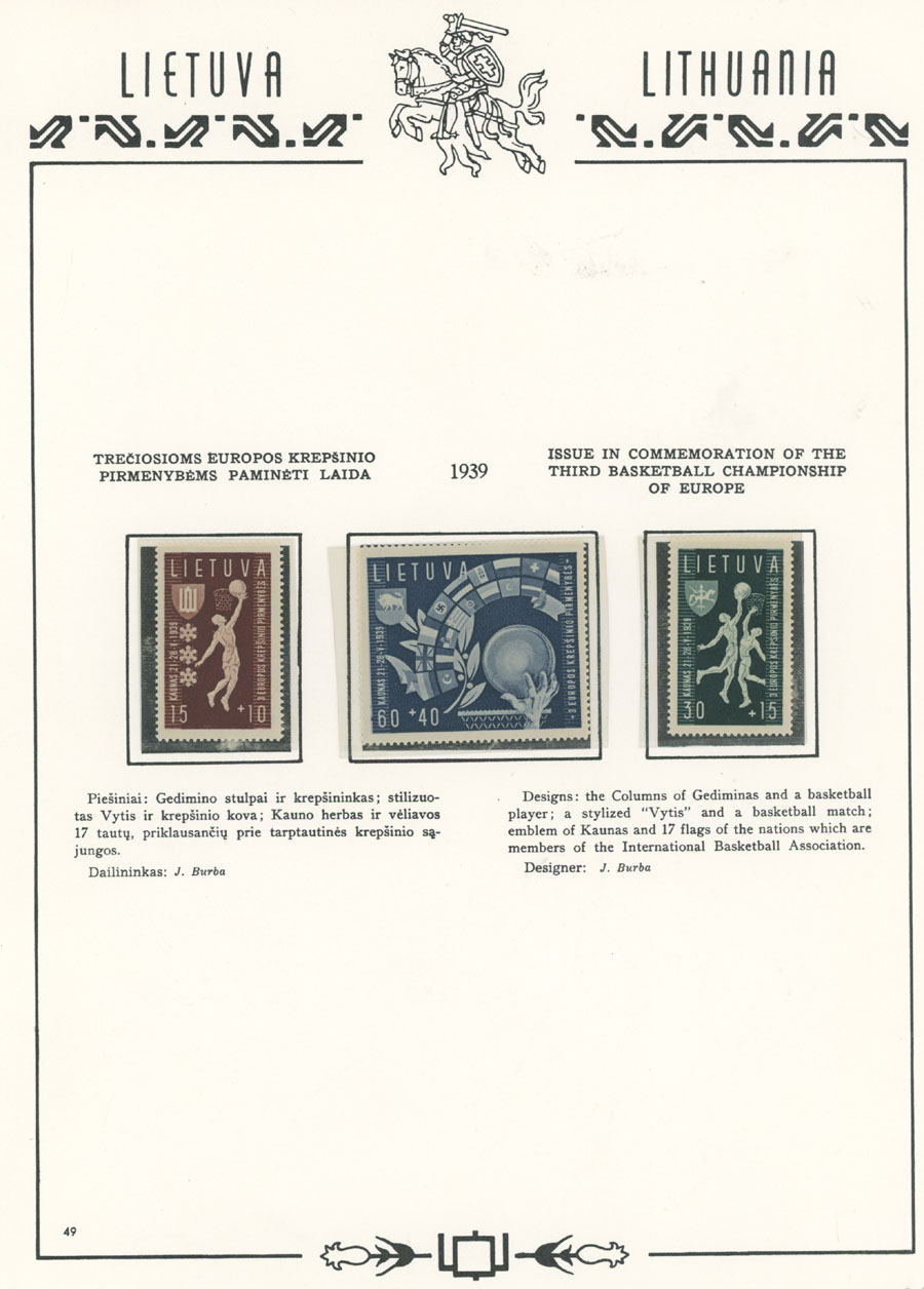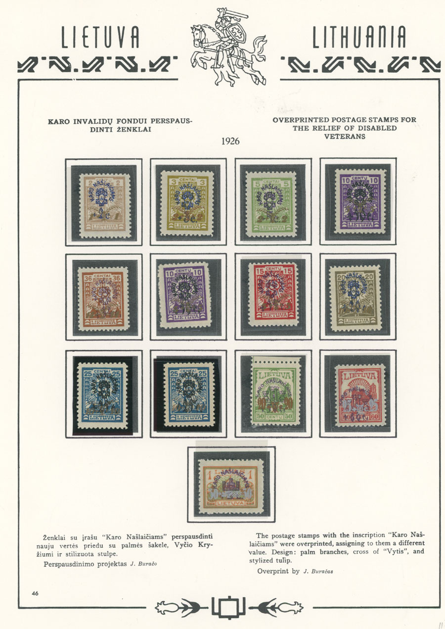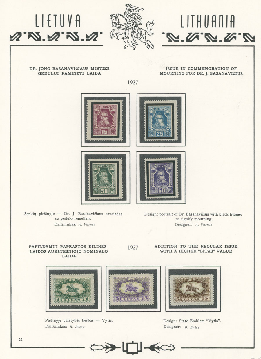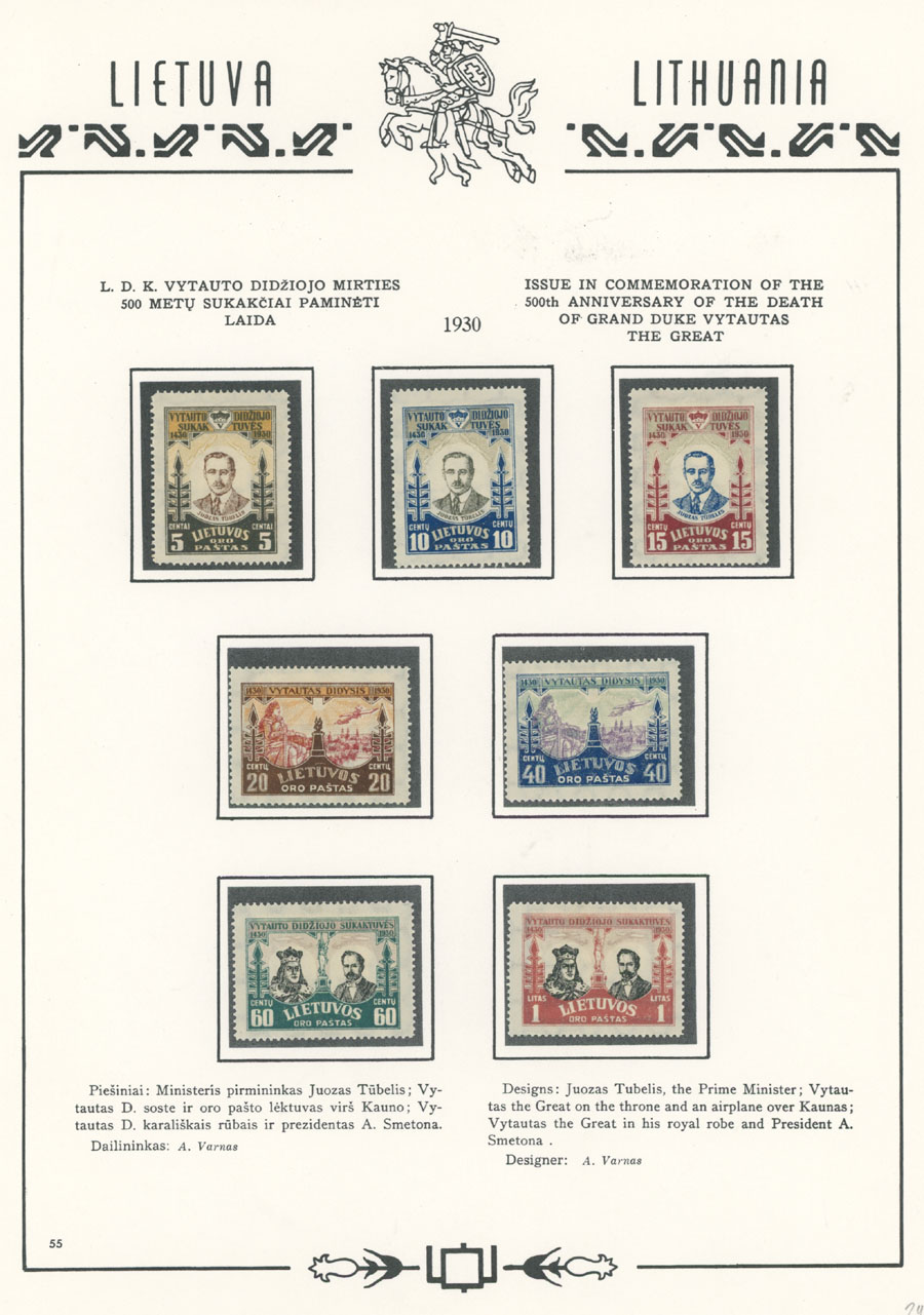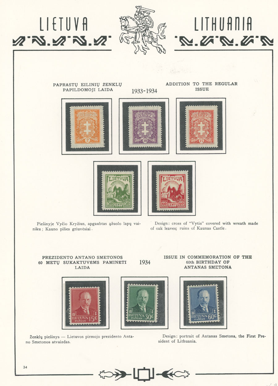 1916-41, over 550 mostly mint stamps (9 – used) and three souvenir sheets, representing postage, semi-postal, air post plus two occupation sets of the World War I and II, starting with first and second Vilnius issues, three Kaunas sets, including No.10a in block of four, then range of Berlin colored Arms issues, further surcharges including No.120-22 (two with APEX certificates and all three NH), continues with National Assembly changed colors issue, nice long definitives, including three semi-postal sets, apparently complete air post with Vaitkus overprint (Sanabria guarantee) plus many more, fresh material, full/large part of OG, mainly LH, F/VF, C.v. is over $5,250, Est. $2,000-$2,500, Scott #1/332, B1-54, C1-97