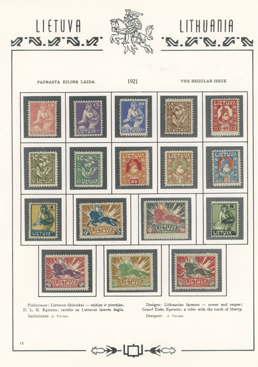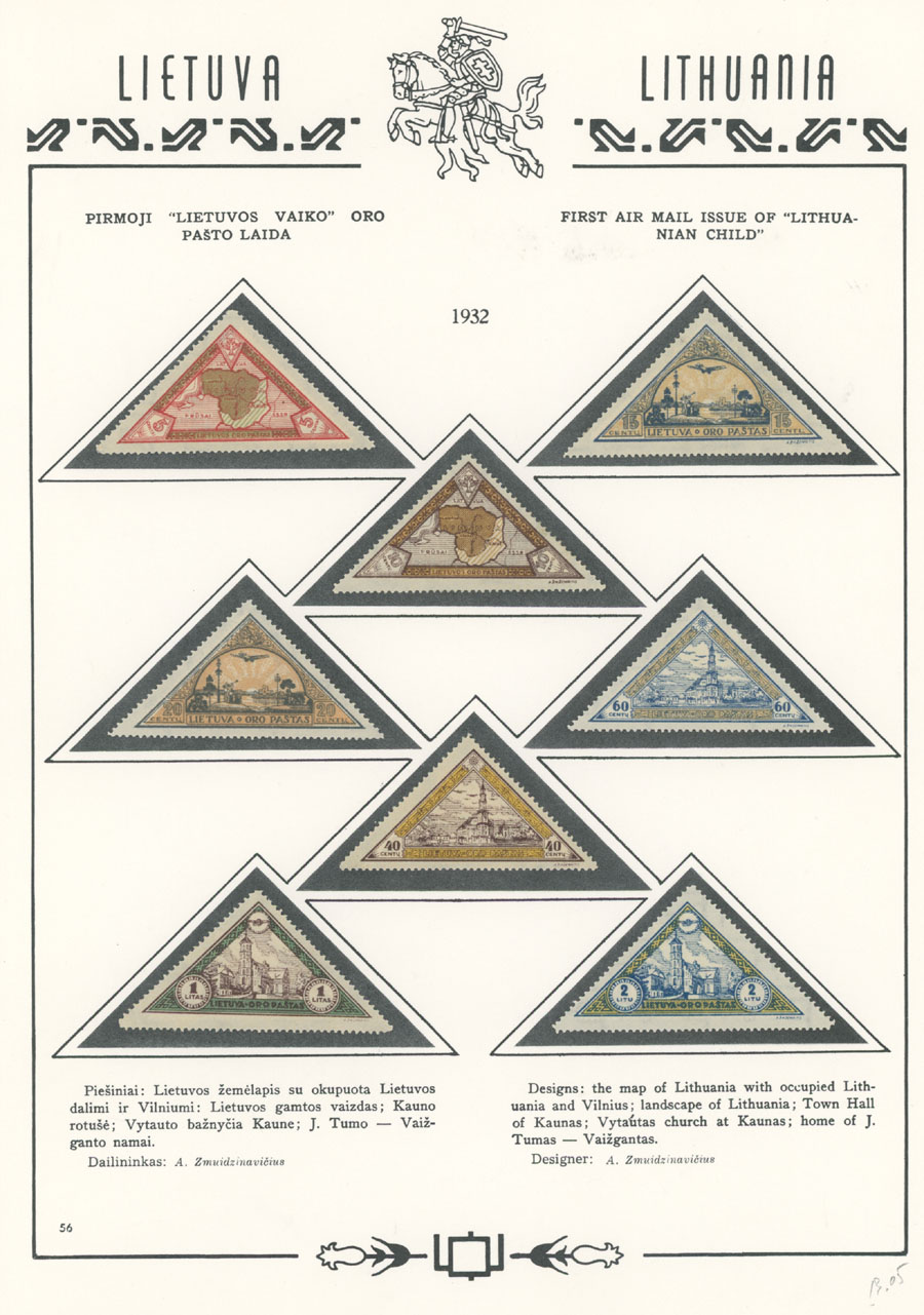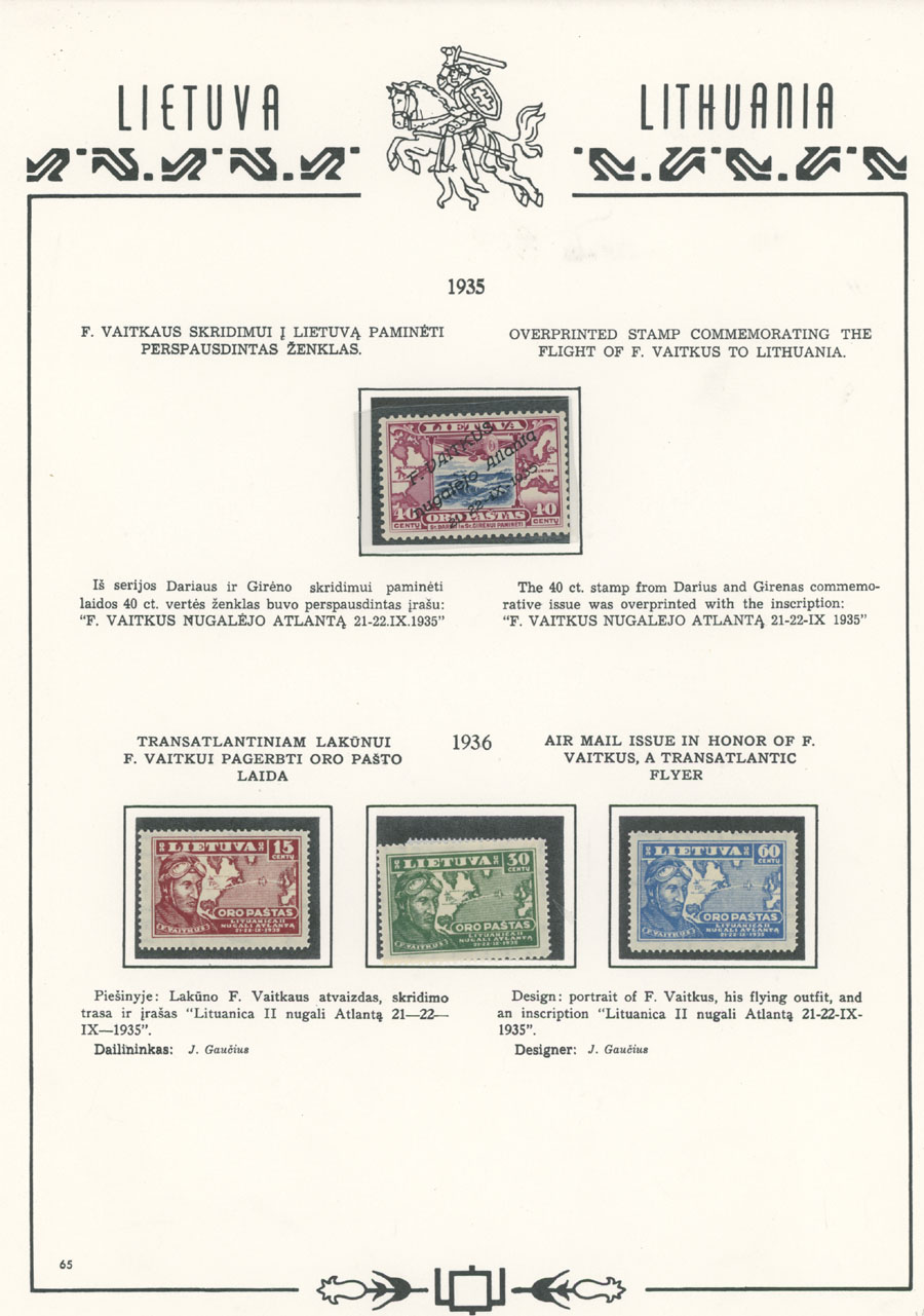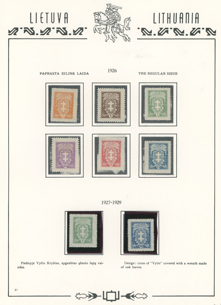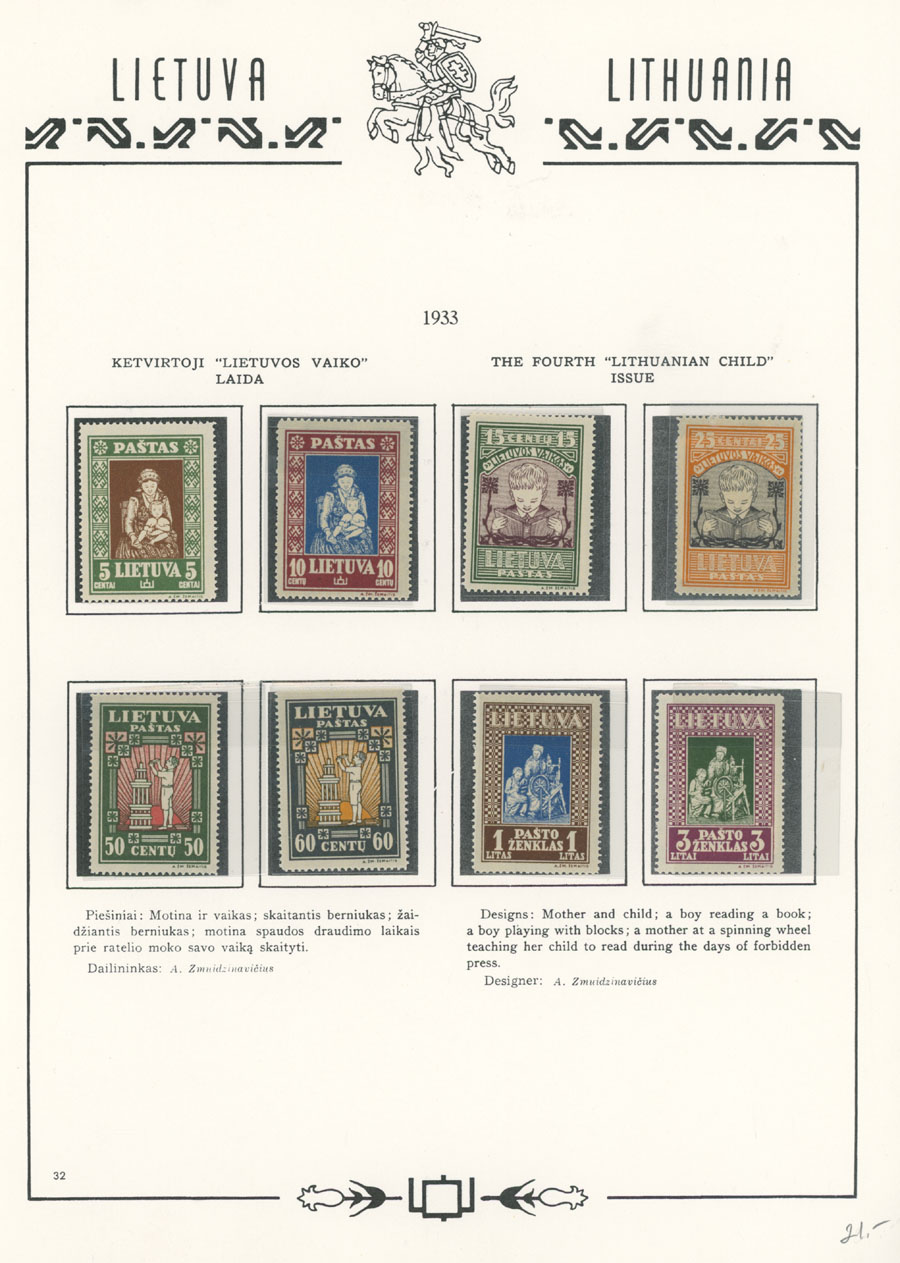 1916-41, over 550 mostly mint stamps (9 – used) and three souvenir sheets, representing postage, semi-postal, air post plus two occupation sets of the World War I and II, starting with first and second Vilnius issues, three Kaunas sets, including No.10a in block of four, then range of Berlin colored Arms issues, further surcharges including No.120-22 (two with APEX certificates and all three NH), continues with National Assembly changed colors issue, nice long definitives, including three semi-postal sets, apparently complete air post with Vaitkus overprint (Sanabria guarantee) plus many more, fresh material, full/large part of OG, mainly LH, F/VF, C.v. is over $5,250, Est. $2,000-$2,500, Scott #1/332, B1-54, C1-97