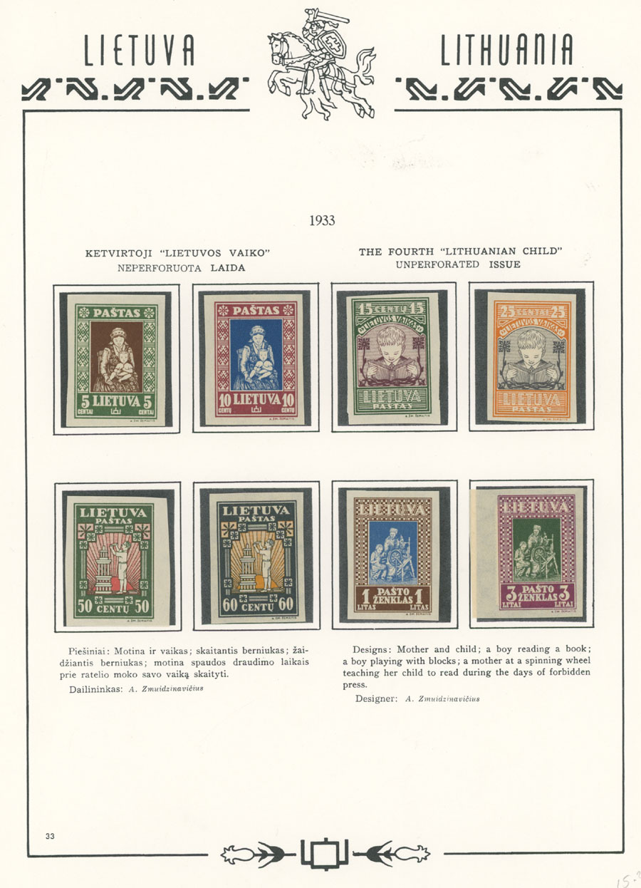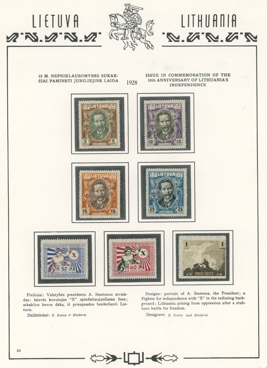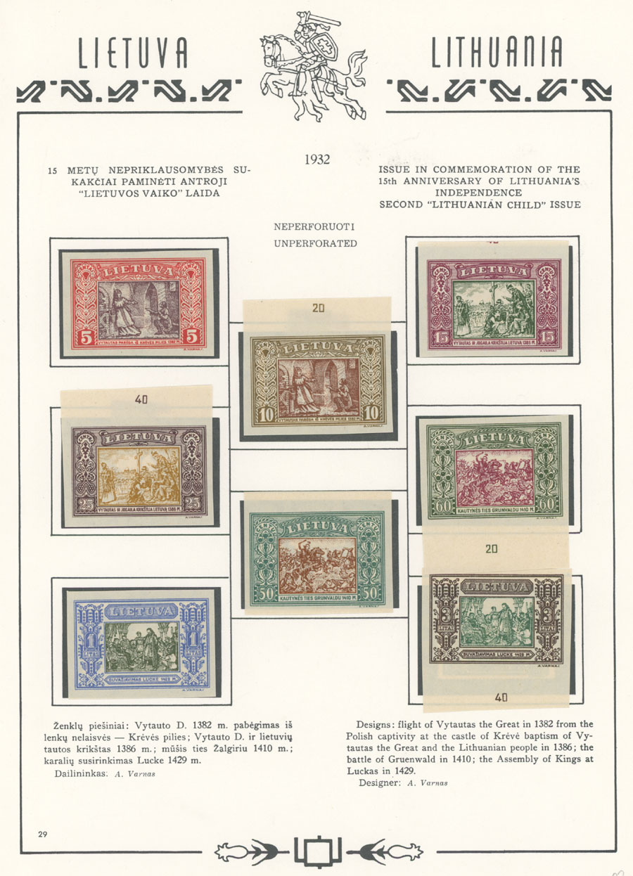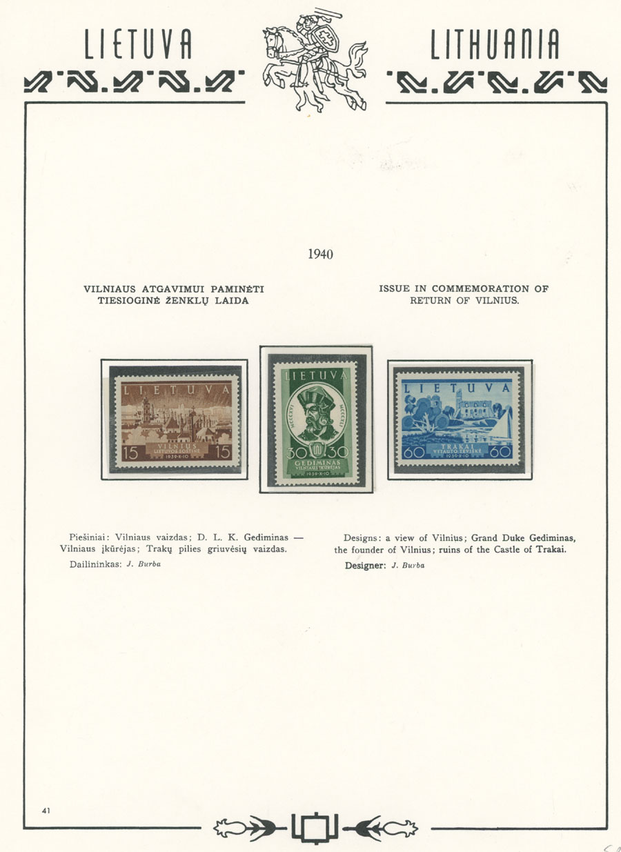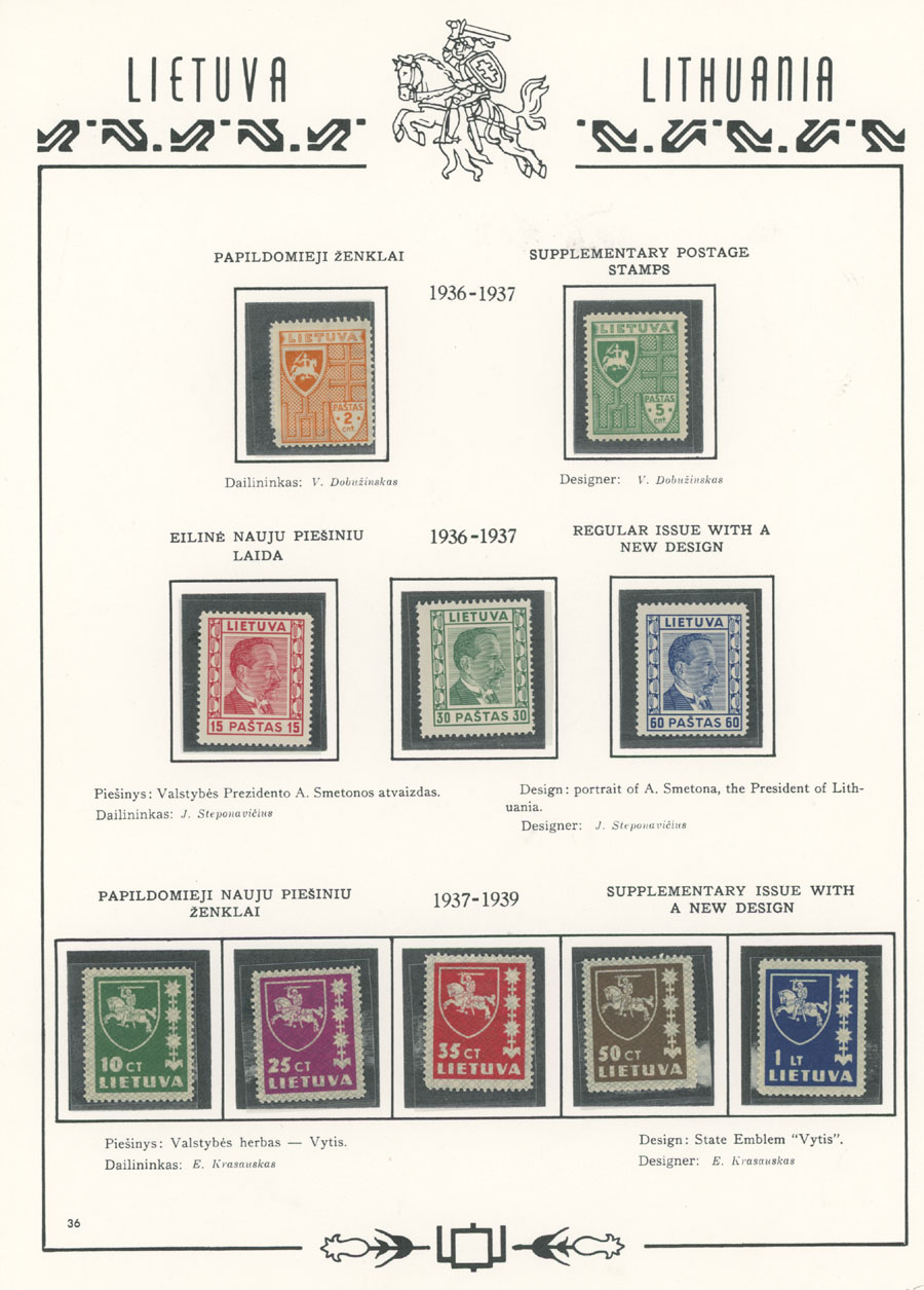 1916-41, over 550 mostly mint stamps (9 – used) and three souvenir sheets, representing postage, semi-postal, air post plus two occupation sets of the World War I and II, starting with first and second Vilnius issues, three Kaunas sets, including No.10a in block of four, then range of Berlin colored Arms issues, further surcharges including No.120-22 (two with APEX certificates and all three NH), continues with National Assembly changed colors issue, nice long definitives, including three semi-postal sets, apparently complete air post with Vaitkus overprint (Sanabria guarantee) plus many more, fresh material, full/large part of OG, mainly LH, F/VF, C.v. is over $5,250, Est. $2,000-$2,500, Scott #1/332, B1-54, C1-97