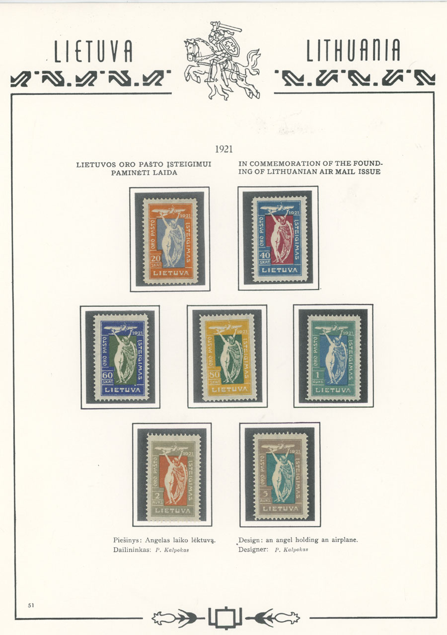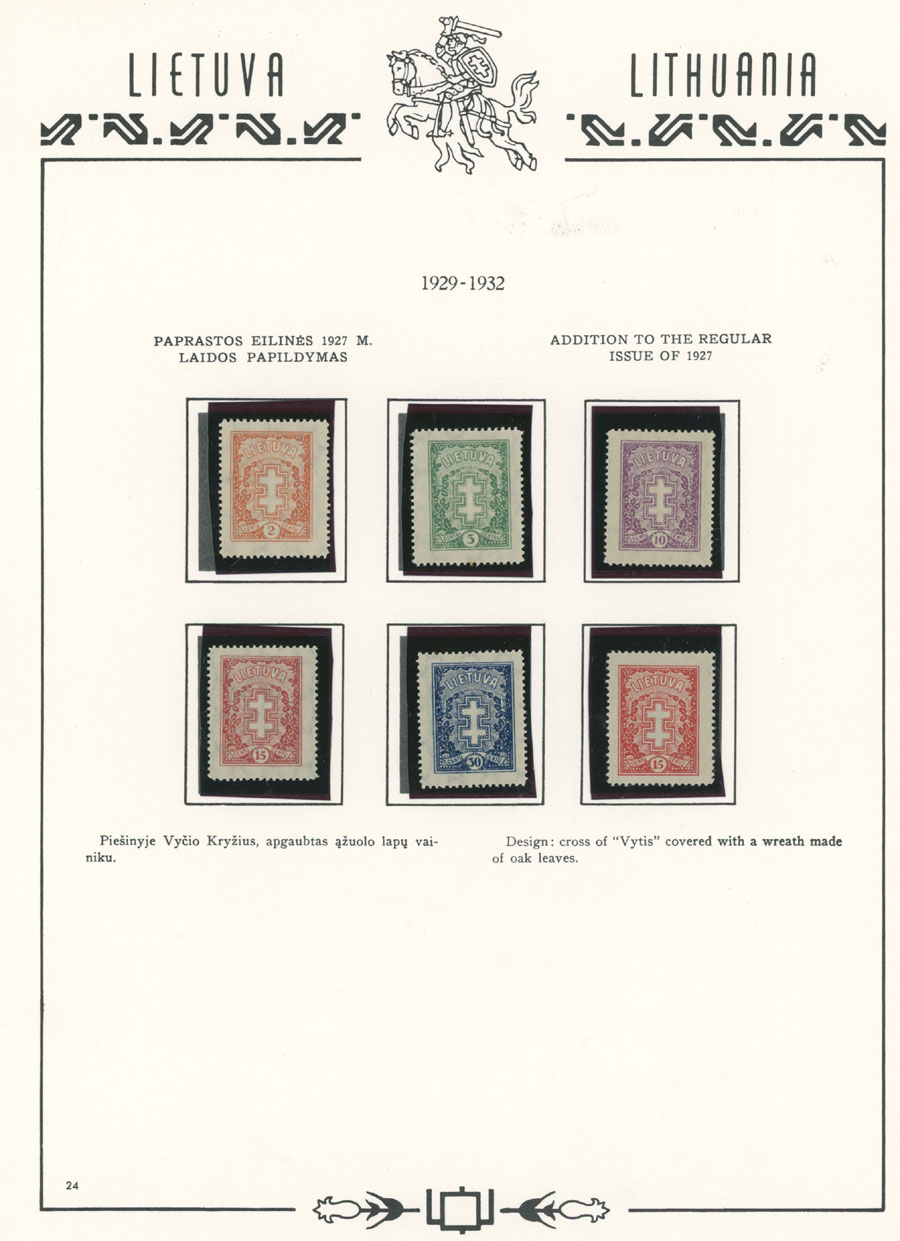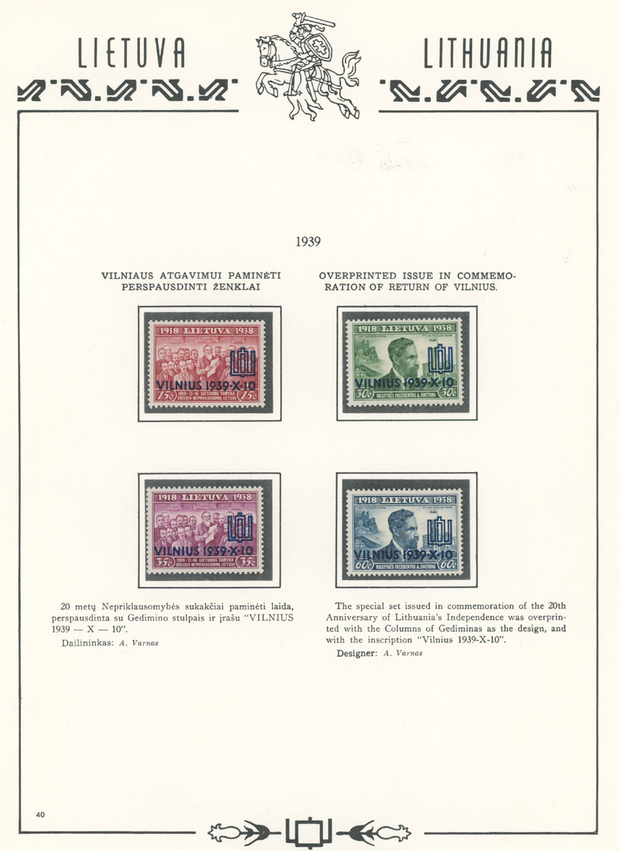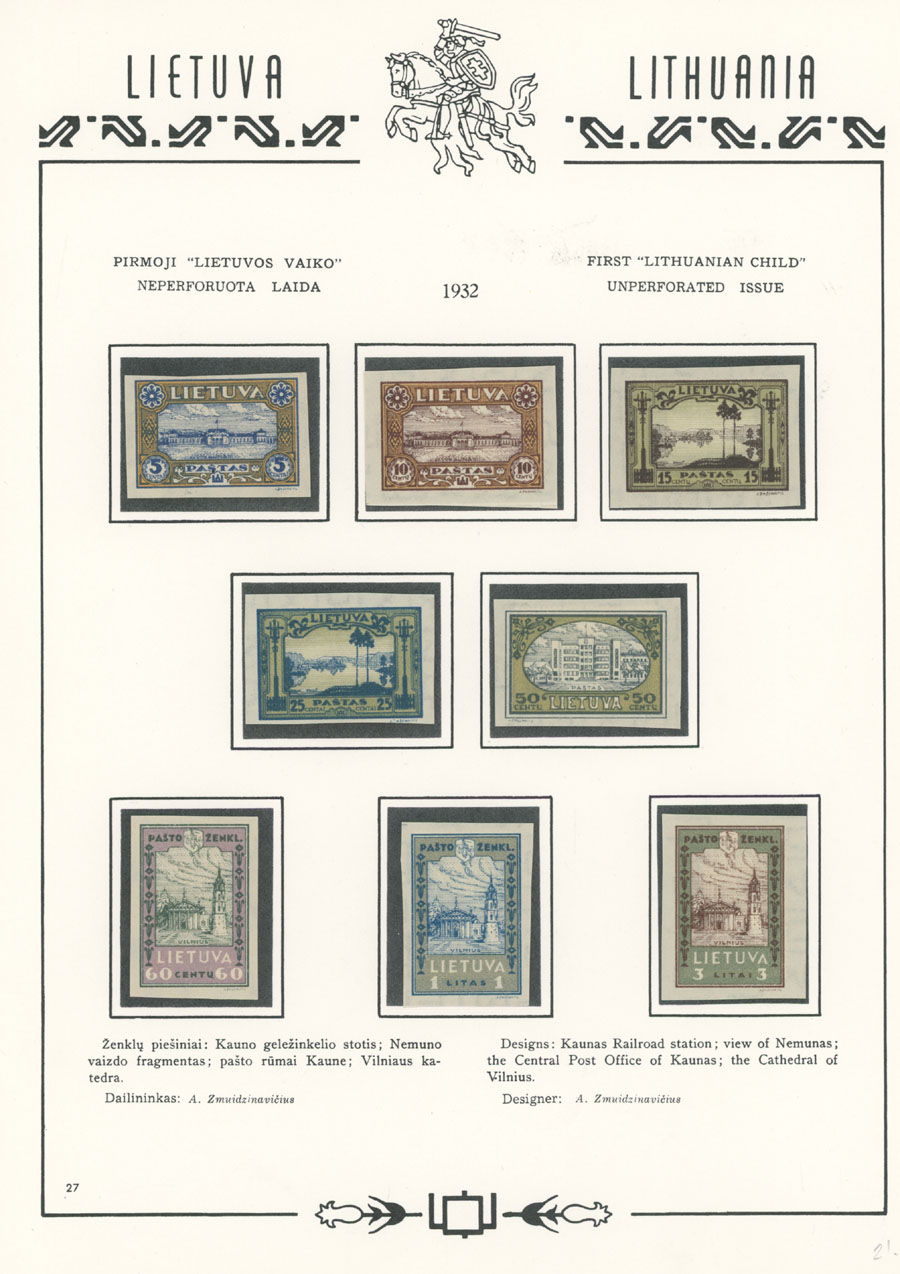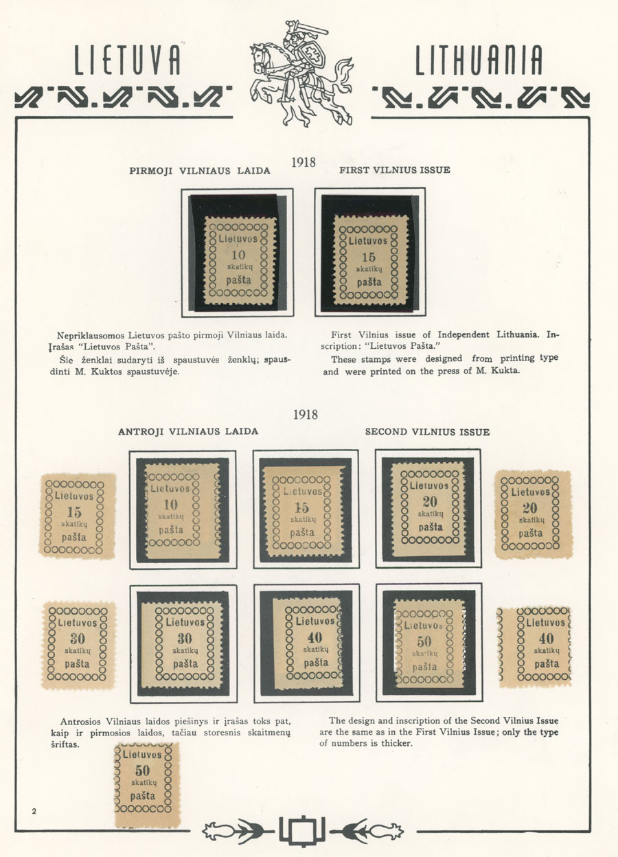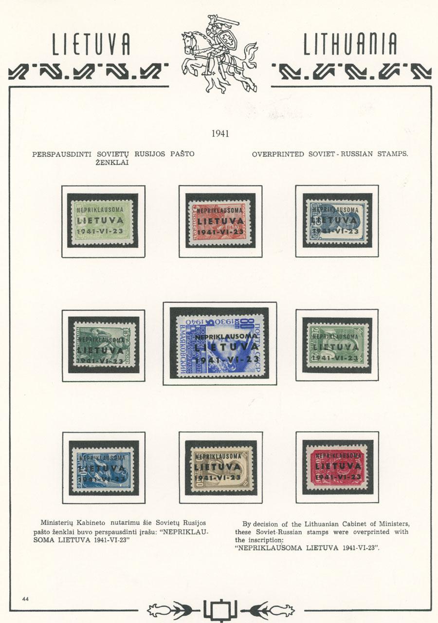 1916-41, over 550 mostly mint stamps (9 – used) and three souvenir sheets, representing postage, semi-postal, air post plus two occupation sets of the World War I and II, starting with first and second Vilnius issues, three Kaunas sets, including No.10a in block of four, then range of Berlin colored Arms issues, further surcharges including No.120-22 (two with APEX certificates and all three NH), continues with National Assembly changed colors issue, nice long definitives, including three semi-postal sets, apparently complete air post with Vaitkus overprint (Sanabria guarantee) plus many more, fresh material, full/large part of OG, mainly LH, F/VF, C.v. is over $5,250, Est. $2,000-$2,500, Scott #1/332, B1-54, C1-97