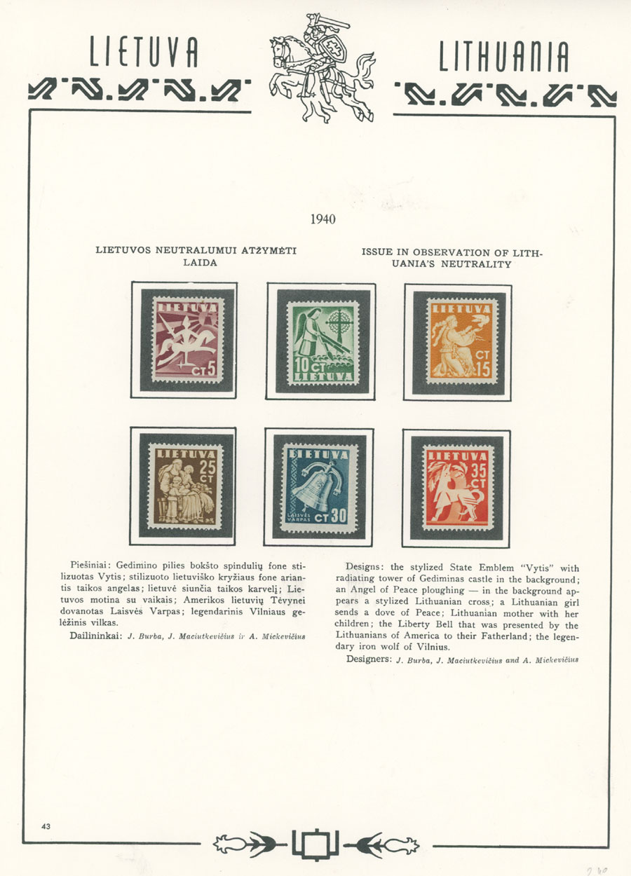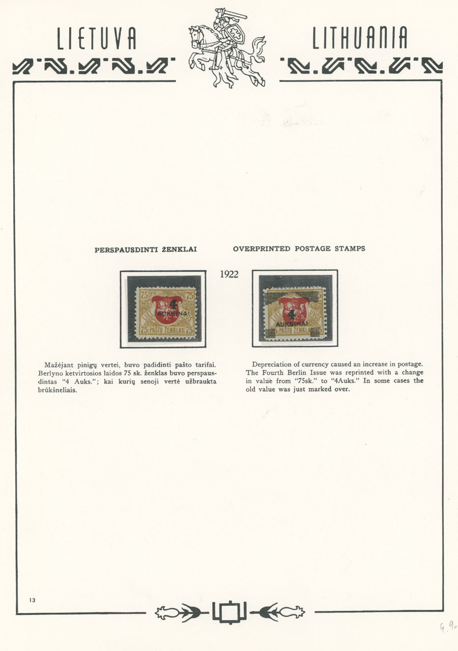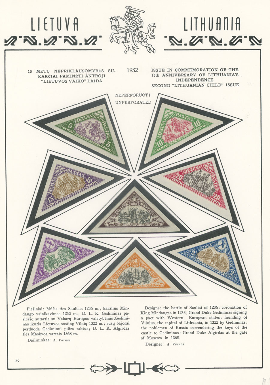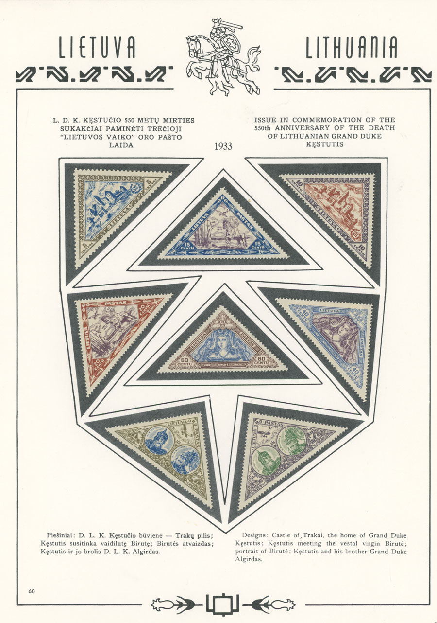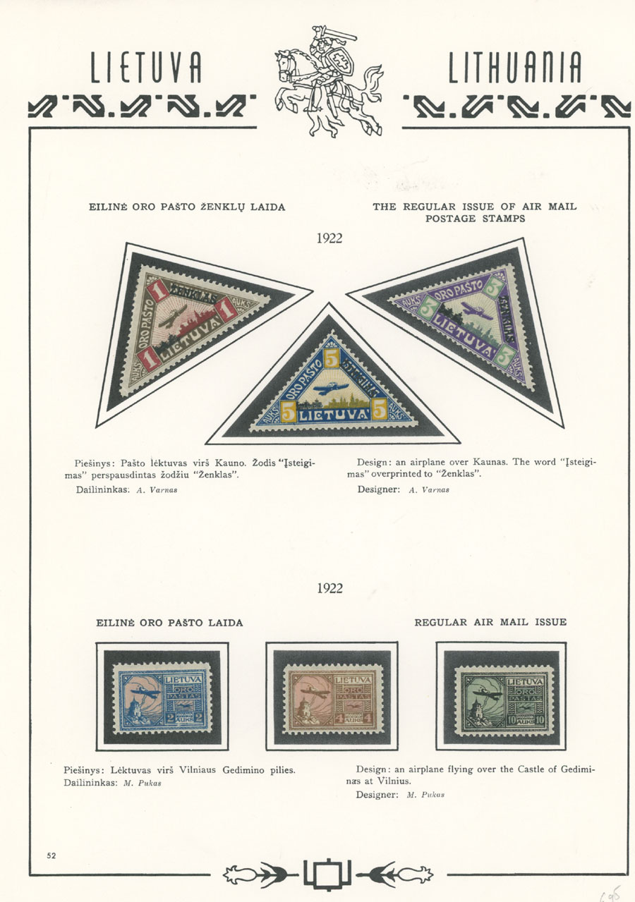 1916-41, over 550 mostly mint stamps (9 – used) and three souvenir sheets, representing postage, semi-postal, air post plus two occupation sets of the World War I and II, starting with first and second Vilnius issues, three Kaunas sets, including No.10a in block of four, then range of Berlin colored Arms issues, further surcharges including No.120-22 (two with APEX certificates and all three NH), continues with National Assembly changed colors issue, nice long definitives, including three semi-postal sets, apparently complete air post with Vaitkus overprint (Sanabria guarantee) plus many more, fresh material, full/large part of OG, mainly LH, F/VF, C.v. is over $5,250, Est. $2,000-$2,500, Scott #1/332, B1-54, C1-97