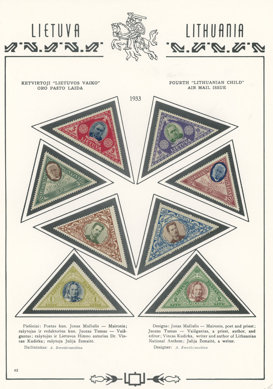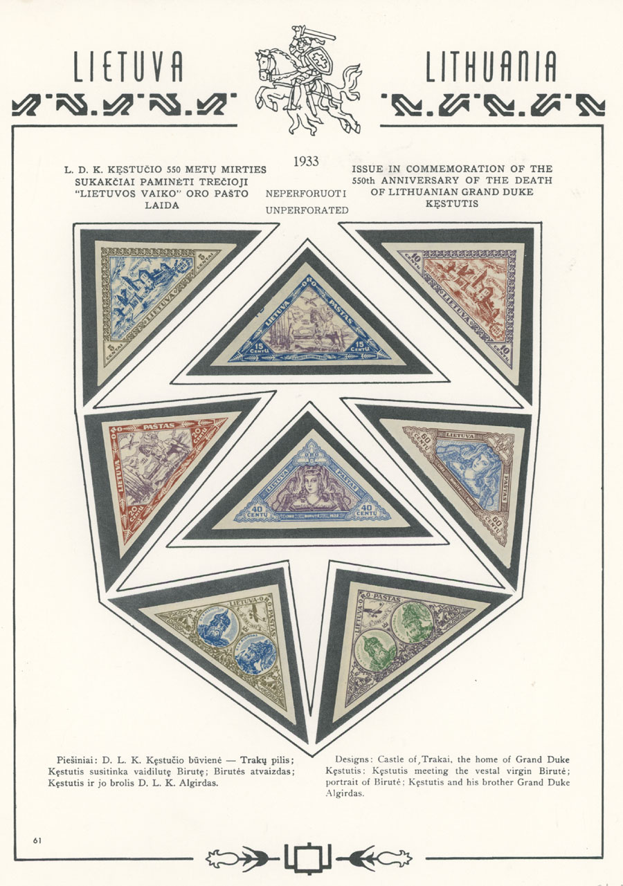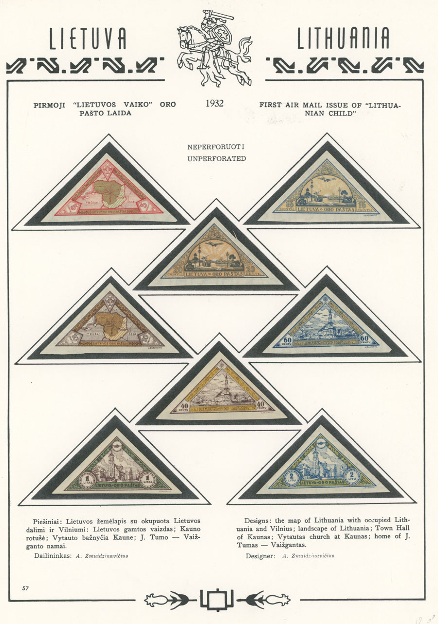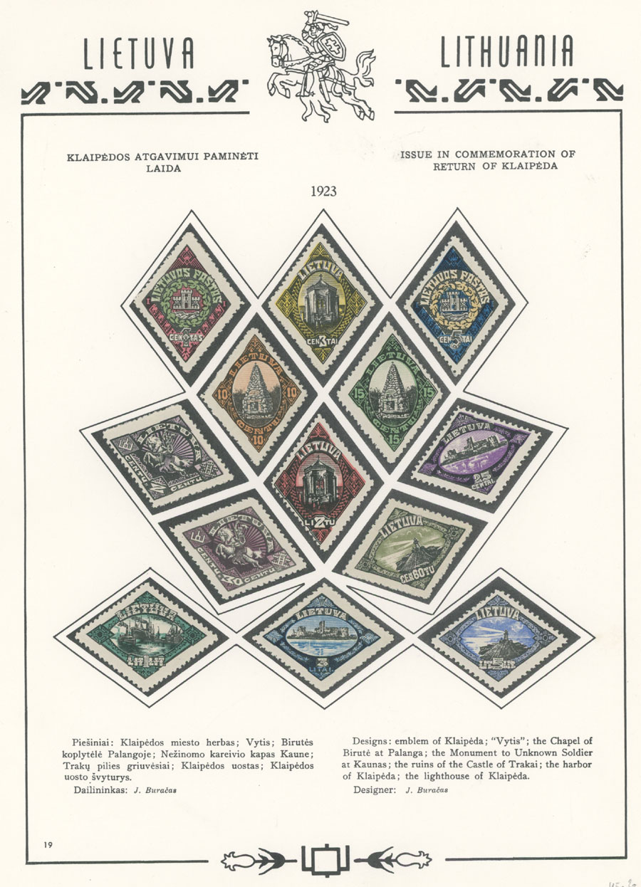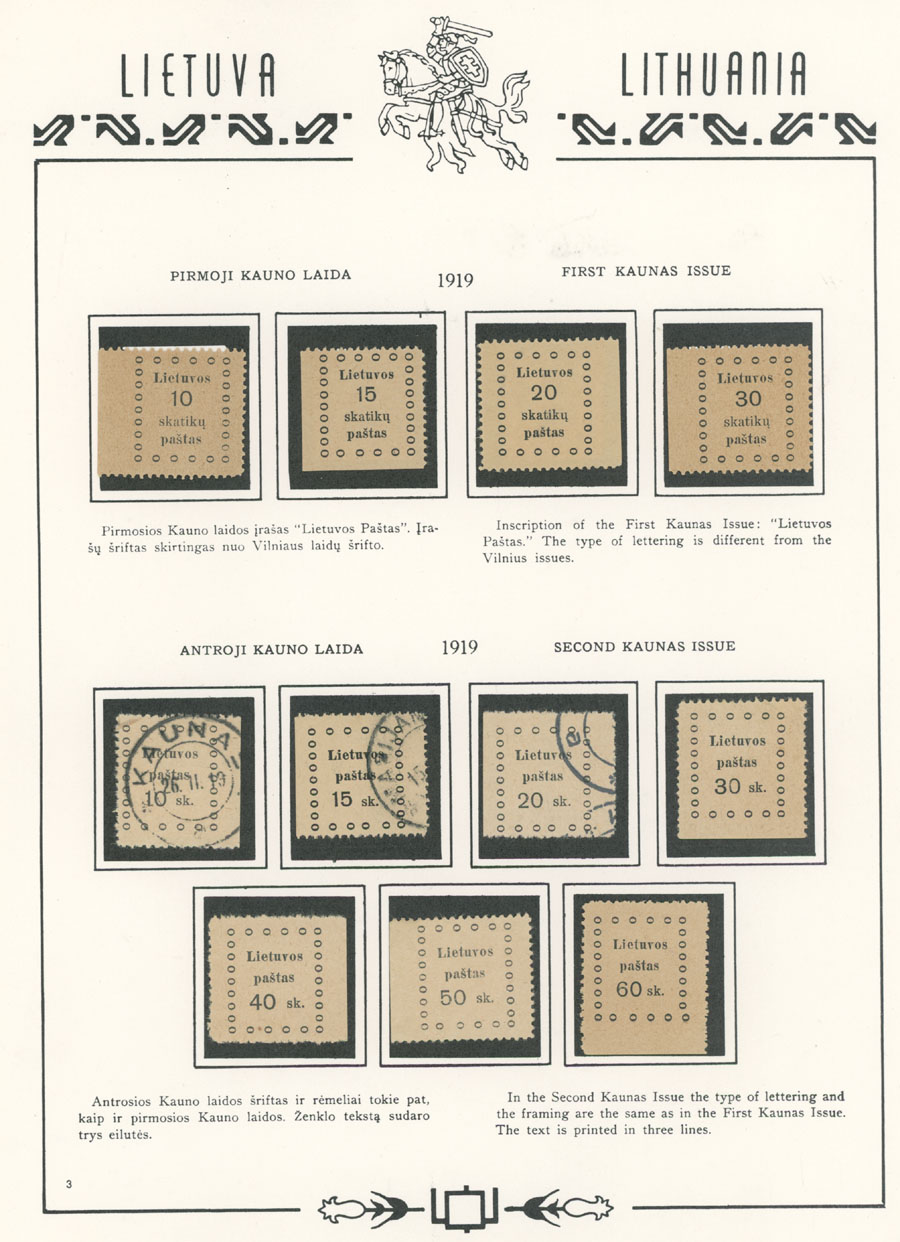 1916-41, over 550 mostly mint stamps (9 – used) and three souvenir sheets, representing postage, semi-postal, air post plus two occupation sets of the World War I and II, starting with first and second Vilnius issues, three Kaunas sets, including No.10a in block of four, then range of Berlin colored Arms issues, further surcharges including No.120-22 (two with APEX certificates and all three NH), continues with National Assembly changed colors issue, nice long definitives, including three semi-postal sets, apparently complete air post with Vaitkus overprint (Sanabria guarantee) plus many more, fresh material, full/large part of OG, mainly LH, F/VF, C.v. is over $5,250, Est. $2,000-$2,500, Scott #1/332, B1-54, C1-97