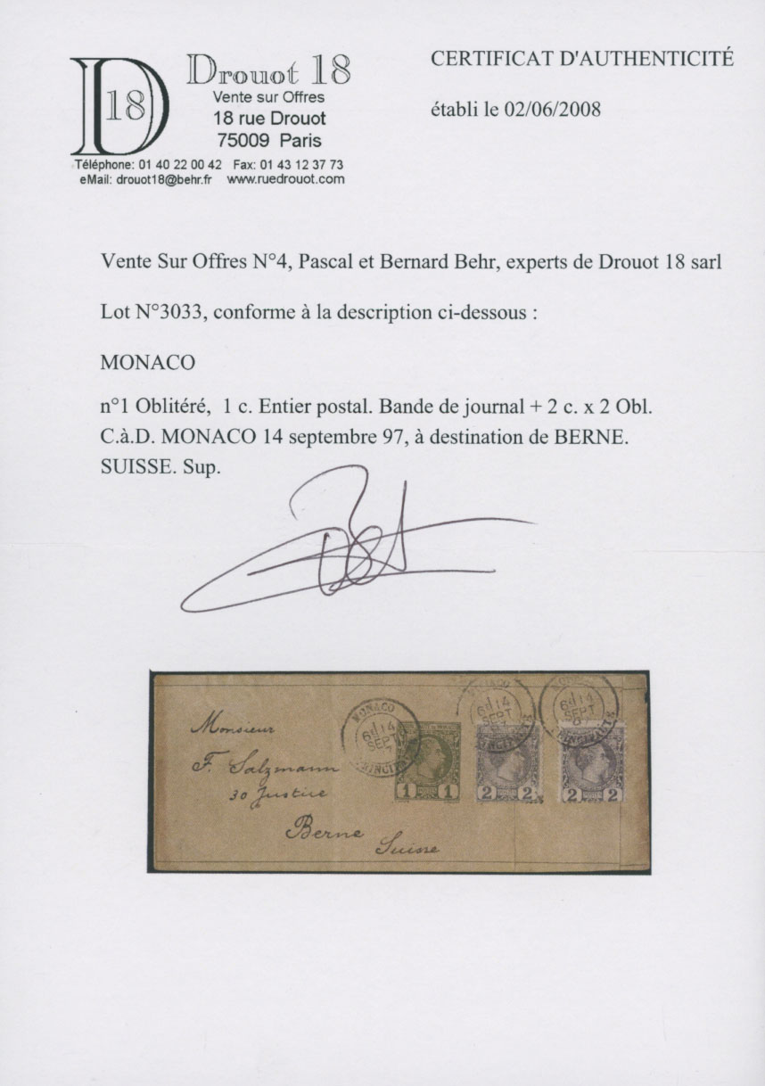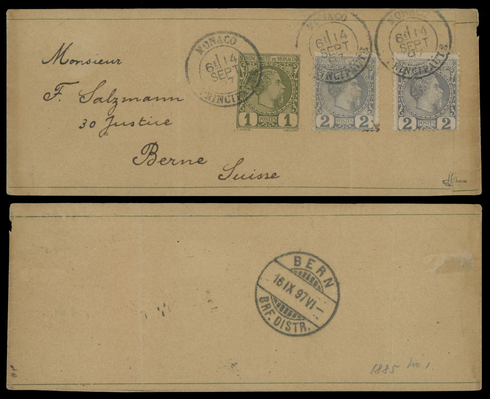 1897 (September 14), entire stationery wrapper 1c olive green, uprated with two stamps of Prince Charles III 2c dull lilac, sent to Switzerland, Berne ”16.IX.97” arrival ds on reverse, mostly VF and scarce, expertized by J.- F. Brunn, P. and B. Behr certificate, C.v. $525 for one stamp of No.2 uprating a stationery item, Est. $400-$500, Scott #2