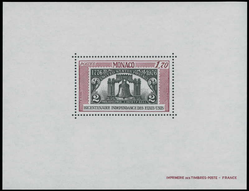 1976, American Bicentennial, 1.70fr carmine and black, perforated special souvenir sheet, perfect condition, full OG, NH, VF, Yvert #BF9, C.v. €1,300, Est. $250-$300 , Scott #1021 var