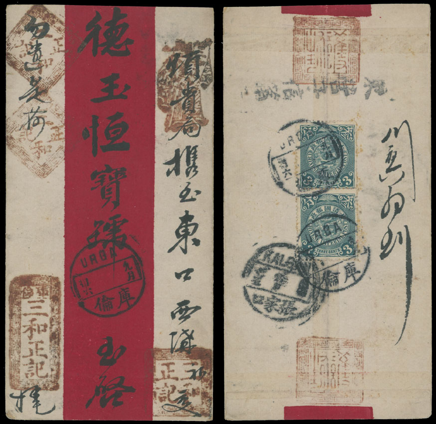 CHINESE STAMPS USED IN MONGOLIA: 1912 (September 26), red band cover from Urga to Kalgan, franked by vertical pair of Chinese Imperial Post 3c slate green, Kalgan arrival marking of October 5, mostly VF and scarce, expertized by Dr. Orth, Est. $600-$700, Scott #125