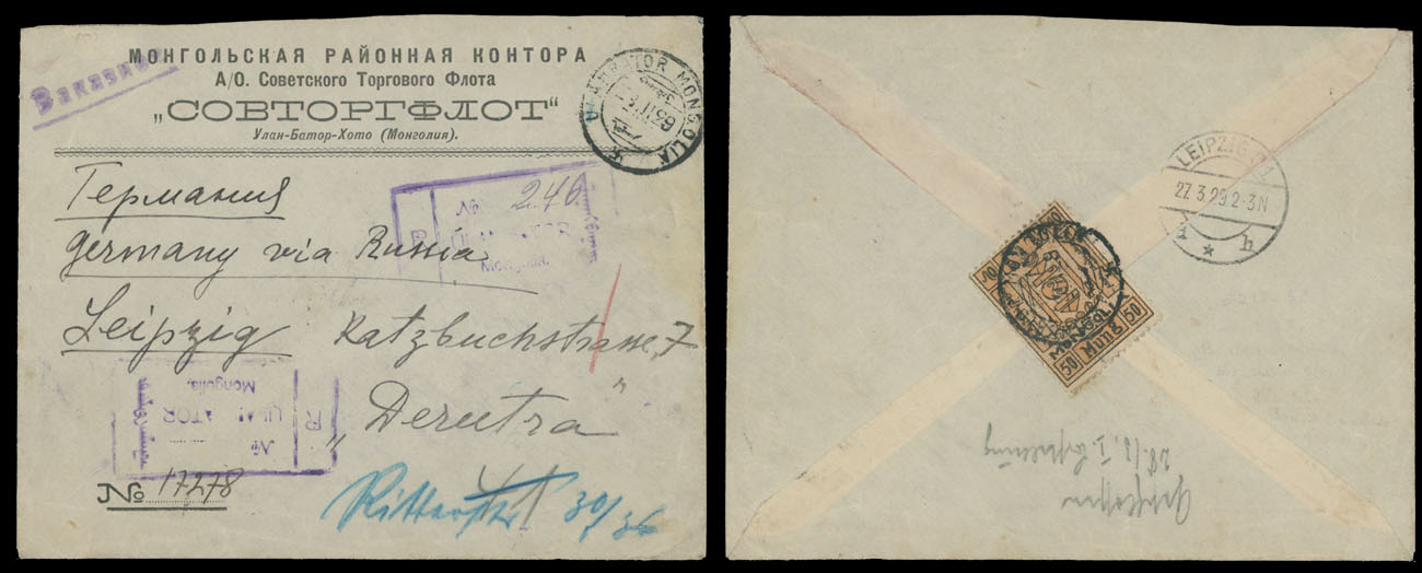 1929 (March 9), Sov-Torg-Flot (Soviet Merchant Fleet) pre-printed envelope sent by registered mail from Ulaanbaatar to Germany, franked by Soyombo 50m buff and black, Leipzig ”27.3.29” arrival marking, F/VF, Est. $300-$350 , Scott #41