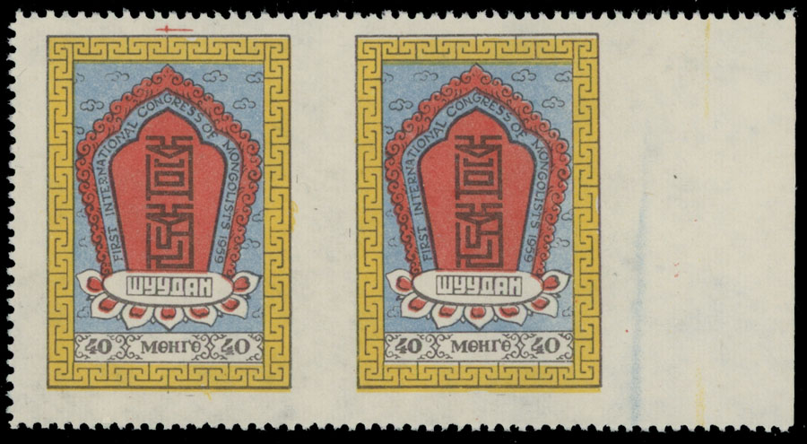 1959, Mongolian Language Congress, 40m multicolored, right sheet margin horizontal pair, imperforate vertically between stamps and on the right, full OG, NH, VF, Est. $150-$180 , Scott #175a