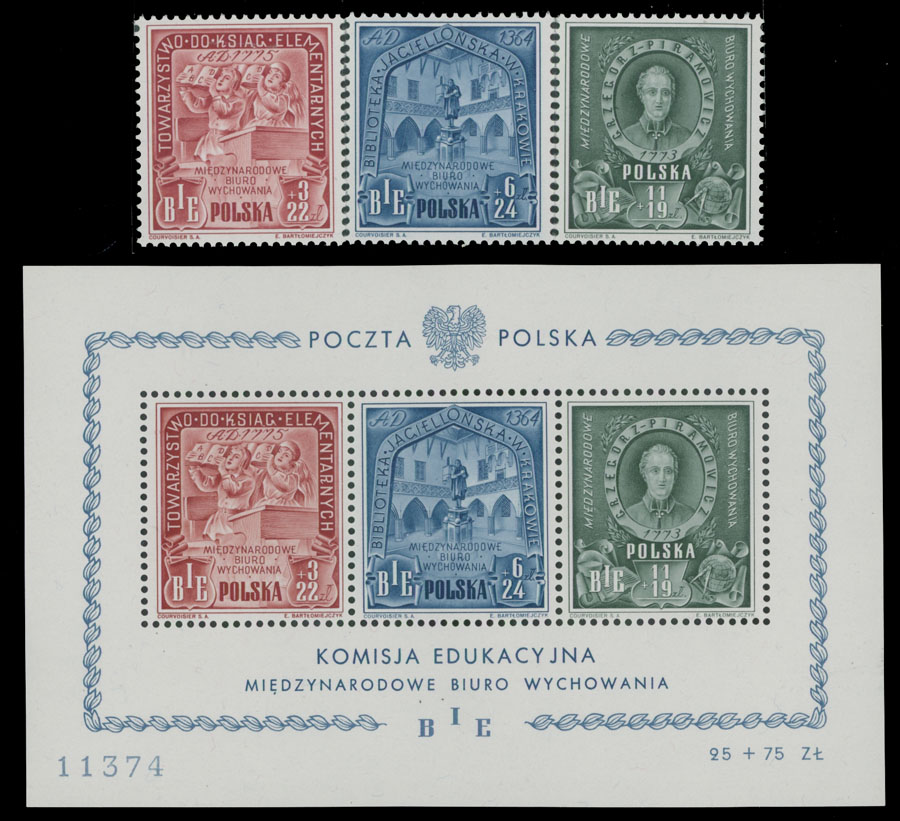 1946, Educational Works, 3+22zl – 11+19zl, complete set of three and souvenir sheet bearing the same stamps, numbered at the bottom with ”11374”, full OG, NH, VF, C.v. $595, Est. $250-$300 , Scott #B49-B49B, a