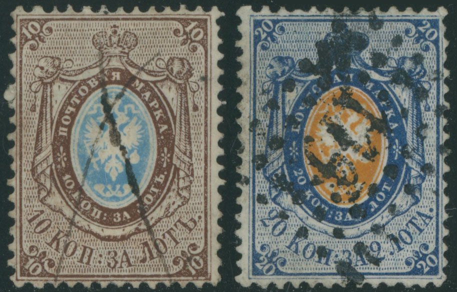 1858, Coat of Arms, 10k brown and blue, watermark numeral ”1”, pen cross cancelled; 20k blue and orange, watermark numeral ”2”, ”114” inside rectangular dotted cancellation (Lugansk), both with intact perforation 14½x15, mostly VF, C.v. $1,875, Est. $700-$800, Scott #2-3