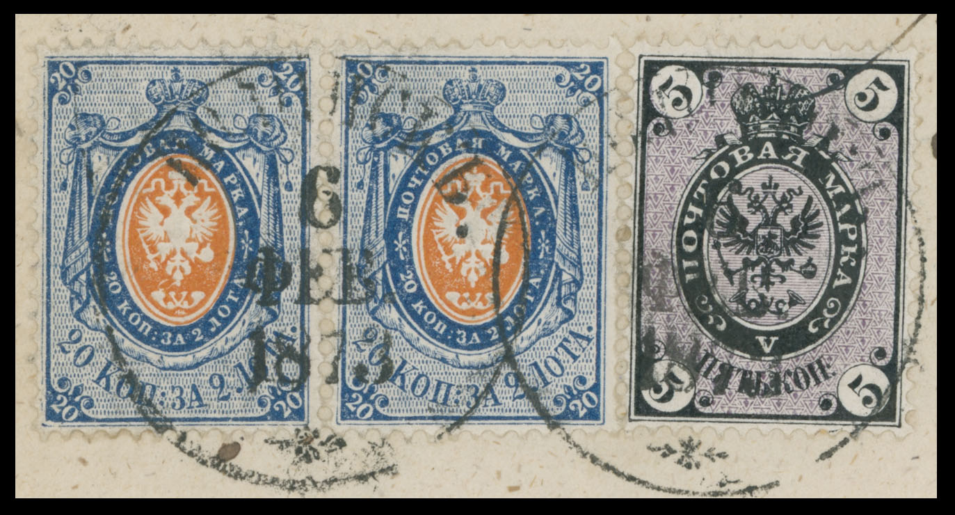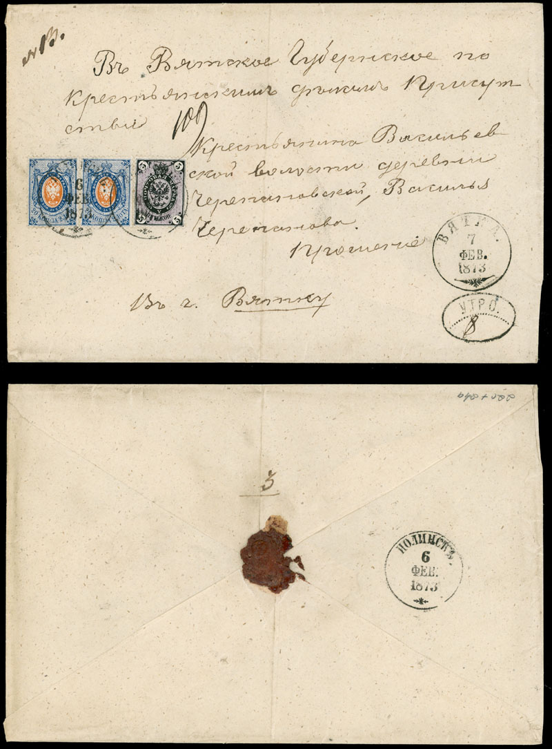 1873 (February 7), a single of 5k and 20k in horizontal pair, three stamps printed on vertically(!) laid paper, used on cover from Vasilievskaya volost via Nolinsk to Vyatka, all appropriate markings and arrival ds, light filing fold, still VF and rare mailing, C.v. $1,120, Est. $500-$600, Scott #22c, 24a