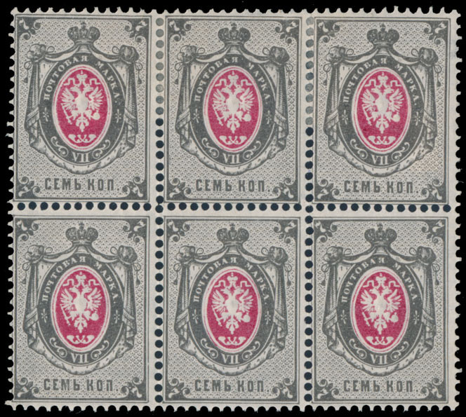 1879, 7k gray and rose, printed on horizontally laid paper, block of six (3×2), bottom right stamp with short scepter variety, full OG, NH or LH (top stamps), VF, C.v. $210 for single common stamps, Est. $150-$200 , Scott #27, var