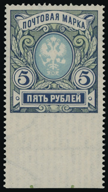 1906, 5r dark blue, green and pale blue, perforation 13½, bottom sheet margin single printed on vertically laid paper, imperforate at foot, full OG, NH, VF and rare in pristine condition, Est. $1,000-$1,200 , Scott #71 var