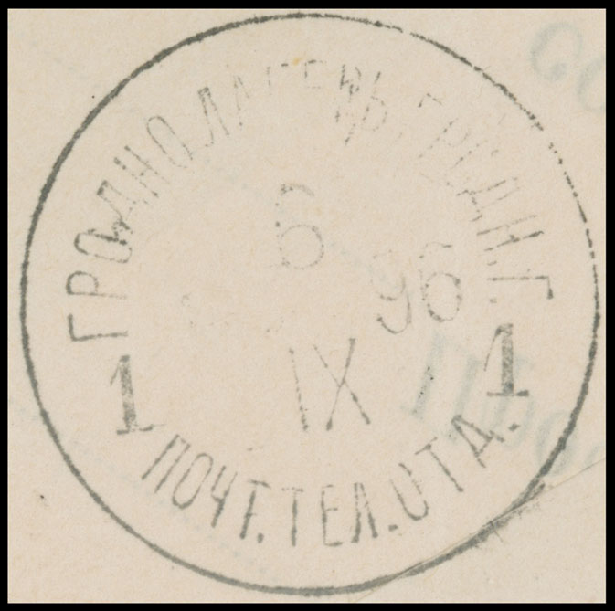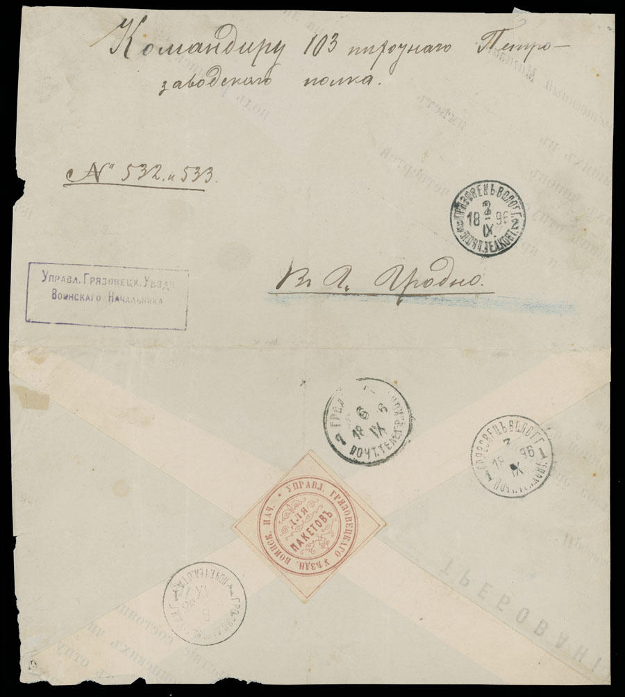 1896 (September 3), official (free-frank) cover from Griazovets Office of the Military Chief (Vologda Gub.) to commander of 103rd Petrozavodsk Infantry Regiment located in Grodno Camp official paper seal and Grodno 6.IX.96” ds on reverse VF and rare military camp item, Est. $250-$300