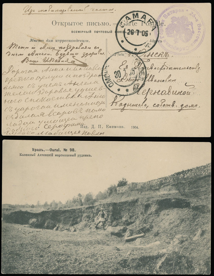 1905 (July 26), postcard from 26th East Siberian Mountain Battery to Omsk, endorsed ”From the Mobilized Military Unit”, which was located in Samara before going to the battle-front, arrival marking ”30.07.05” is alongside, VF and very unusual military mailing of the Russo- Japanese War period, Est. $200-$250