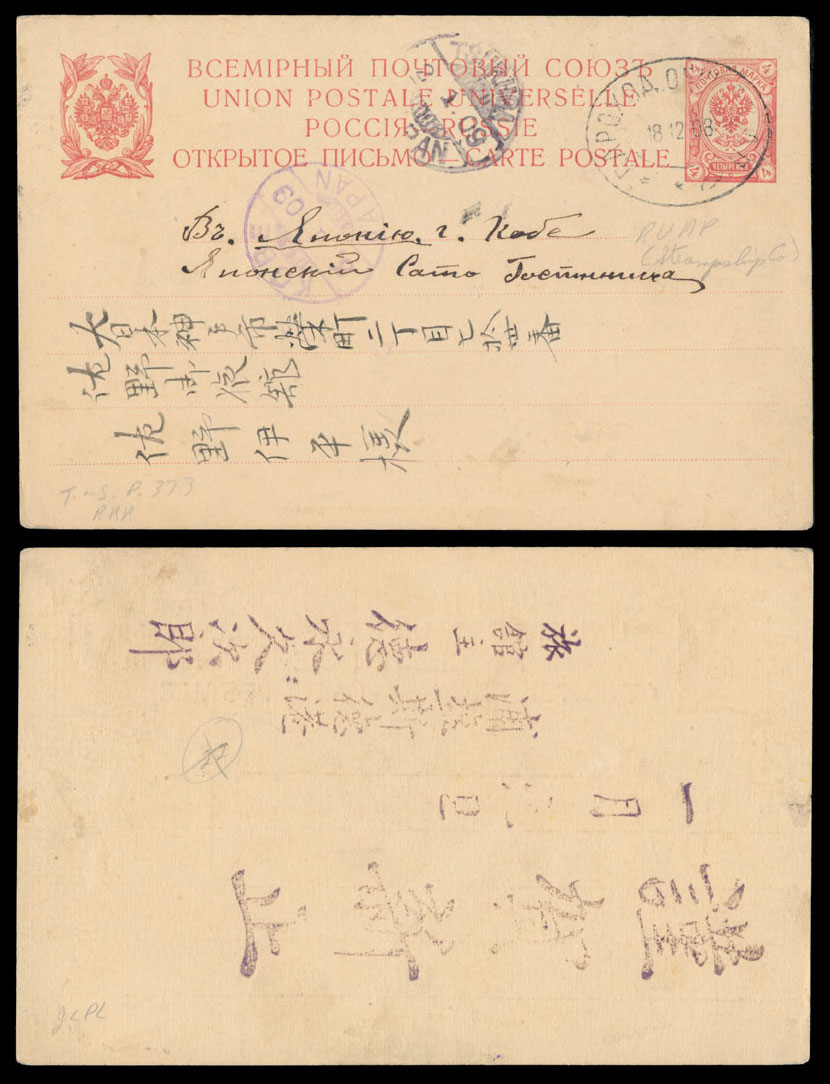 1908 (December 18), postal stationery card 4k red, mailed from a vessel of R.V.A.P. (Russian Eastern Asian Steamship Company), addressed to Kobe, written in Japanese, tied with black oval letter ”d” marking, Tsuruga transit and Kobe arrival ds, VF, Est. $300-$350