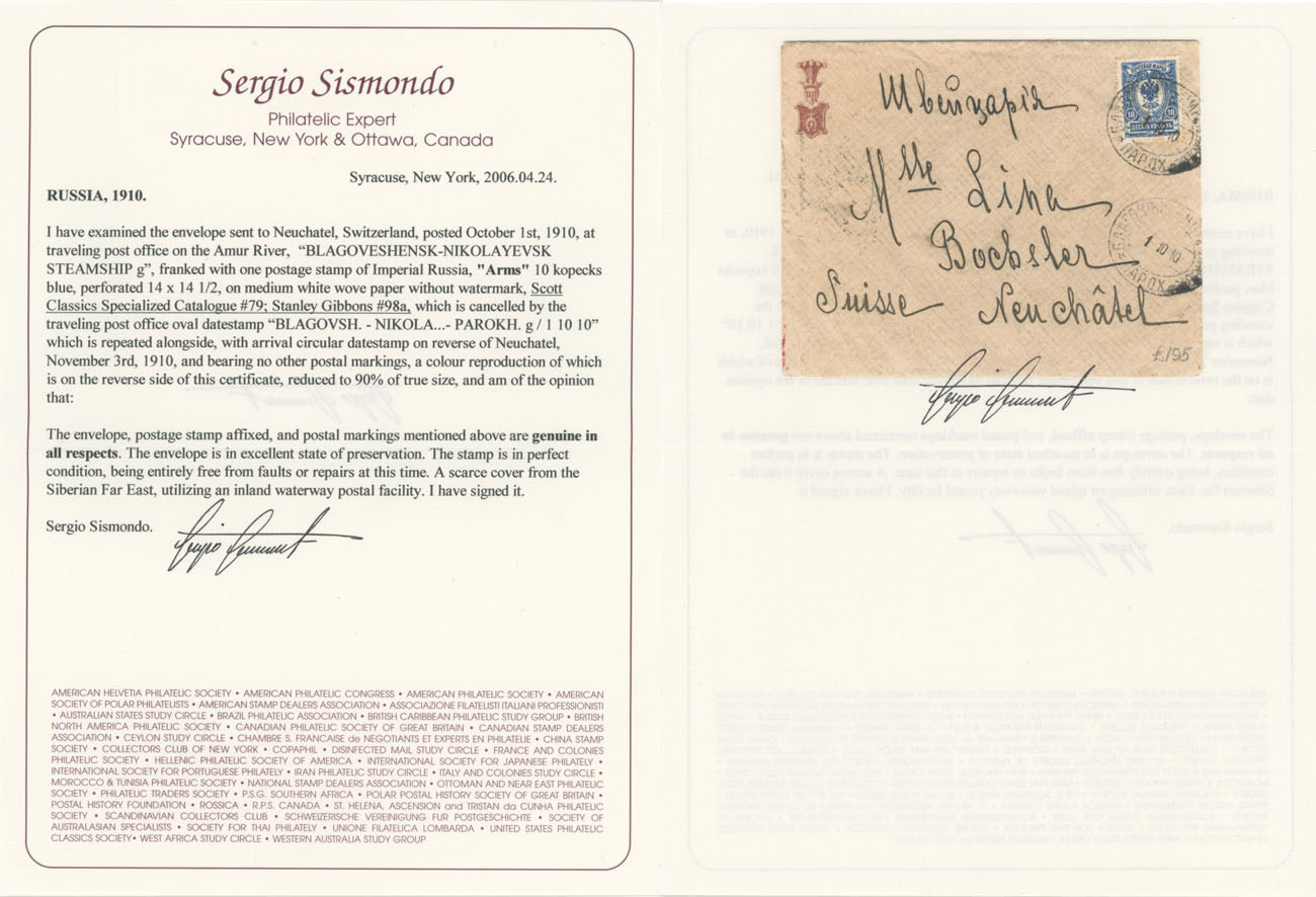1910 (October 1), cover mailed from the board of a steamship ”Blagoveschensk – Nikolayevsk”, addressed to Switzerland, franked by 10k light blue, tied with oval steamship ds, Neuchatel ”3.XI.10” arrival marking on reverse, VF and scarce, S. Sismondo certificate, Est. $400-$500, Scott #79a