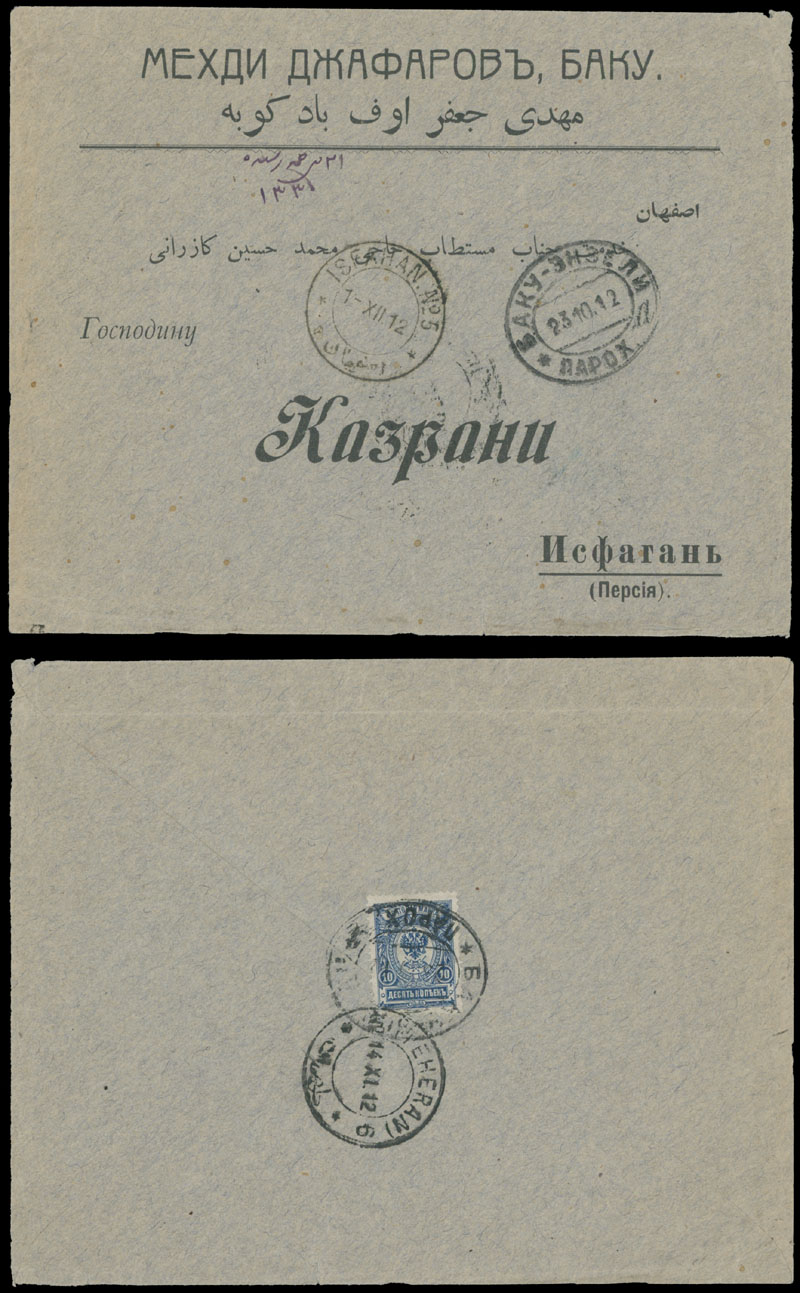 1912 (October 23), pre-printed cover mailed from the board of a steamship Baku-Enzeli, franked on reverse with 10k blue, appropriate oval date stamp, addressed to Isfahan, Tehran ”14.XI.12” transit on the back and ”1-.XII.12” arrival on front, F/VF, Est. $250-$300, Scott #79b