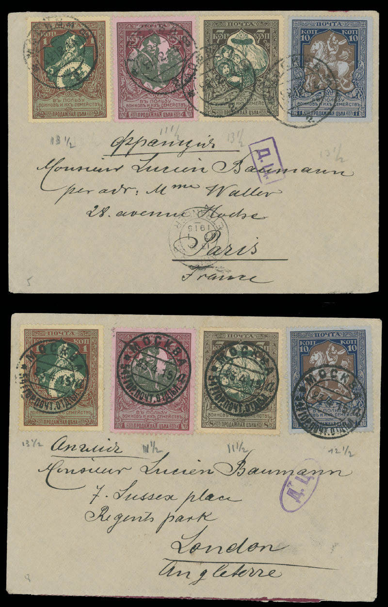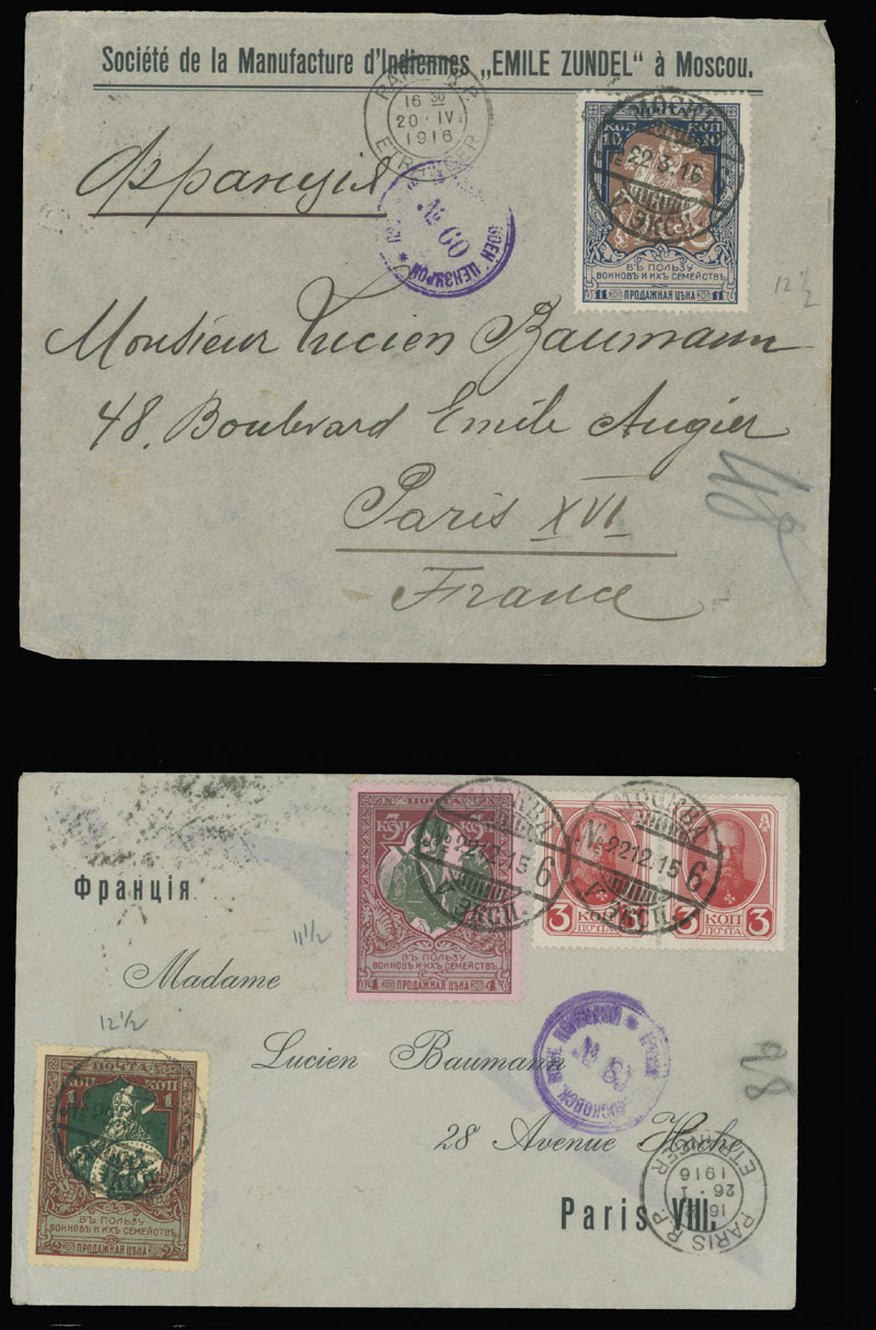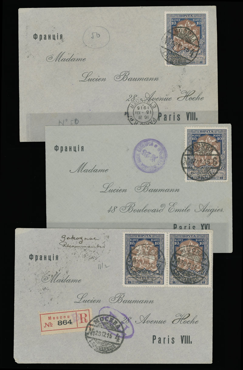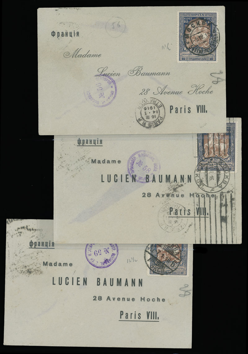MOSCOW CENSORSHIP MARKINGS: 1915-16, ten items franked by World War Charity stamps (various perforation), each one bearing different censorship handstamp – small box, small and large oval ”D.C.” (Allowed by Censor) and circular numbered markings – 26, 50, 56, 58, 59, 60 and 85, some in addition with censorship label on reverse, F/VF, Est. $300-$350, Scott #B5-8, B12
