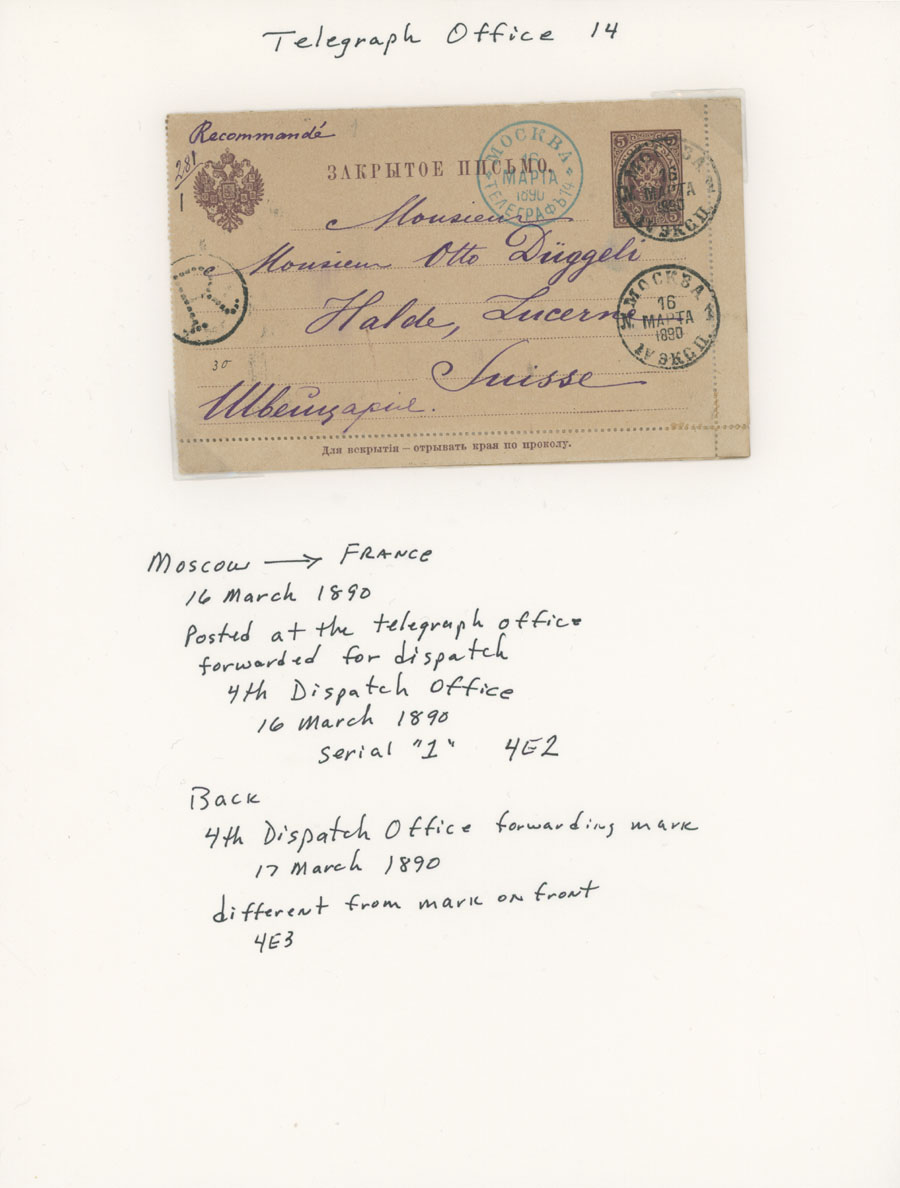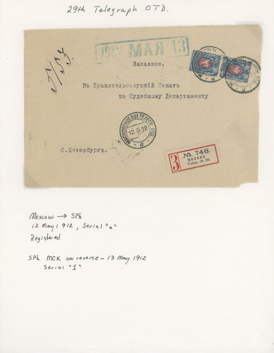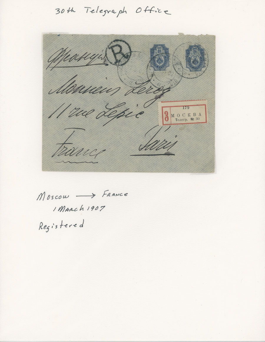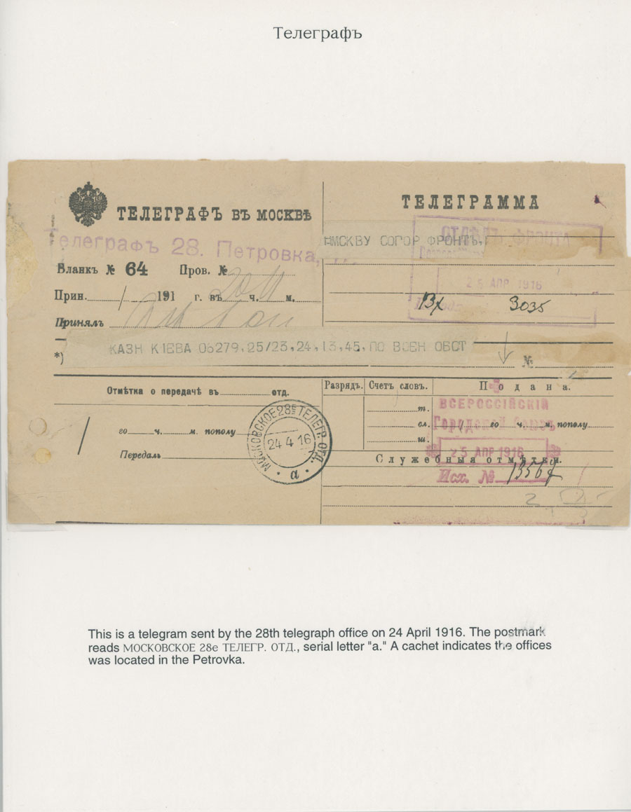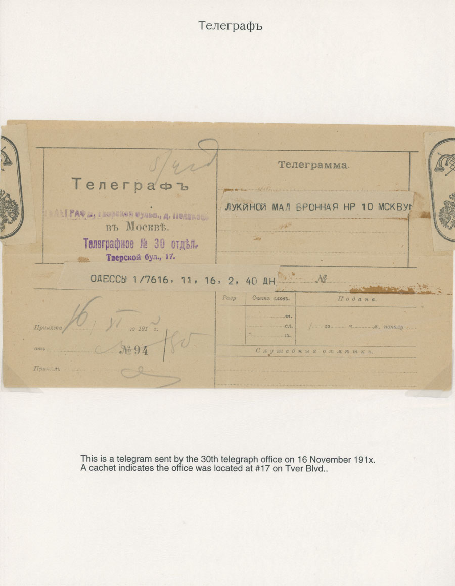 COLLECTION OF MOSCOW CITY TELEGRAPH OFFICES: 1886-1917, 54 postal history items representing 24 different telegraph offices from No.2 to No.64, including 9 stationery envelopes, letter cards and wrappers, 8 receipts and 10 telegrams, minor conveyance flaws possible, still nice looking unit, F/VF and rarely offered material, Est. $1,000-$1,200