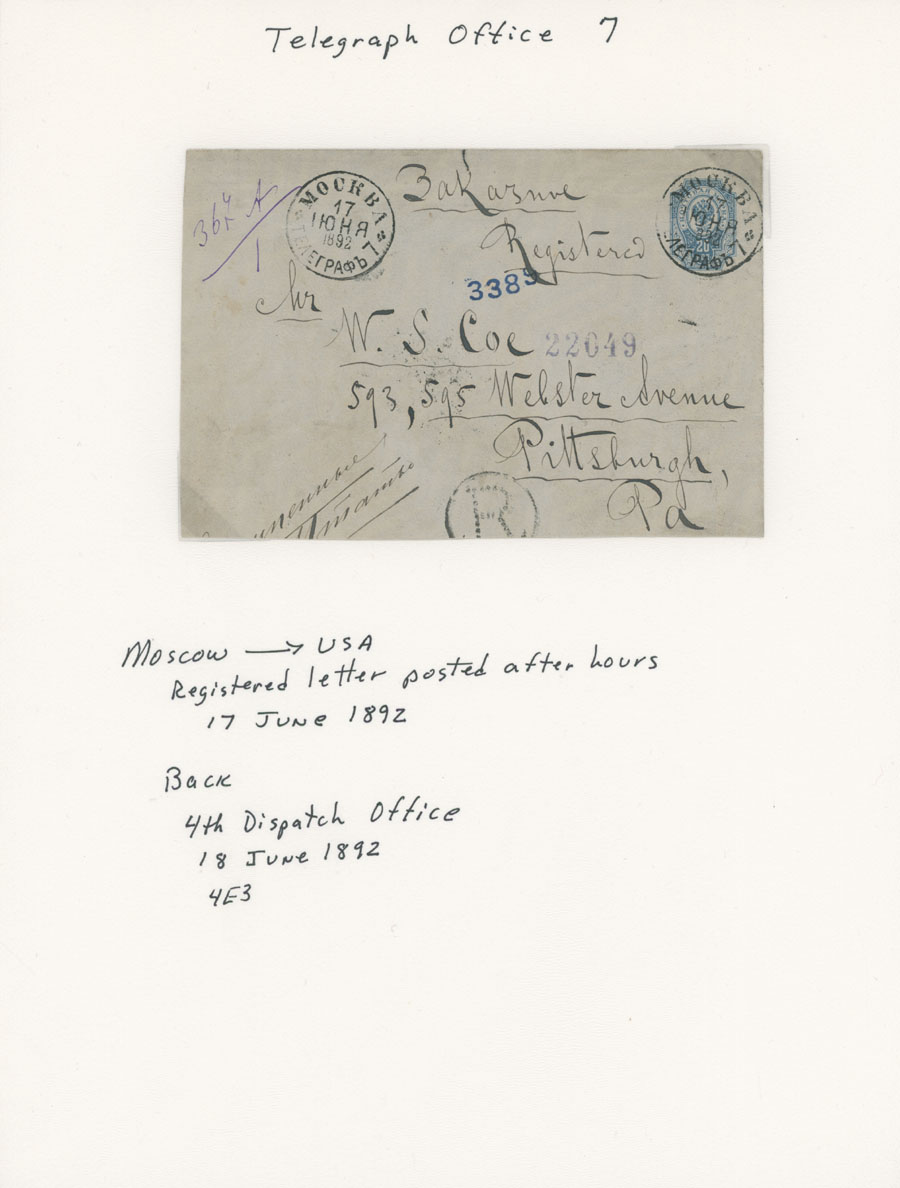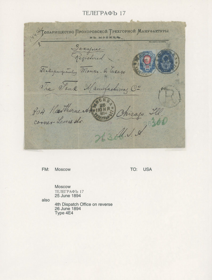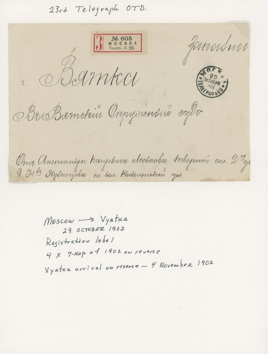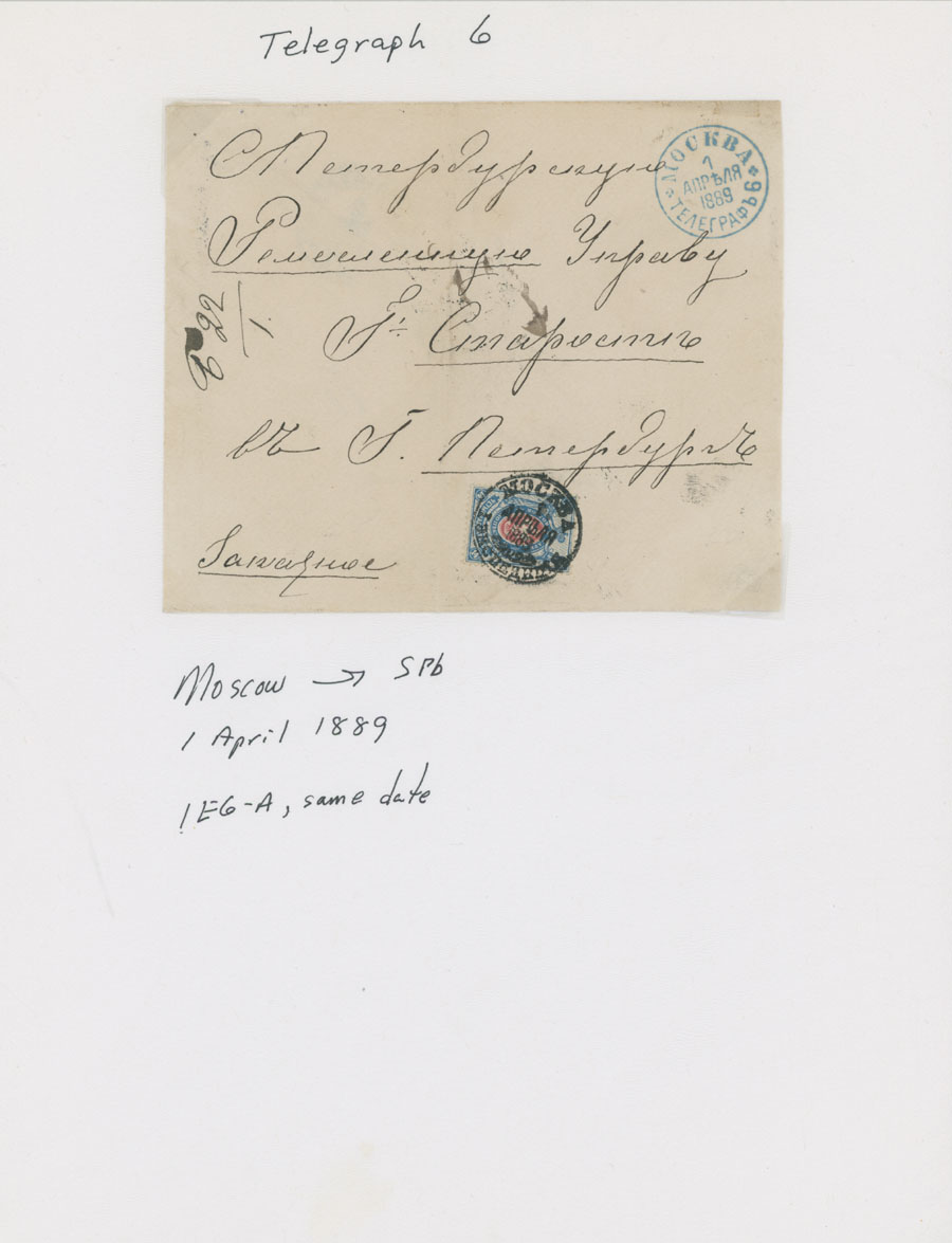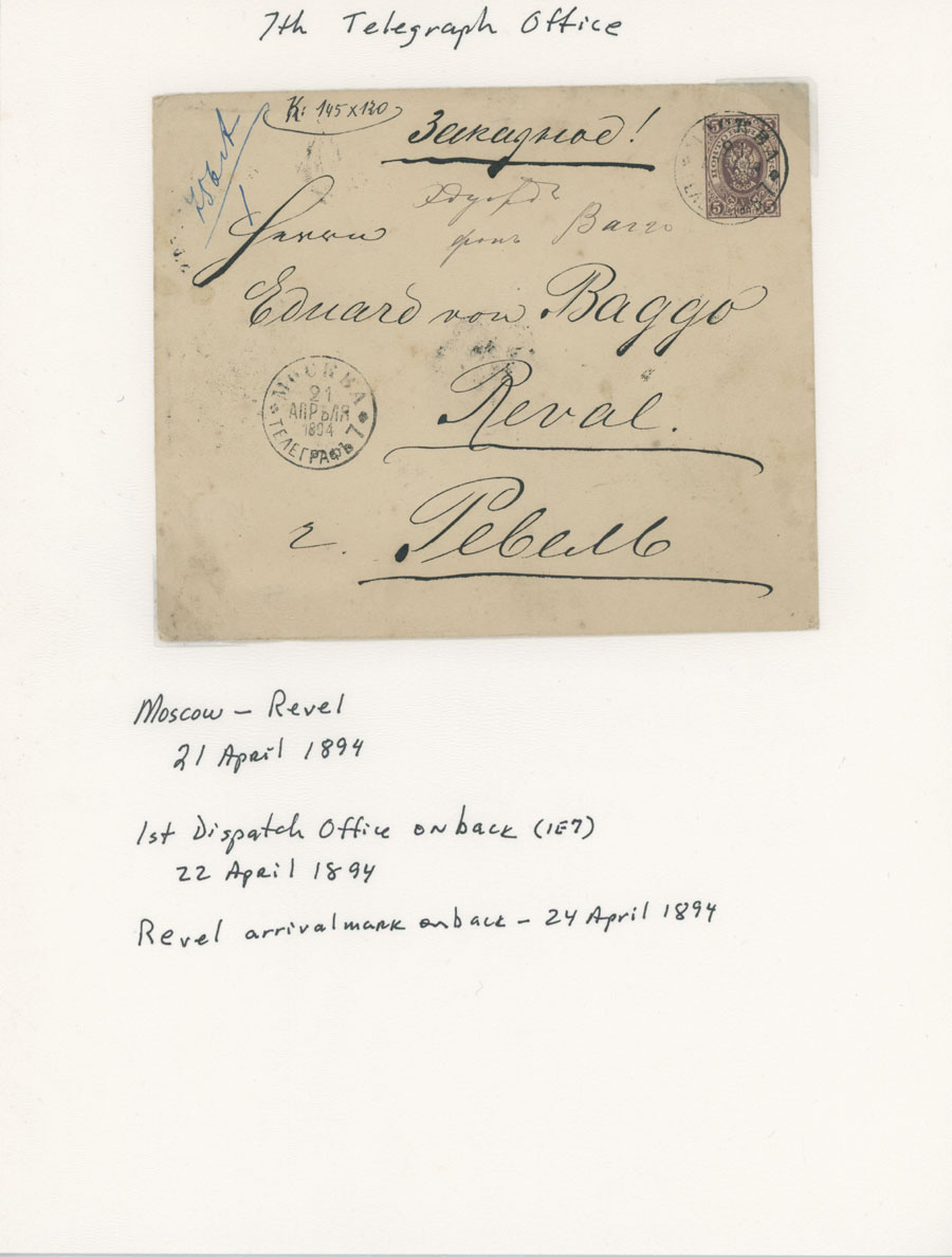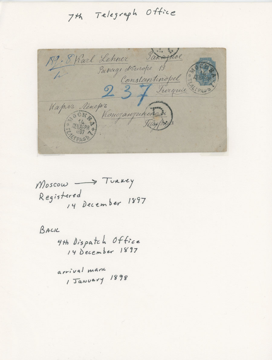 COLLECTION OF MOSCOW CITY TELEGRAPH OFFICES: 1886-1917, 54 postal history items representing 24 different telegraph offices from No.2 to No.64, including 9 stationery envelopes, letter cards and wrappers, 8 receipts and 10 telegrams, minor conveyance flaws possible, still nice looking unit, F/VF and rarely offered material, Est. $1,000-$1,200