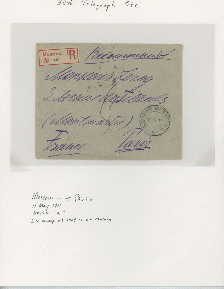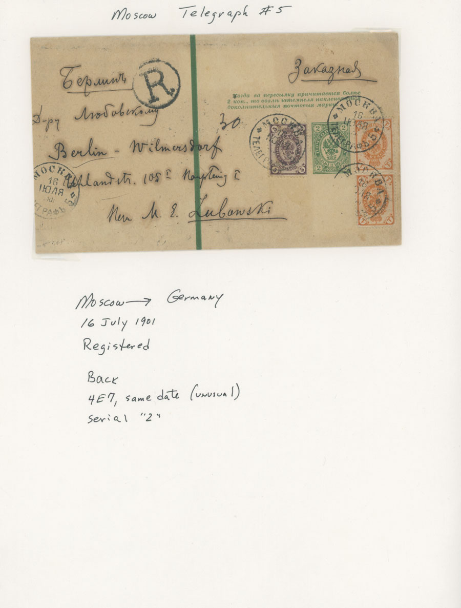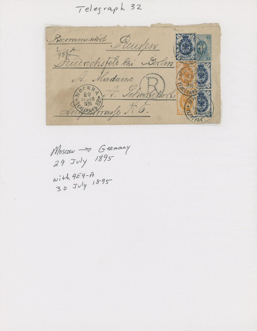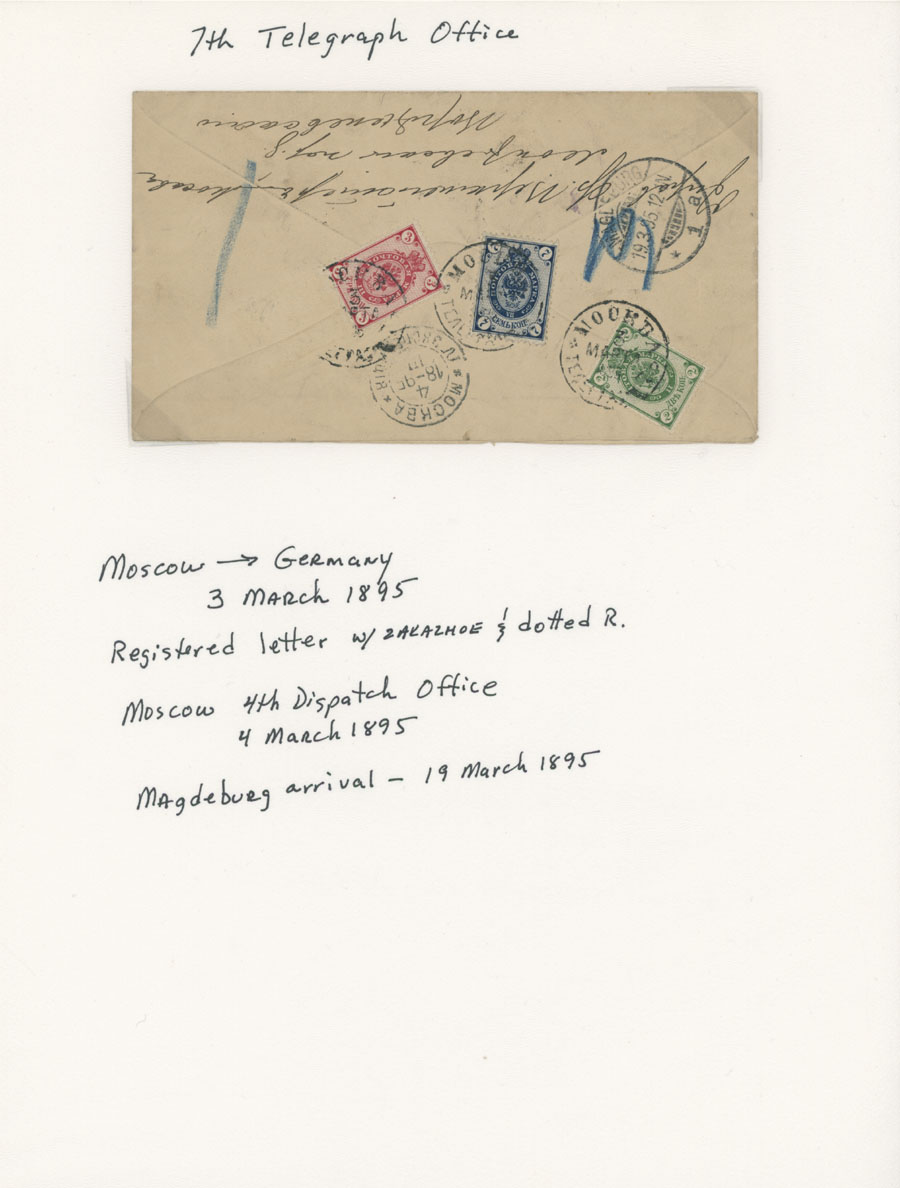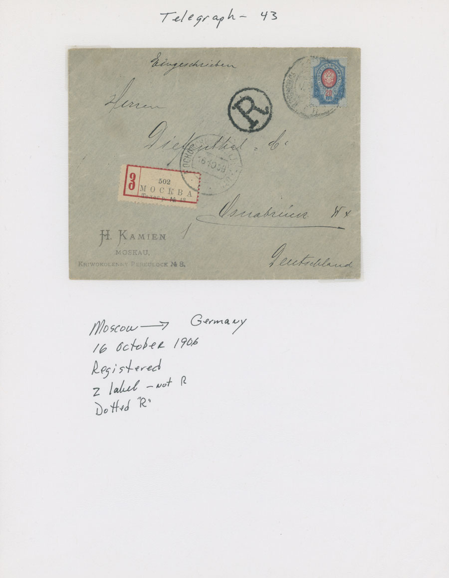 COLLECTION OF MOSCOW CITY TELEGRAPH OFFICES: 1886-1917, 54 postal history items representing 24 different telegraph offices from No.2 to No.64, including 9 stationery envelopes, letter cards and wrappers, 8 receipts and 10 telegrams, minor conveyance flaws possible, still nice looking unit, F/VF and rarely offered material, Est. $1,000-$1,200