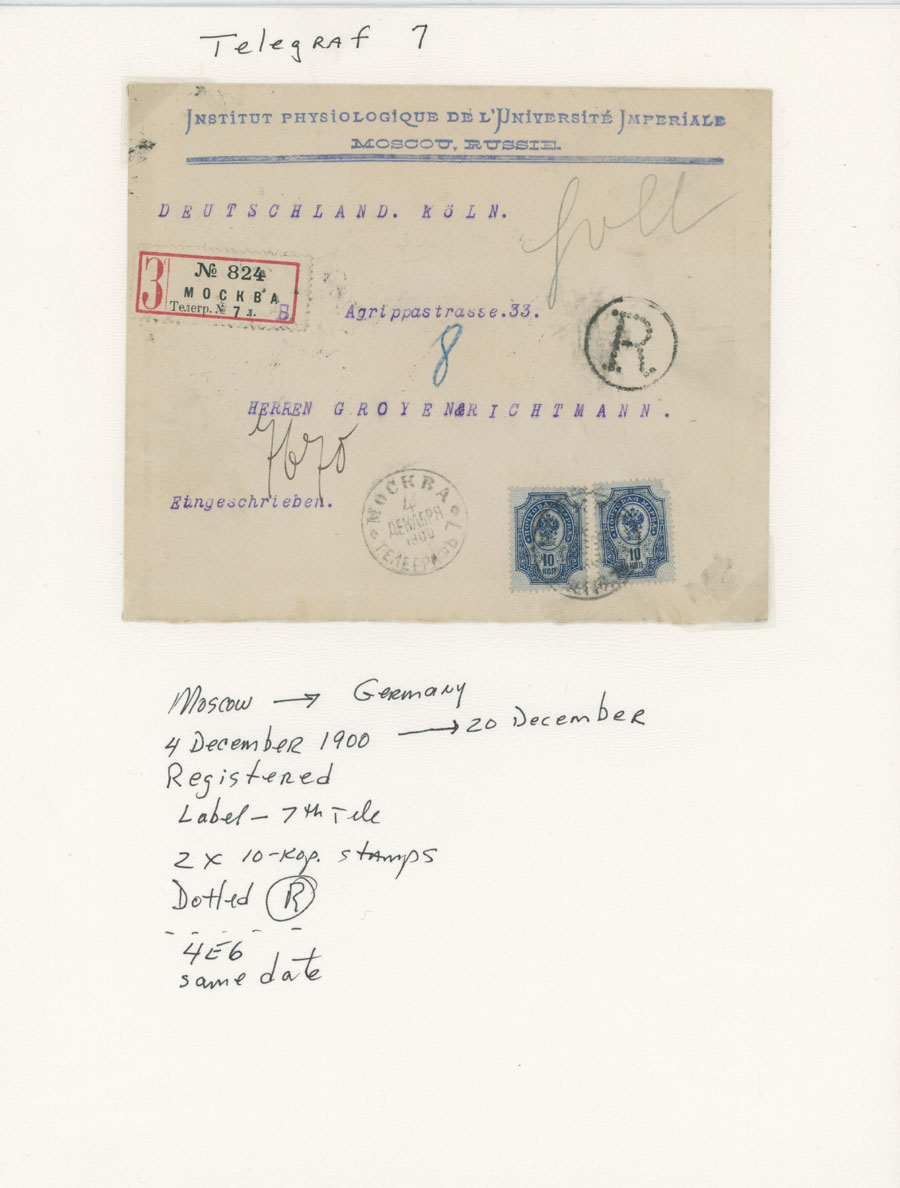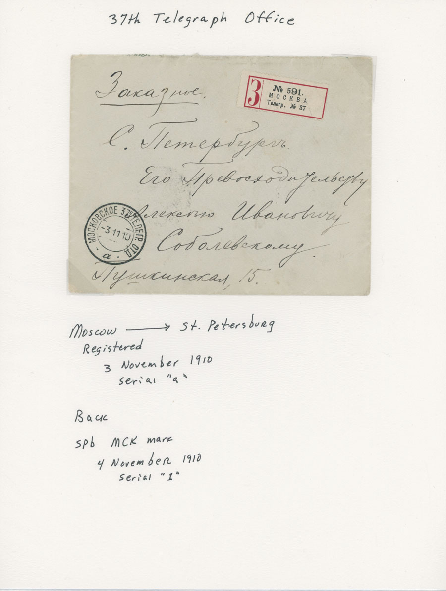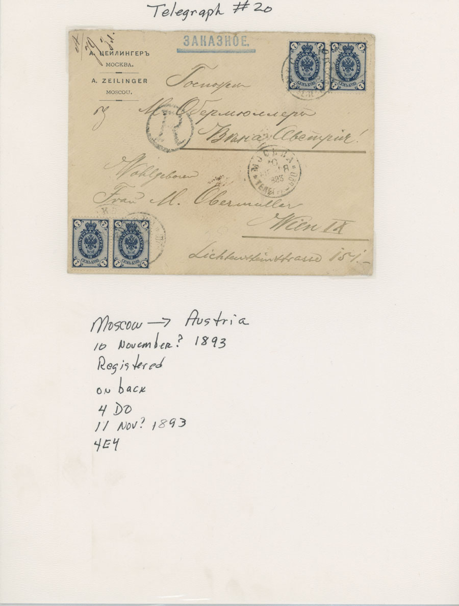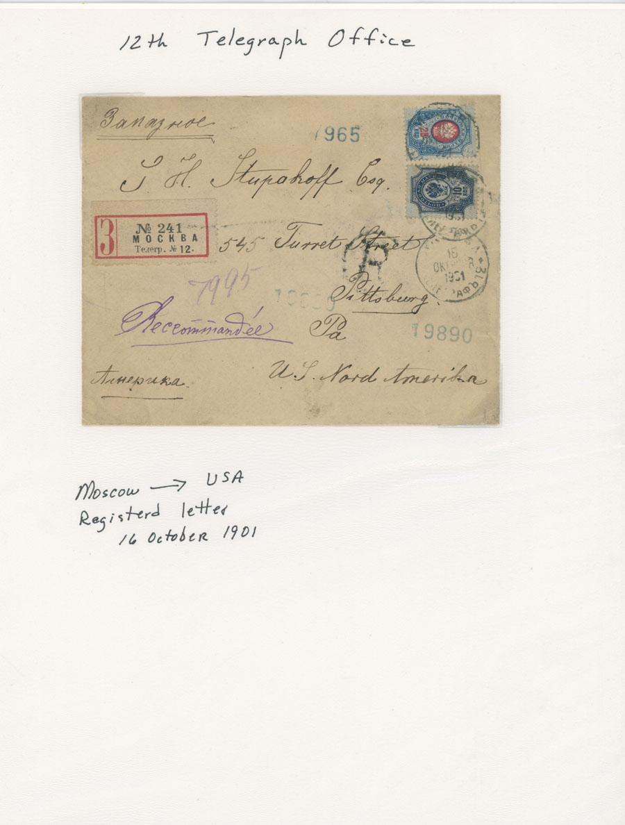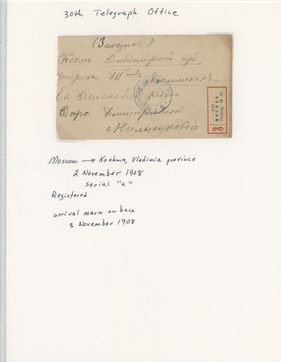 COLLECTION OF MOSCOW CITY TELEGRAPH OFFICES: 1886-1917, 54 postal history items representing 24 different telegraph offices from No.2 to No.64, including 9 stationery envelopes, letter cards and wrappers, 8 receipts and 10 telegrams, minor conveyance flaws possible, still nice looking unit, F/VF and rarely offered material, Est. $1,000-$1,200