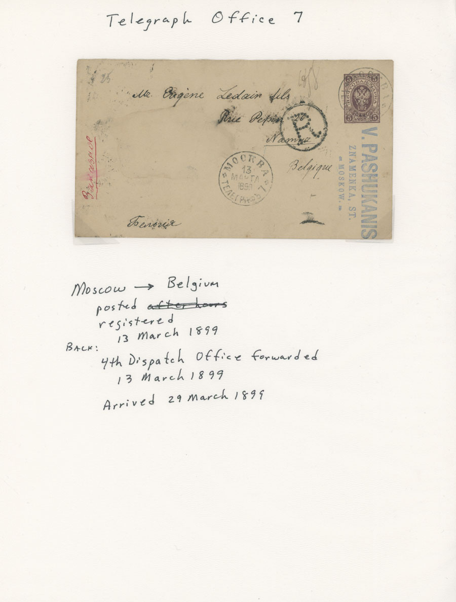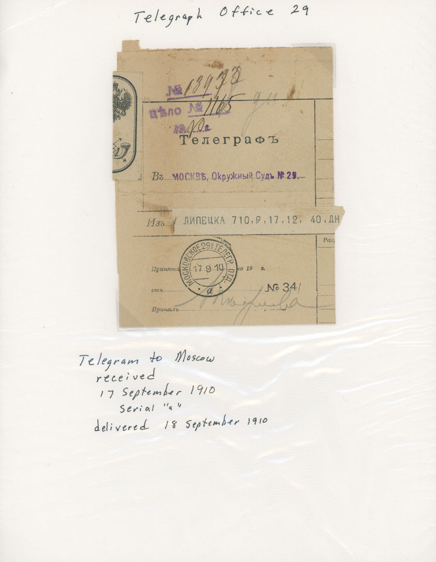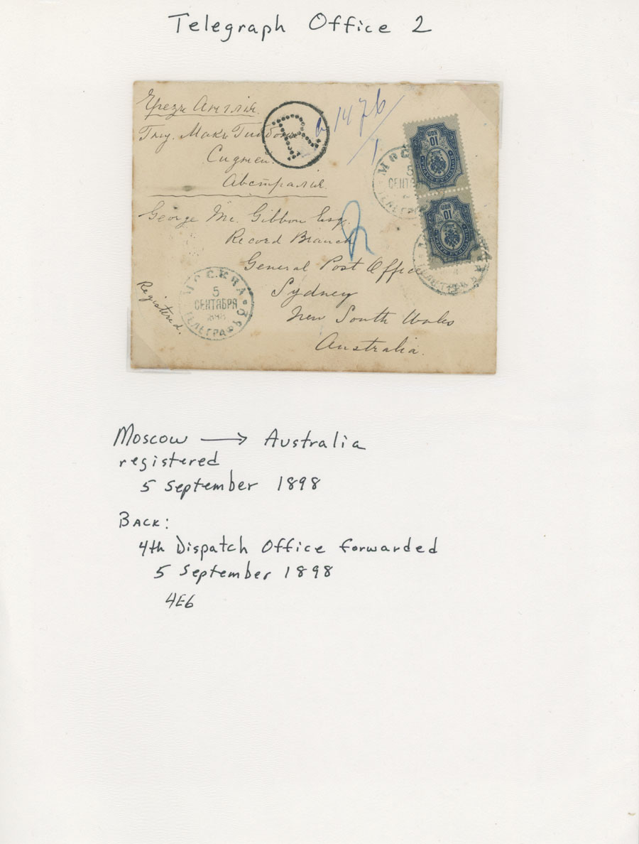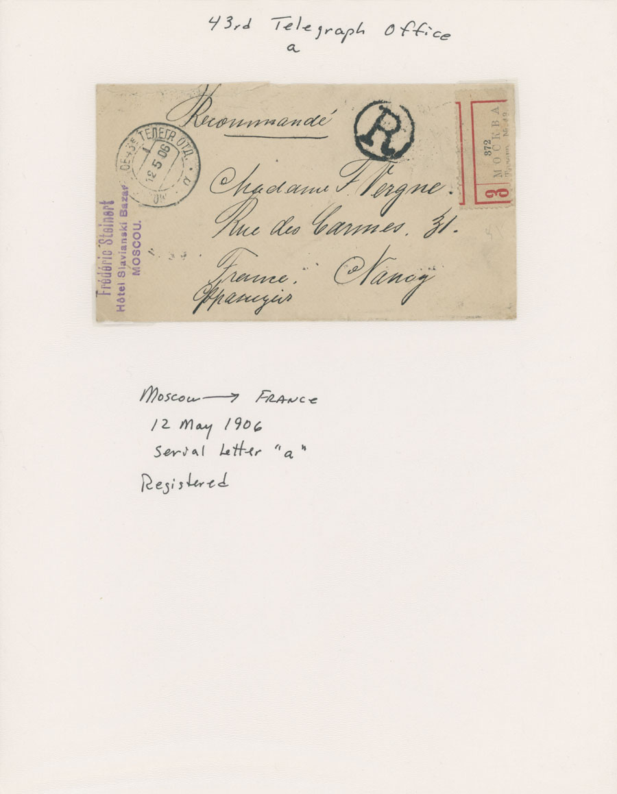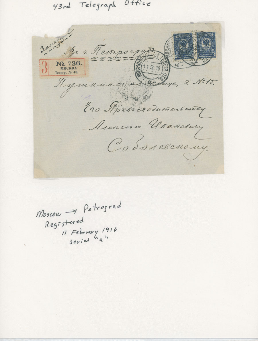 COLLECTION OF MOSCOW CITY TELEGRAPH OFFICES: 1886-1917, 54 postal history items representing 24 different telegraph offices from No.2 to No.64, including 9 stationery envelopes, letter cards and wrappers, 8 receipts and 10 telegrams, minor conveyance flaws possible, still nice looking unit, F/VF and rarely offered material, Est. $1,000-$1,200